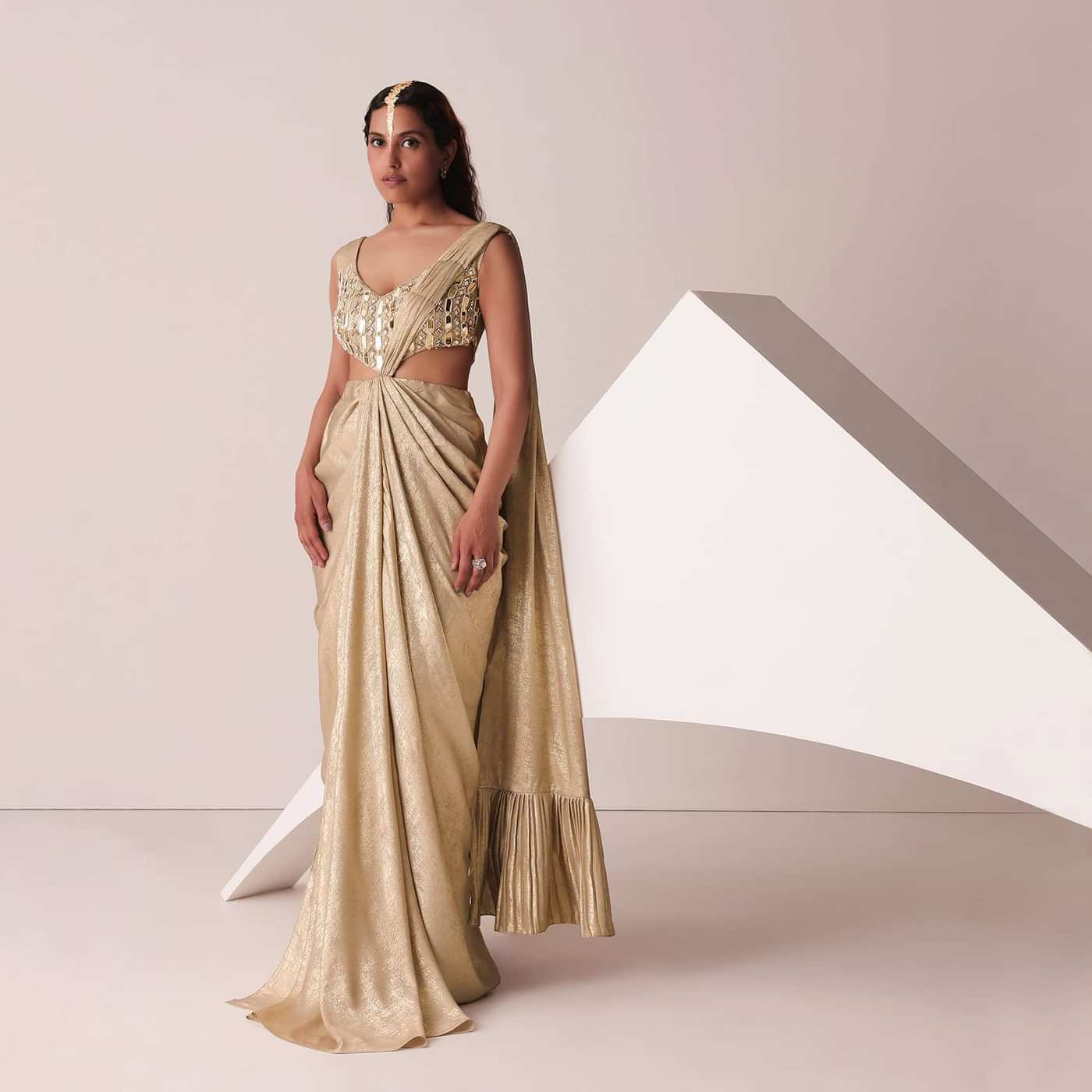 Embrace the futuristic look of this gown by pairing it with metallic accessories and sleek hairstyles. Consider wearing silver or gold statement earrings and a bold cuff bracelet to enhance the shimmering effect of the embroidery on the bodice. A sleek low bun or a high ponytail would also complement the modern vibe of this gown. Make the most of the waist slits and pleated frill drape of the saree gown by showcasing your favorite pair of strappy high heels. You could also choose shoes in a contrasting color to add a pop of color to your look.