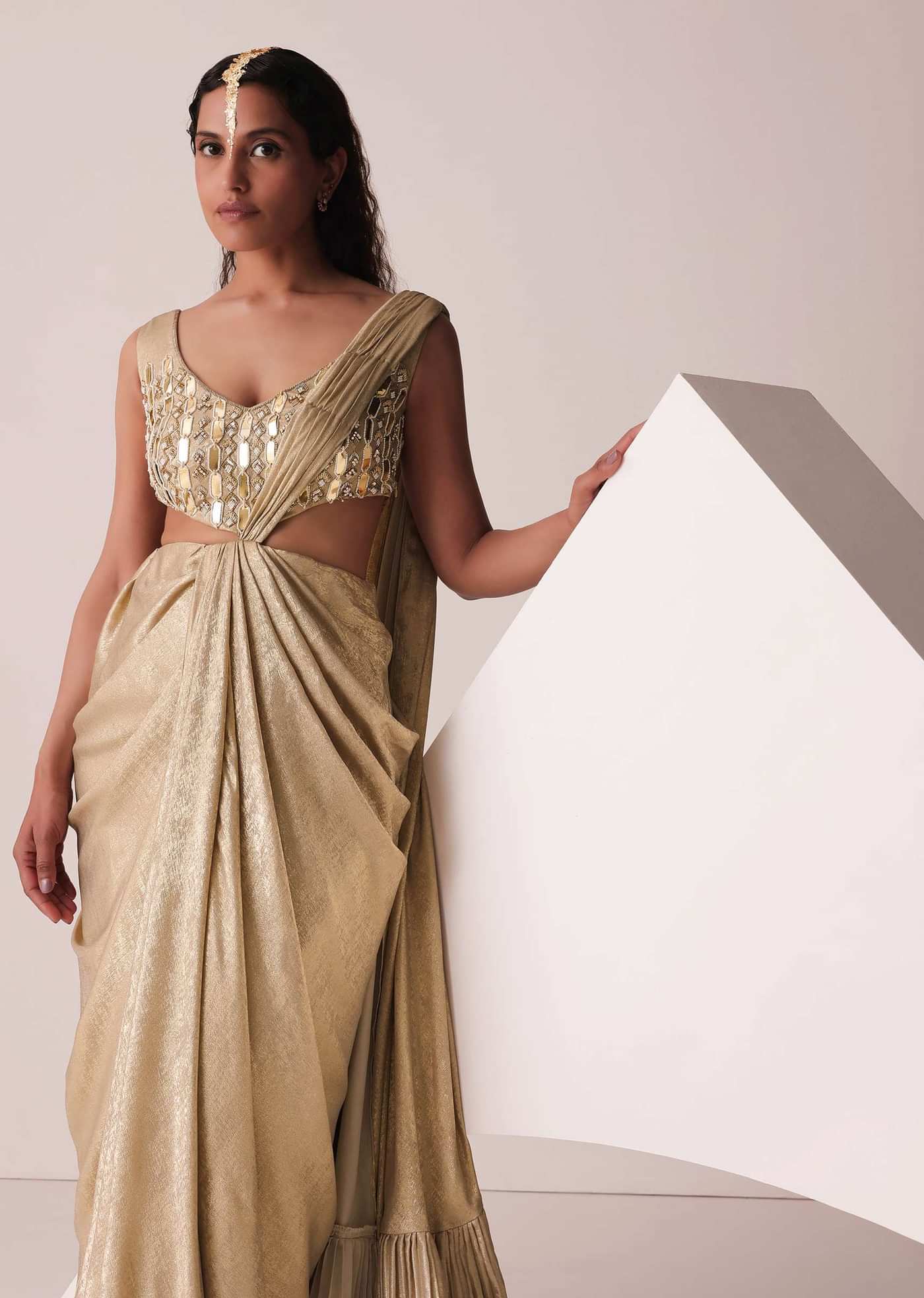 Golden Ready-To-Wear Embroidered Saree Gown In Gold Foil Fabric