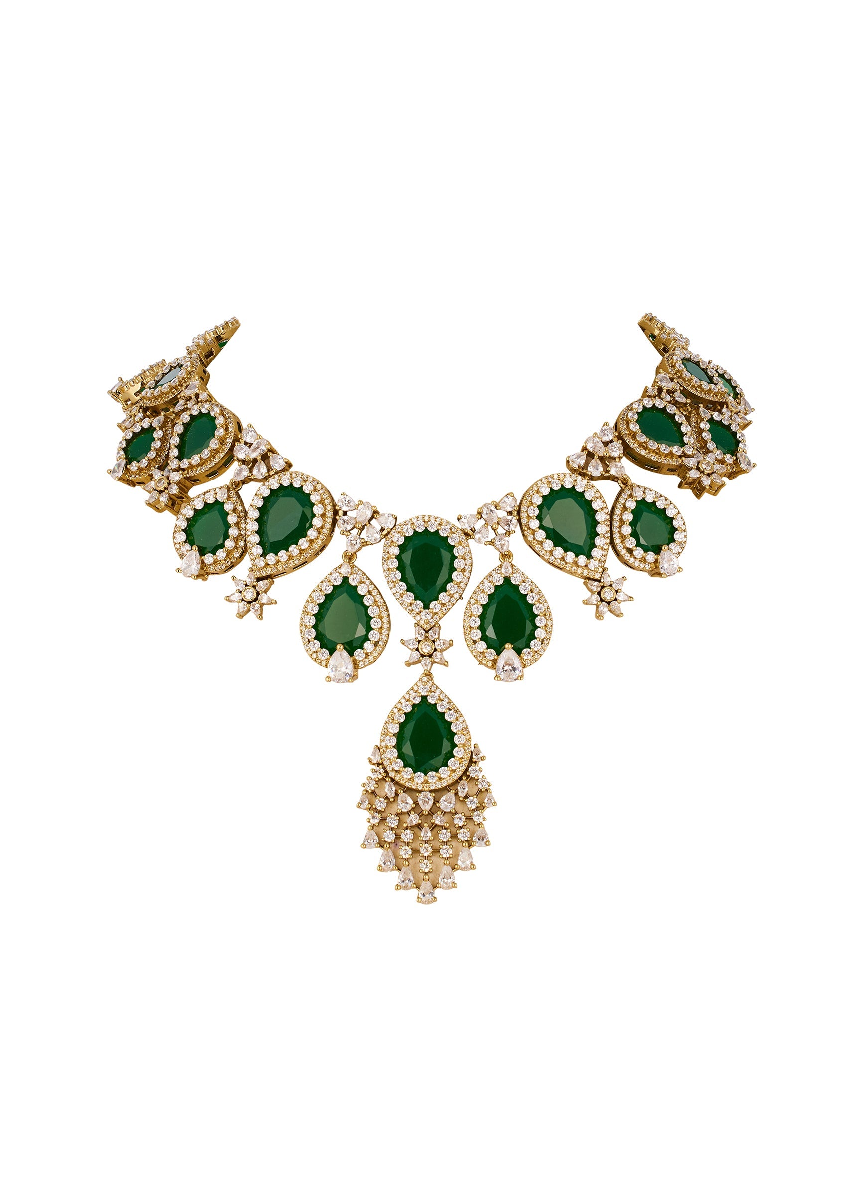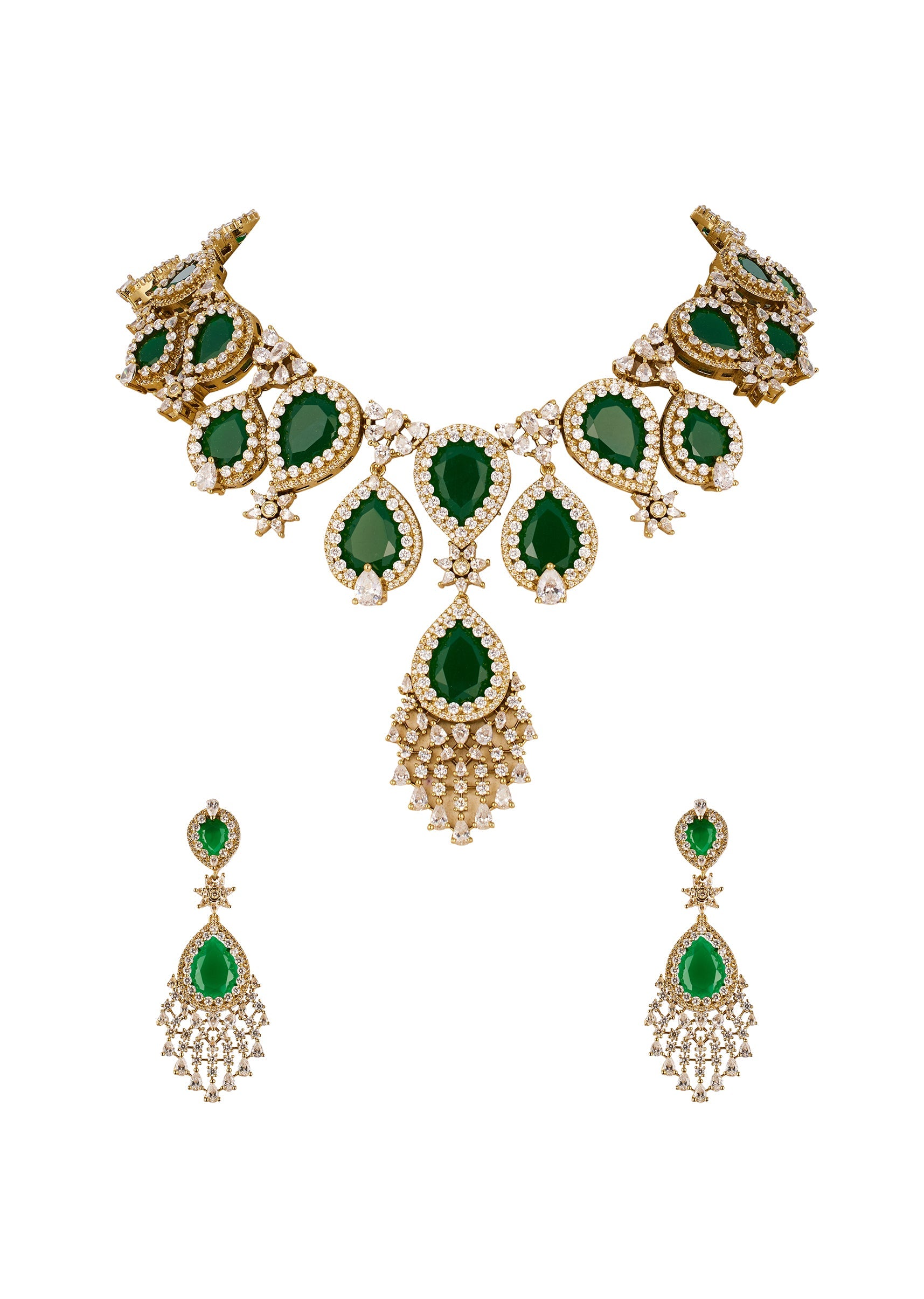 Green and Gold Anti Tarnish Finish CZ Diamond Necklace Set in Rhodium Plated Brass