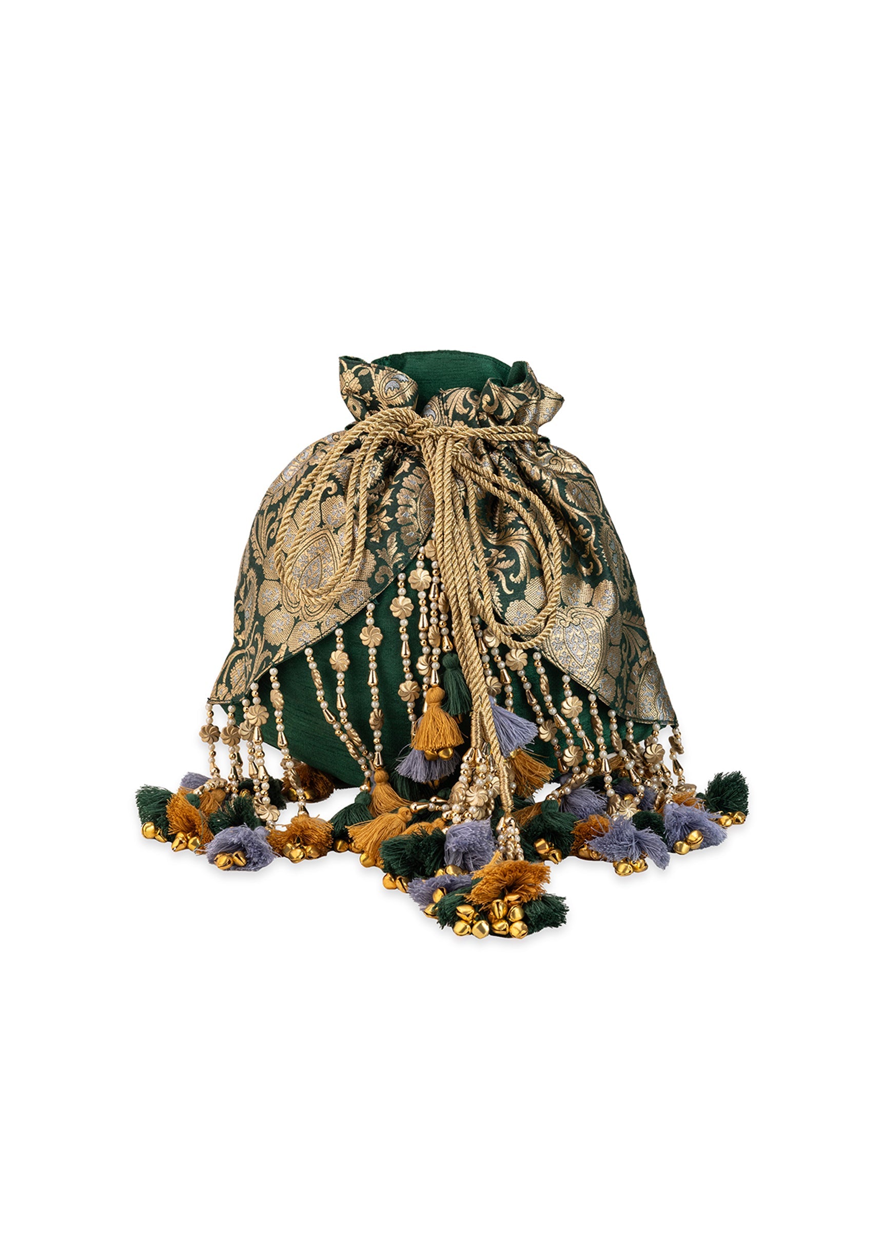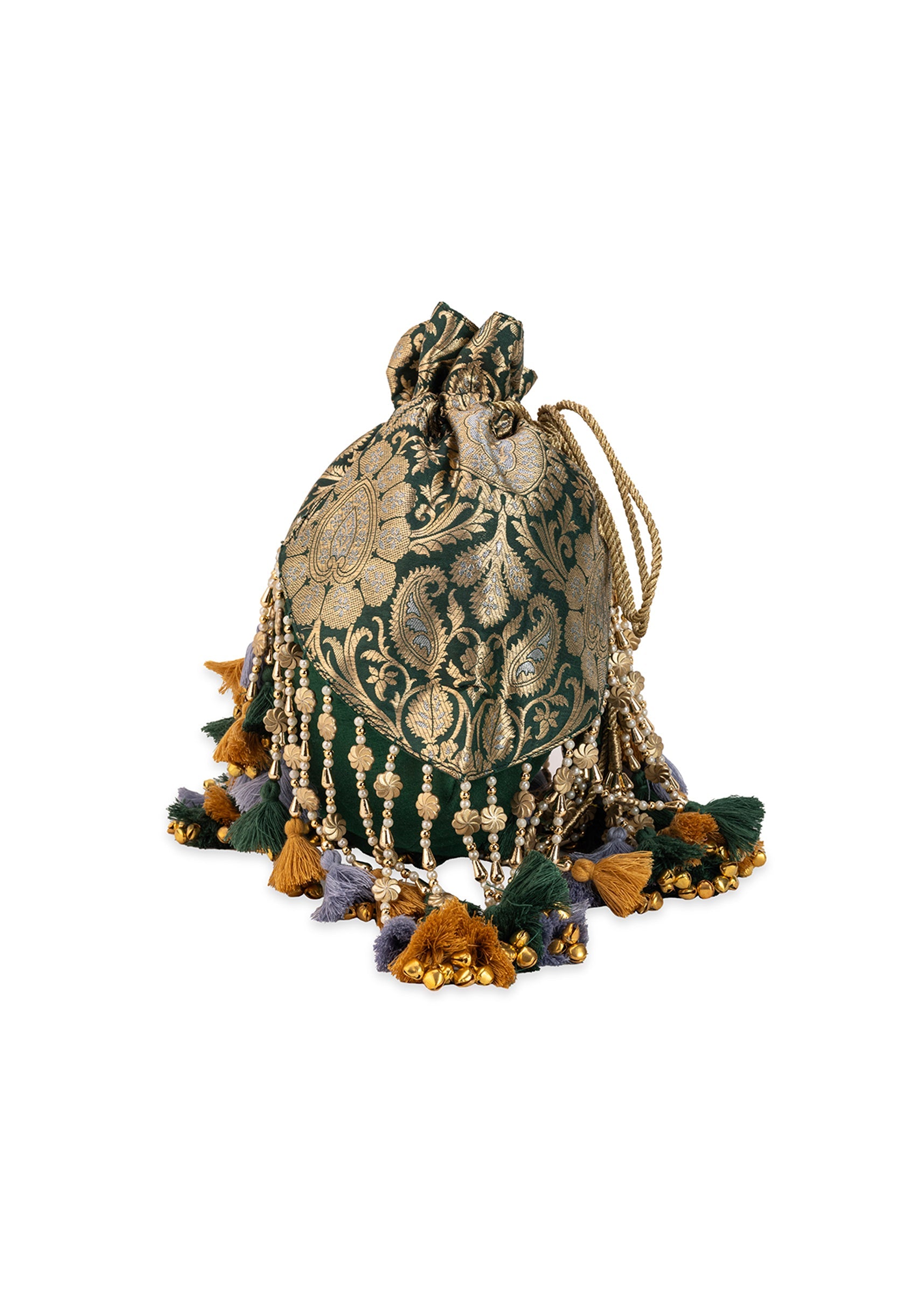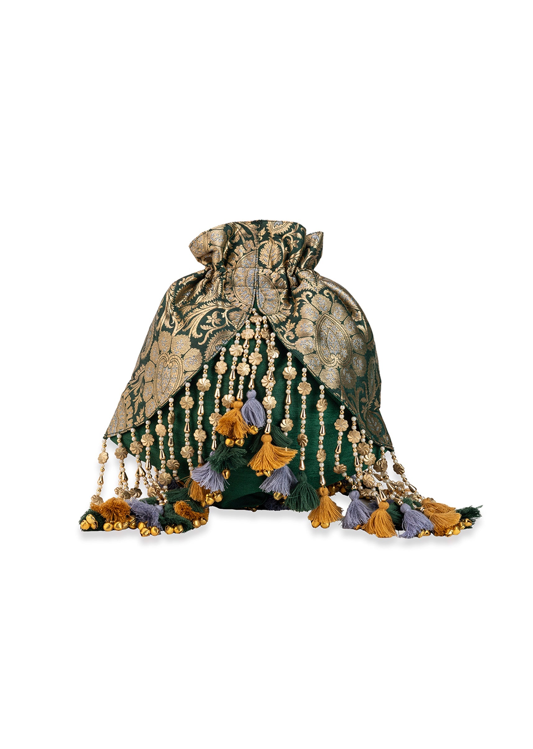 Green and Gold Embellished Tassel Potli Bag