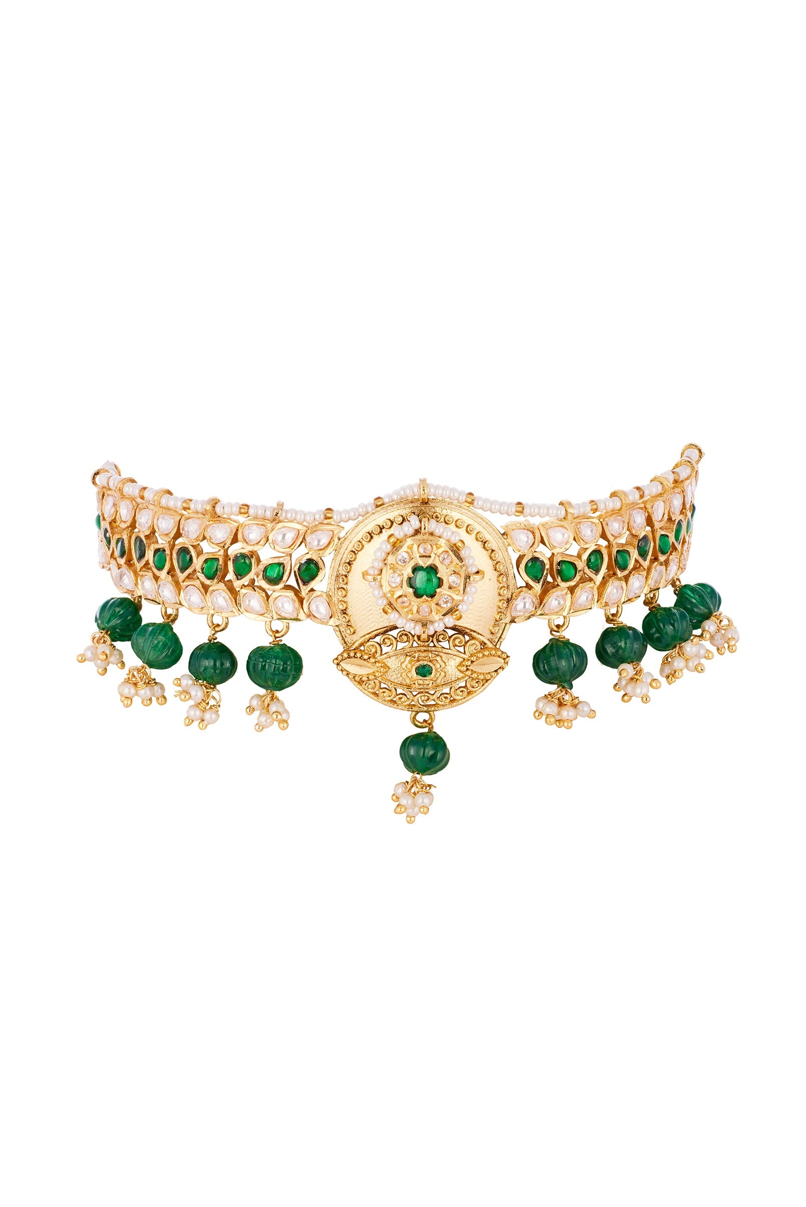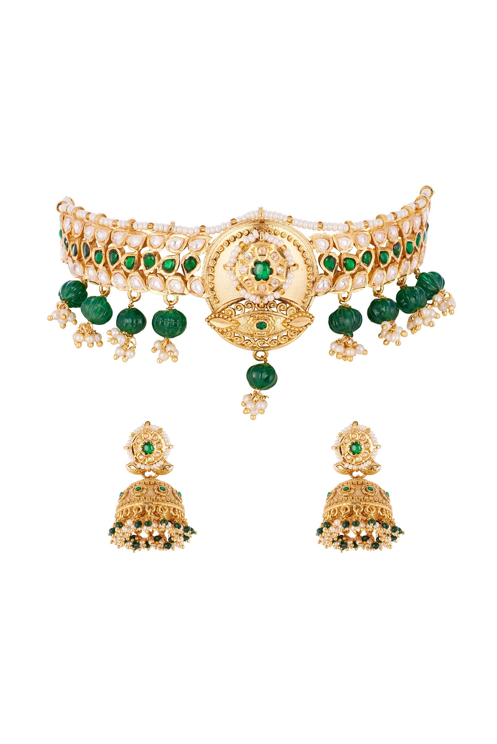 A timeless green and gold necklace set crafted with Kundan Polki uncut diamonds in the traditional Kundan Jadau technique. Accented with delicate green and pearl drops, this handcrafted Indian jewelry... More Product Details