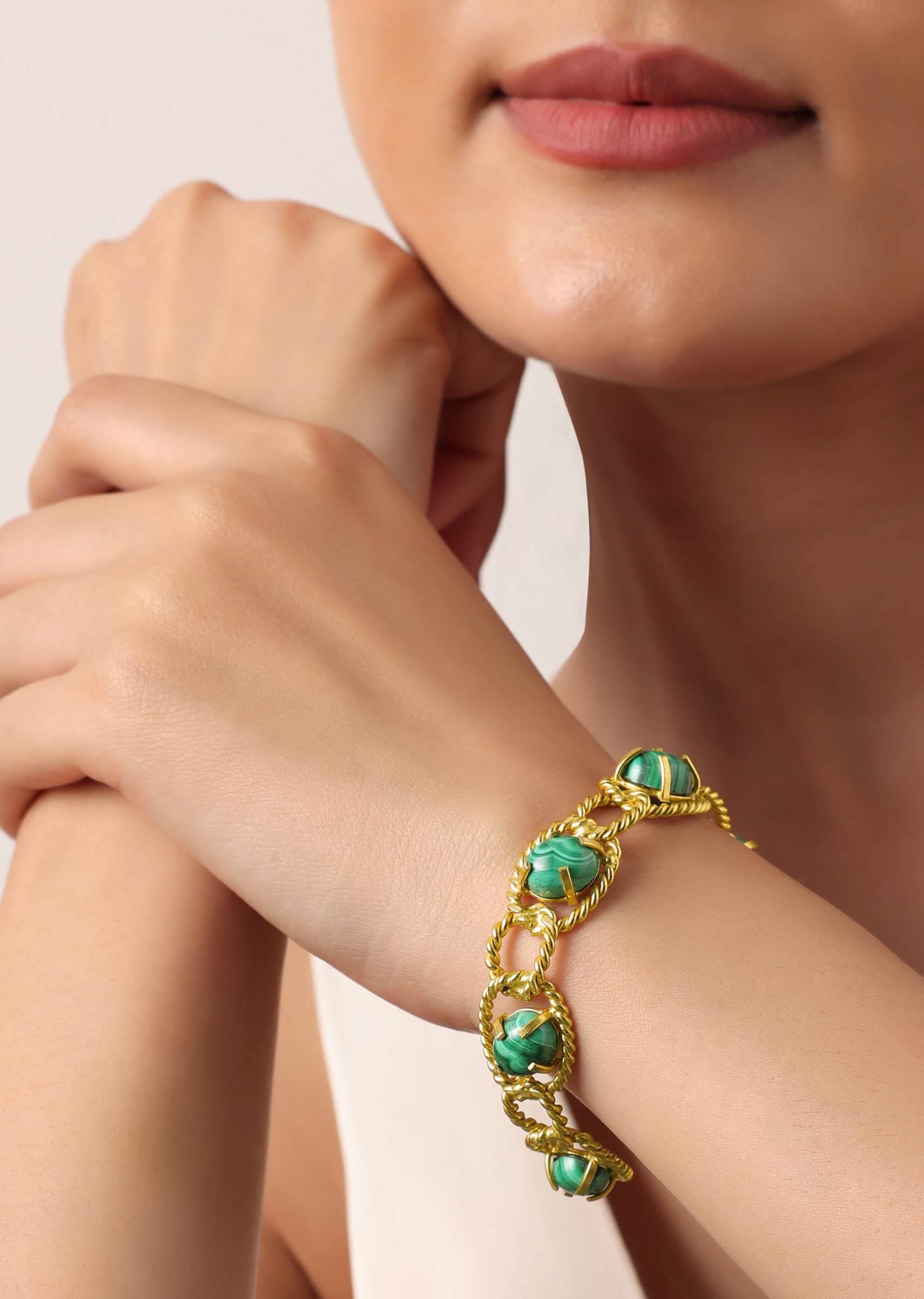 This statement-making kada style bracelet promises to gain you a ton of attention. Constructed from mix metal, it is designed on a gold plated base. Showcasing a stylish design, it is embellished with green beads. Elevated with a textured finish, adorn this beauty for a charming look. Avoid contact with water, chemicals, harsh liquids, perfumes, etc. Do not wear this piece of jewelry while showering, gymming, swimming, etc. Please keep the product away from moisture and humidity when not in use. Slight variations in design may vary. Being rewarded as the most trusted brand, our customers believe we deliver the same styles as promised on the website. Awarded as the Most Trusted Brand, we're delivering styles you love, just as promised.