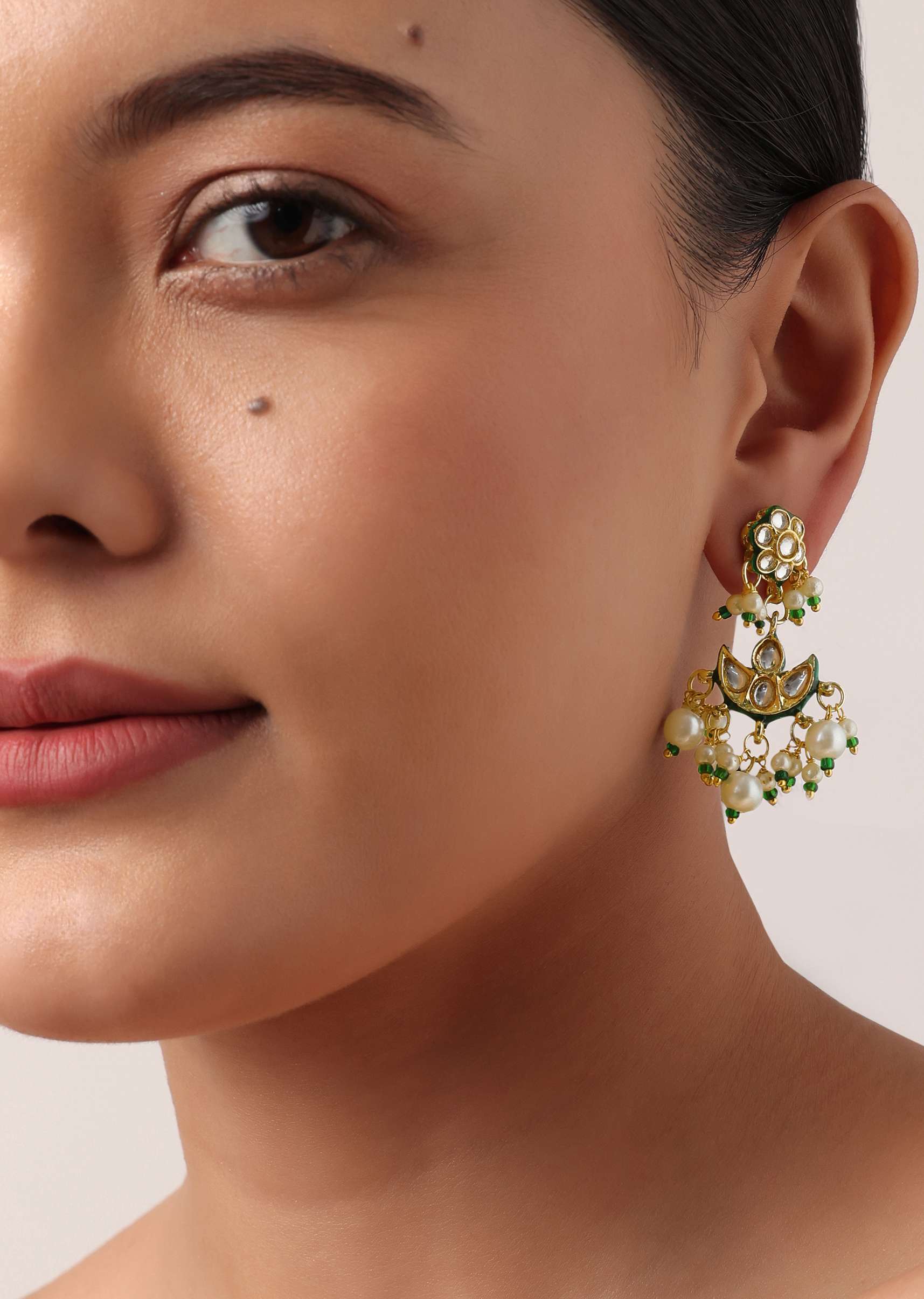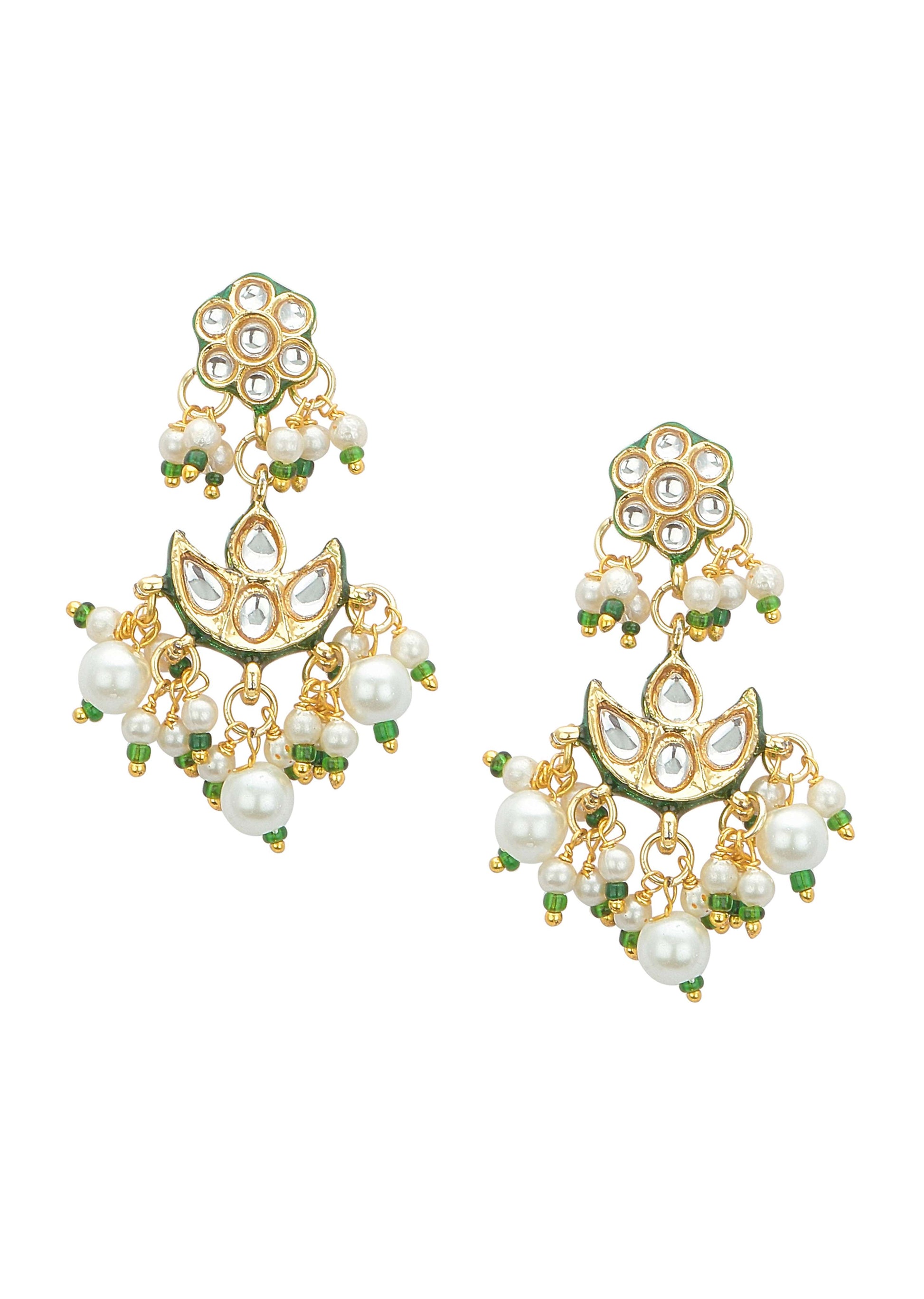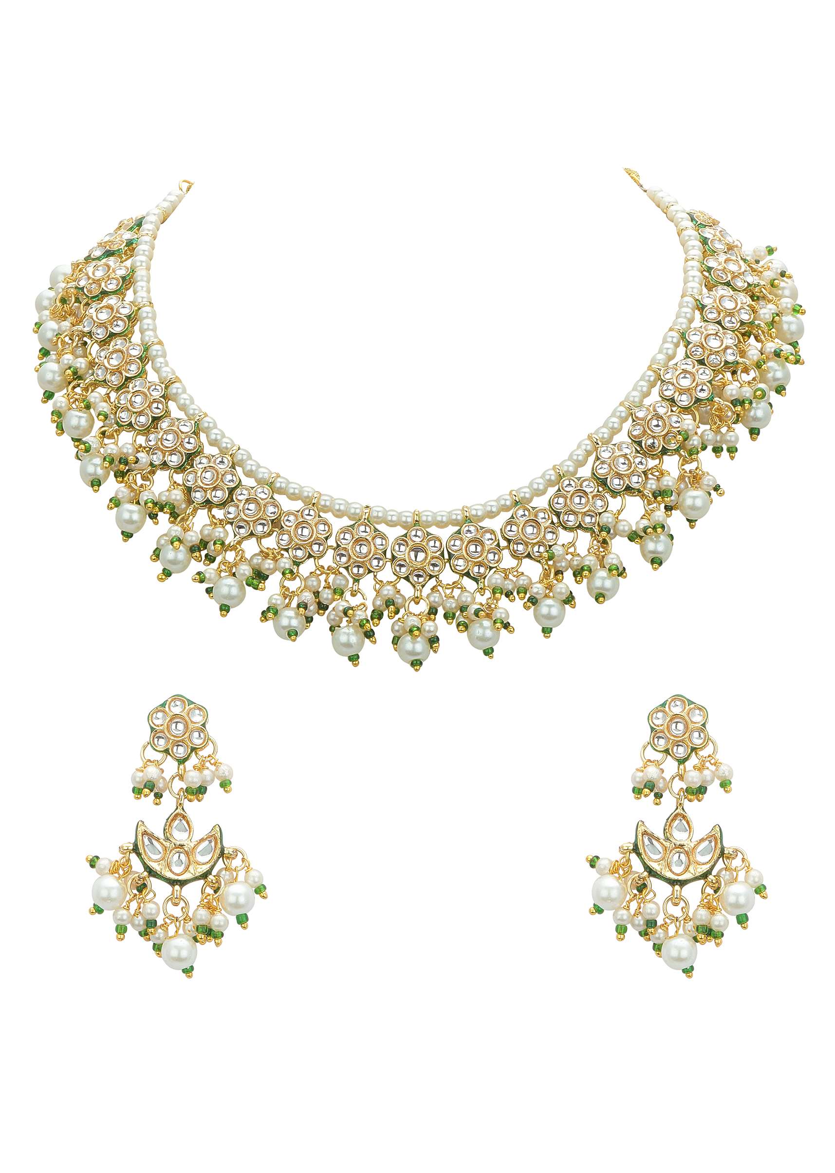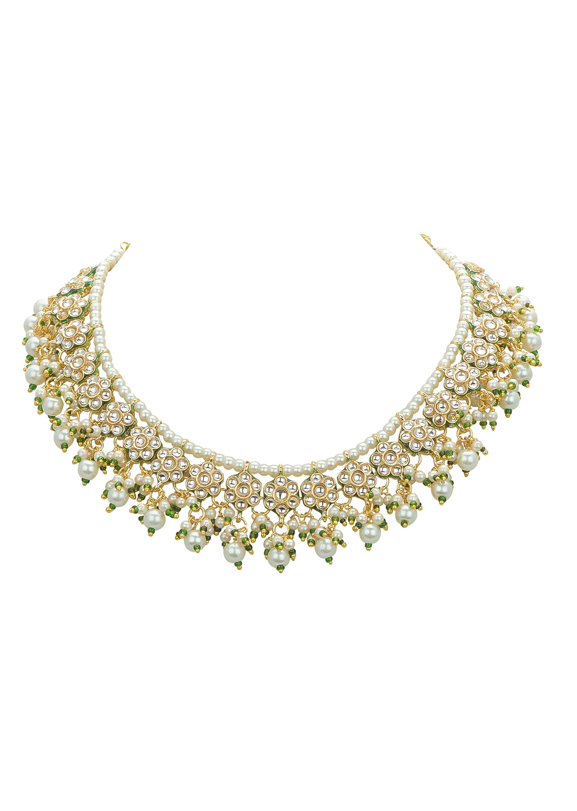 Make heads turn at the next wedding celebration by adorning this timeless short necklace set. Framed in mix metal, it is set on a gold finish base. Beautifully designed with crescent moon and floral motifs, it is embellished with delicately cut kundan stones and glistening cluster beads. Avoid contact with water, chemicals, harsh liquids, perfumes, etc. Do not wear this piece of jewelry while showering, gymming, swimming, etc. Please keep the product away from moisture and humidity when not in use. Slight variations in design may vary. Being rewarded as the most trusted brand, our customers believe we deliver the same styles as promised on the website. Awarded as the Most Trusted Brand, we're delivering styles you love, just as promised.