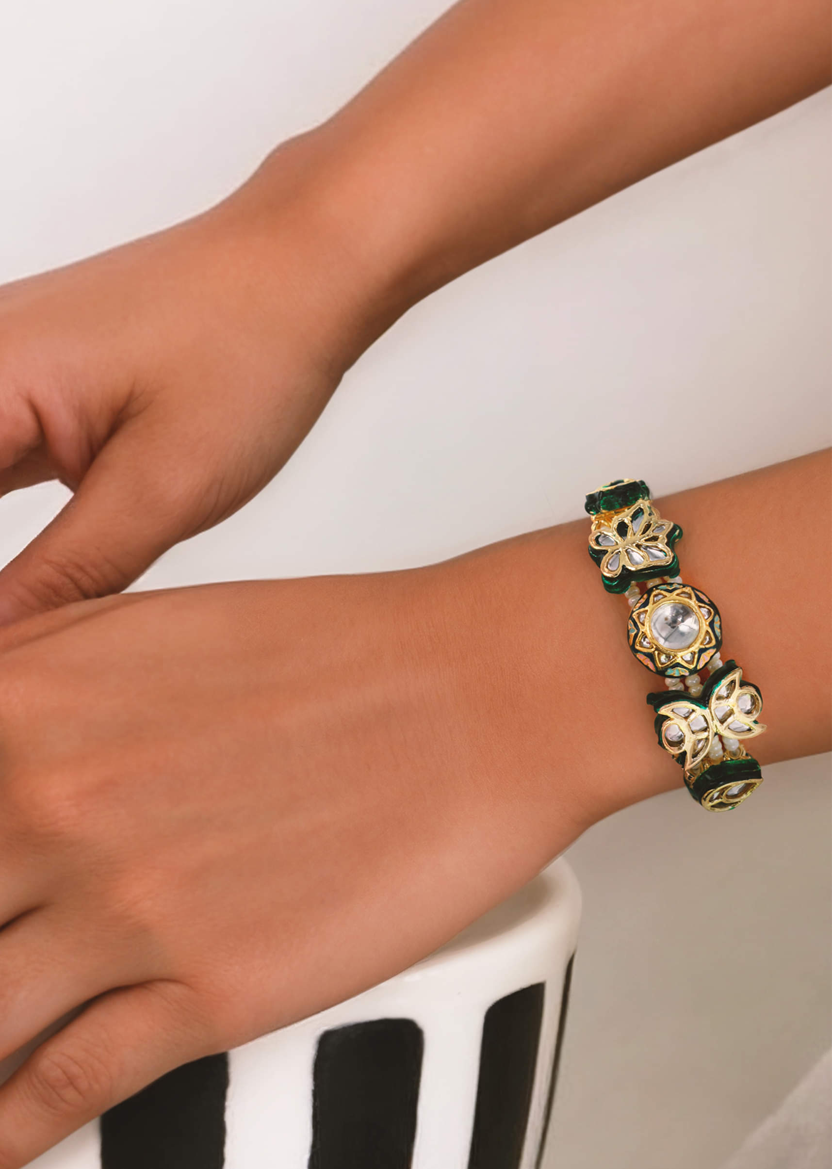 A green and gold stone-encrusted bracelet featuring intricate detailing and sparkling stones, exuding elegance and charm. Perfect for elevating bridal, festive, or traditional ethnic ensembles. Awarded as the Most Trusted Brand, we're delivering styles you love, just as promised.