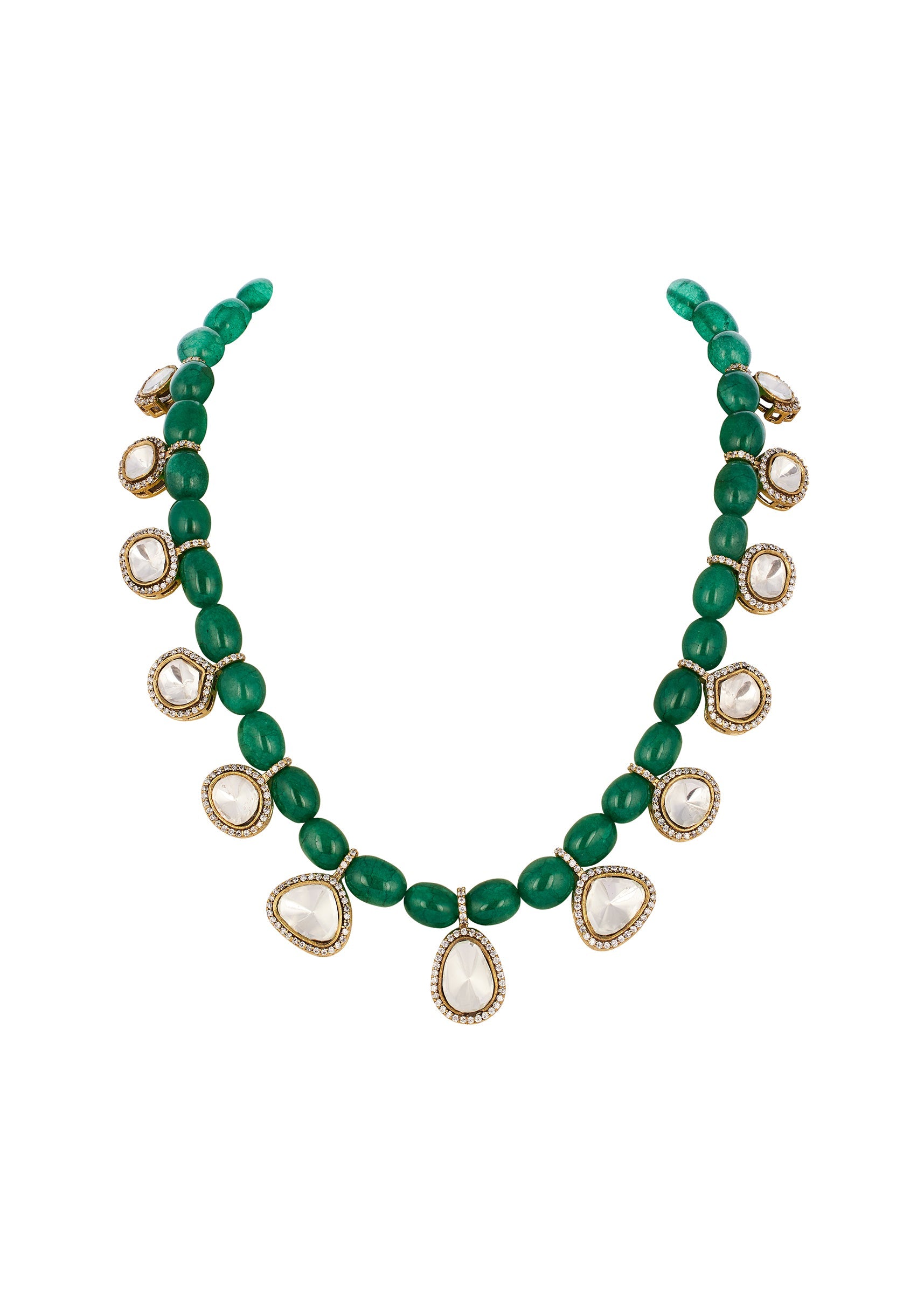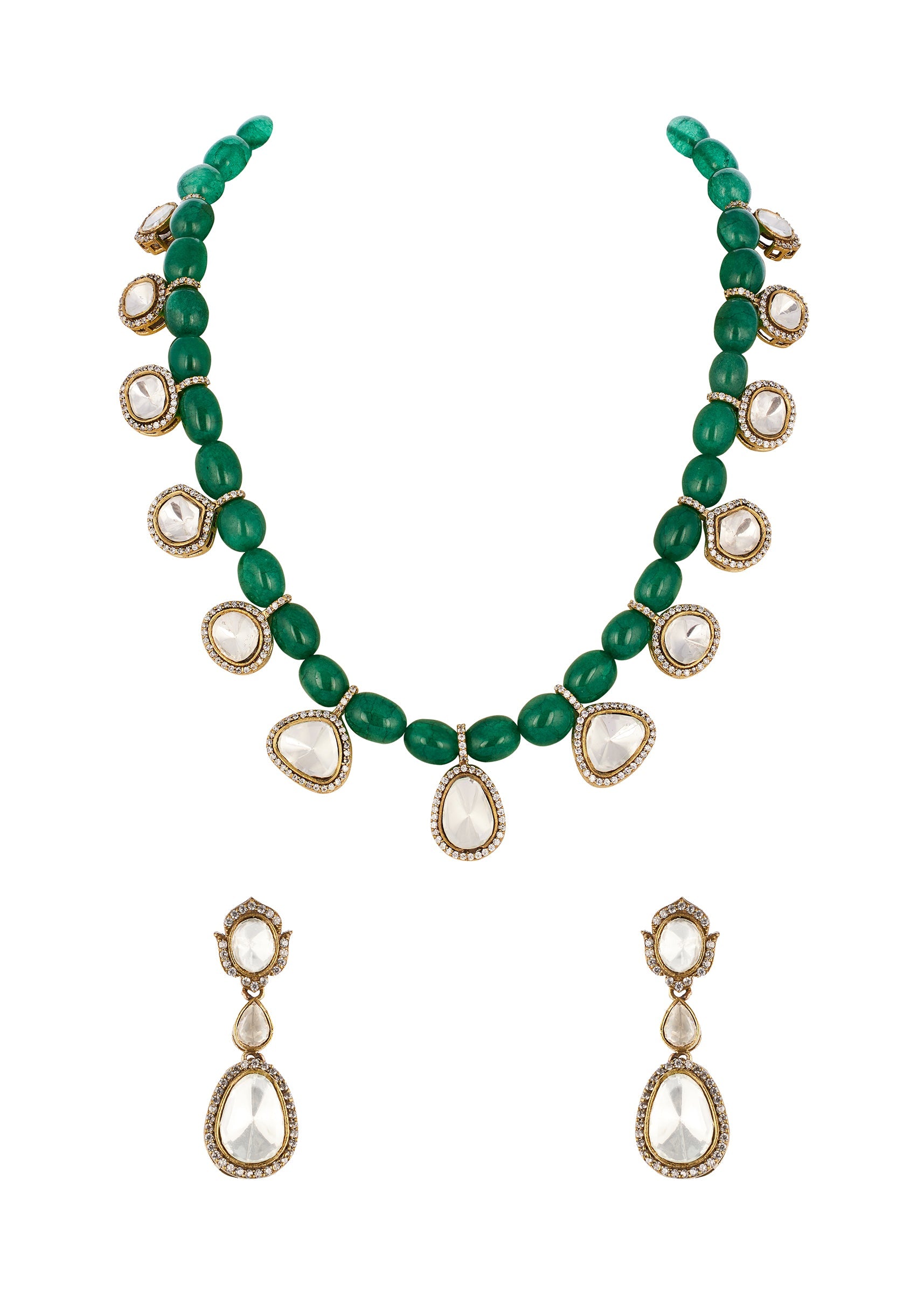 Green and Gold Traditional Gold Mordern Polki Necklace Set with Beads