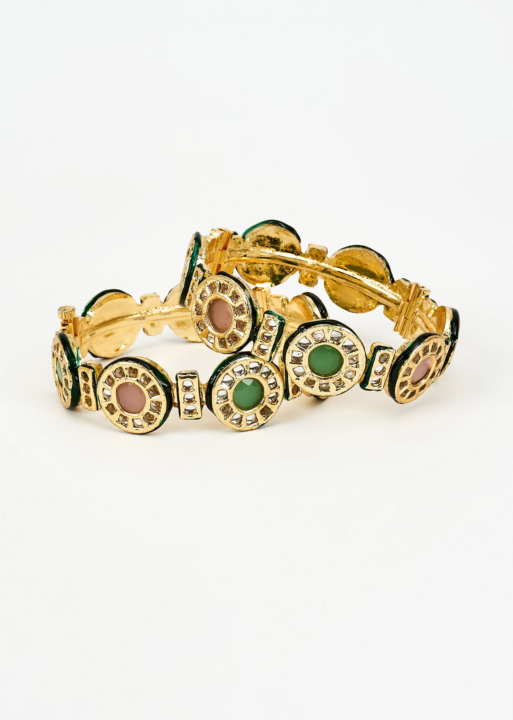 Green And Pink Gemstones With Gold Plated Multicolored Kundan Polki Bangles