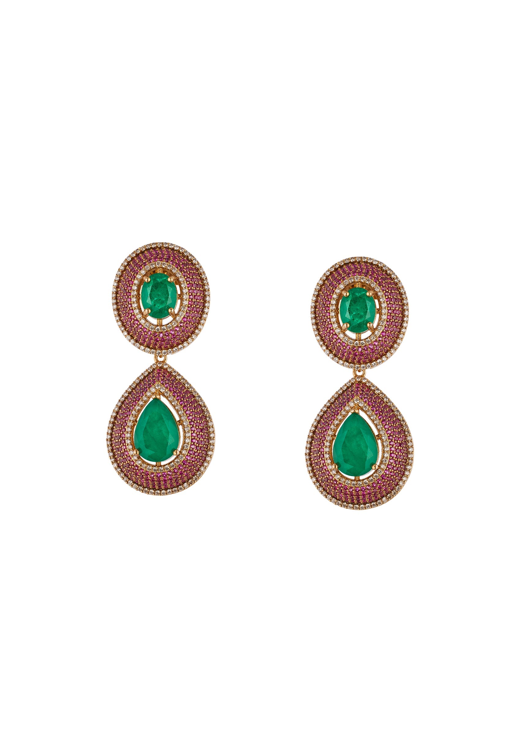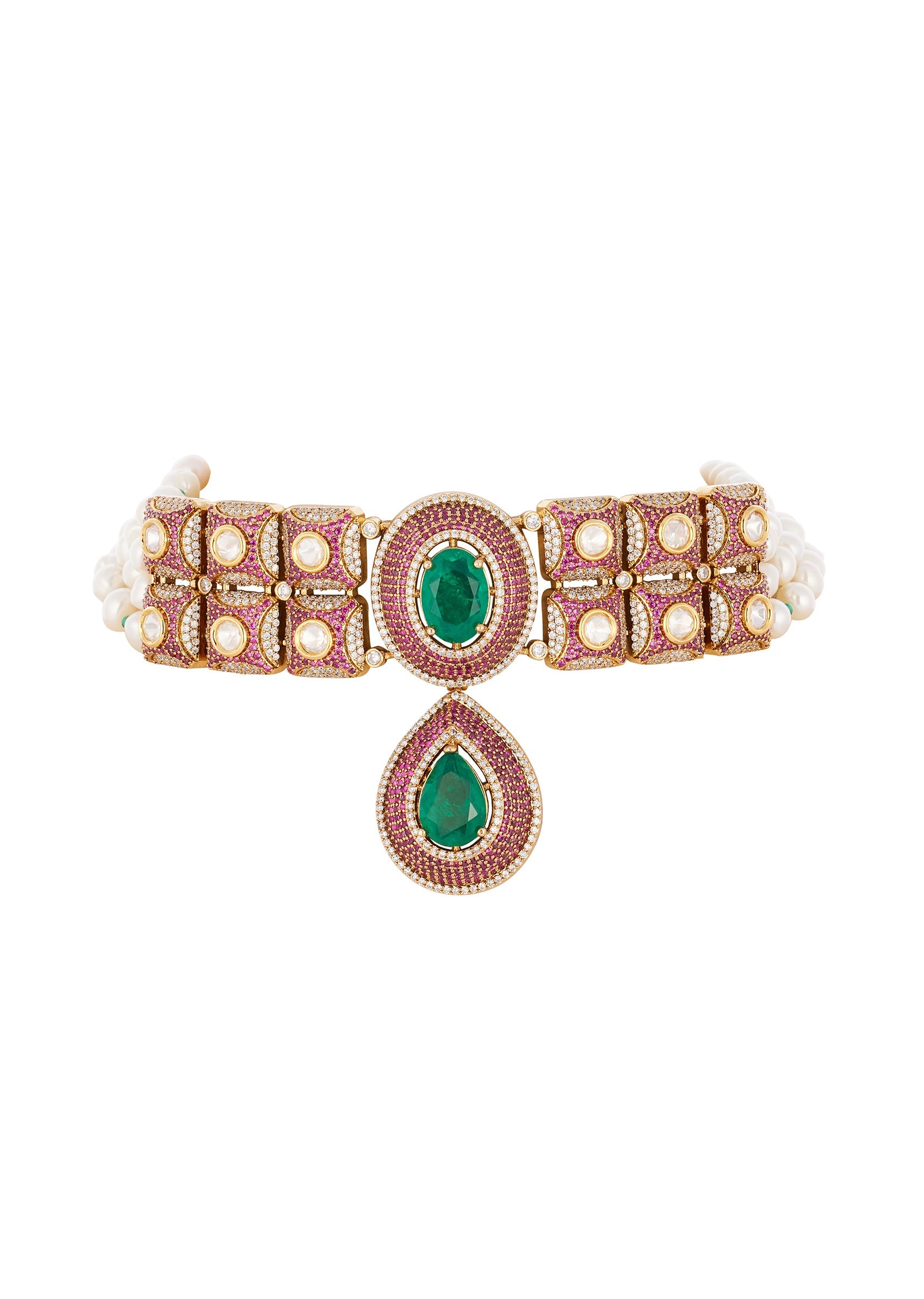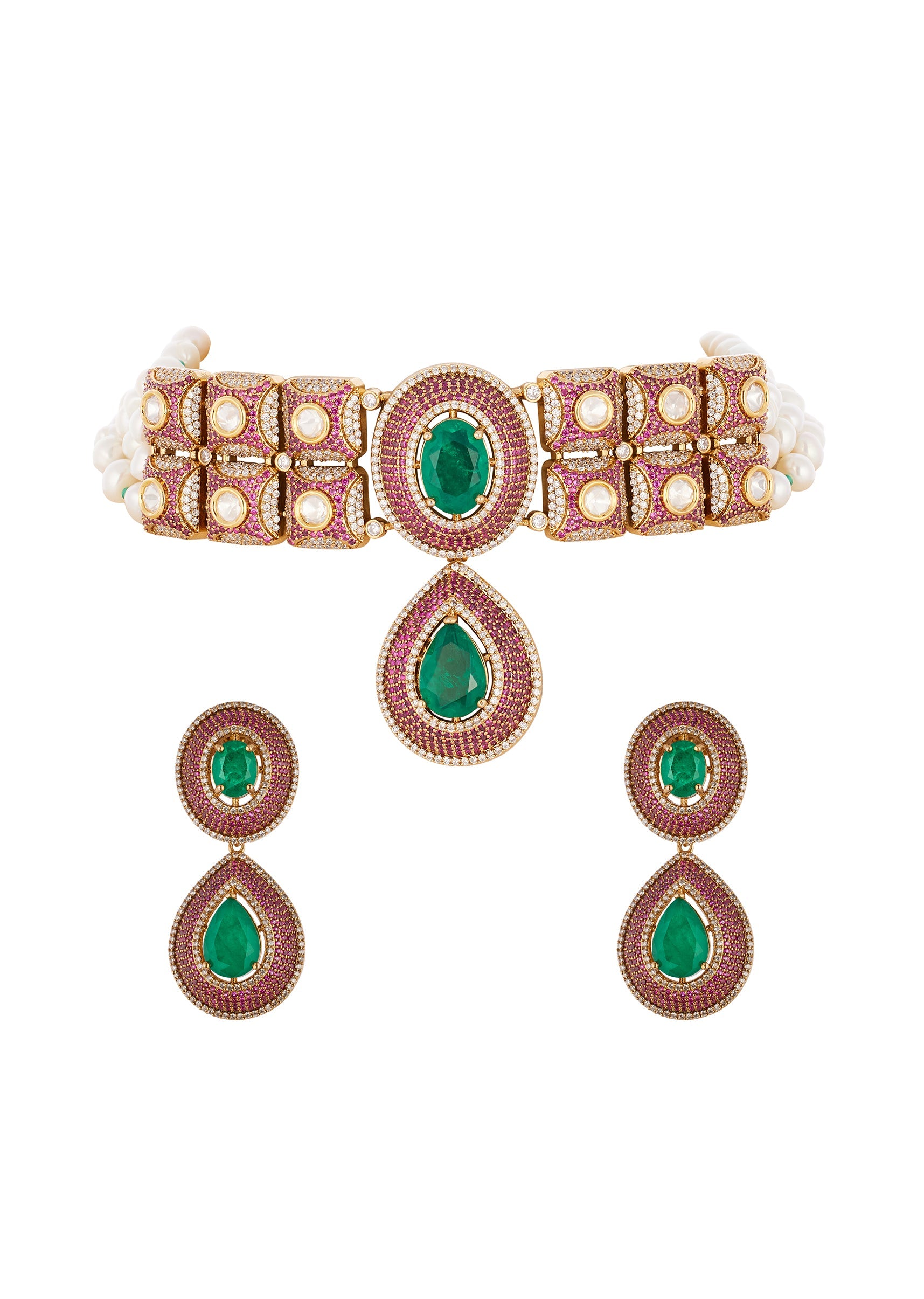 Radiating classic festive charm, this green and red jewellery set features the use of Polki uncut diamonds set in the traditional Kundan Jadau technique. The semi precious stones and delicate drops add a graceful touch, enhancing its rich handcrafted detailing. Designed to bring heritage elegance to any celebration, this set pairs beautifully with bridal and traditional ensembles, offering a regal finish that stands out effortlessly. Awarded as the Most Trusted Brand, we're delivering styles you love, just as promised.