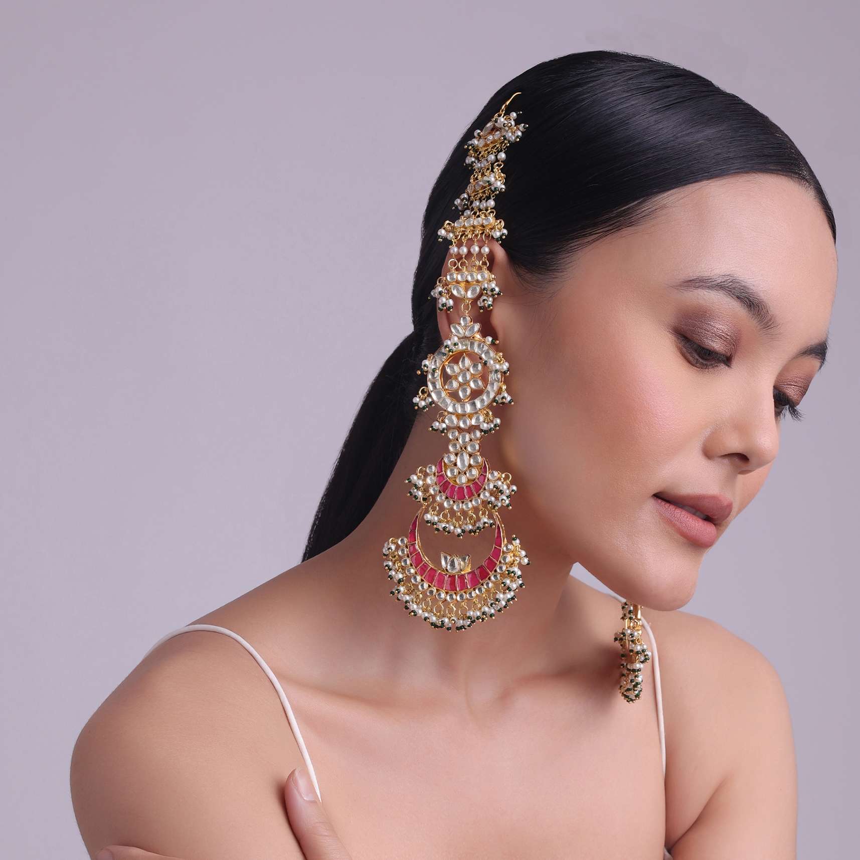 Green And Red Tone Chandabali Heavy Kundan Earrings With Pearls