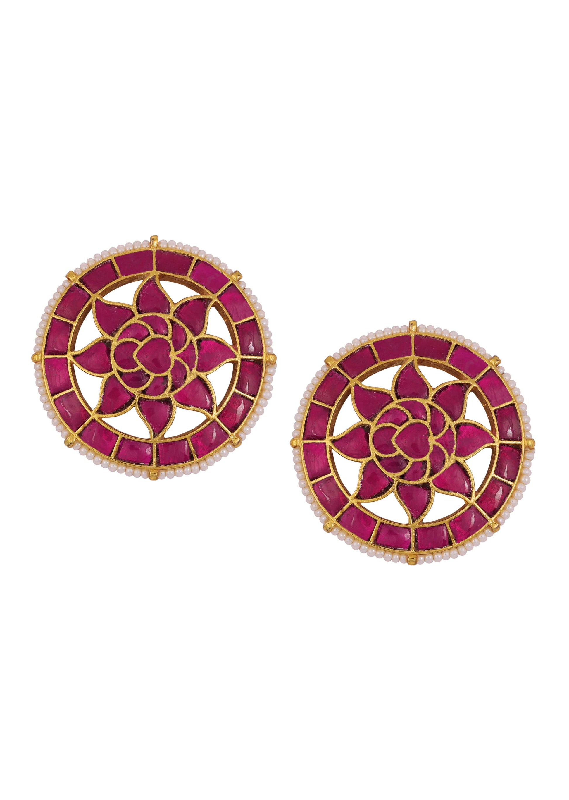 Presenting a gorgeous pair of gold finish jadau kundan earrings in mixed metal, gold finish, synthetic ruby and emerald stones, along with beads, pearls, and a floral design that accentuate... More Product Details