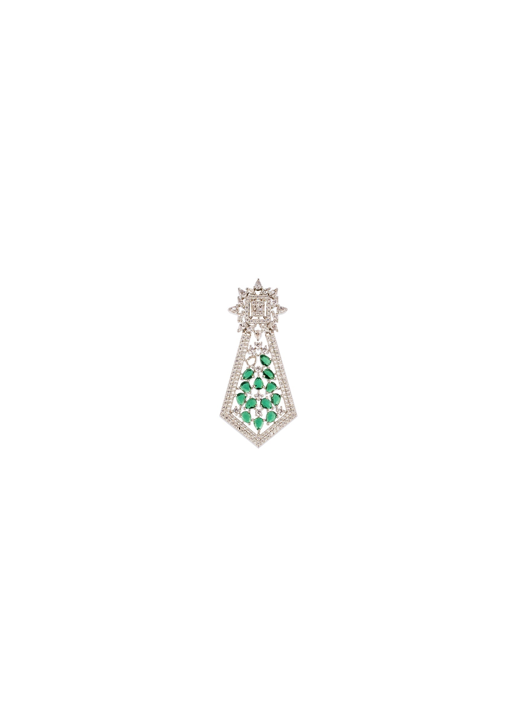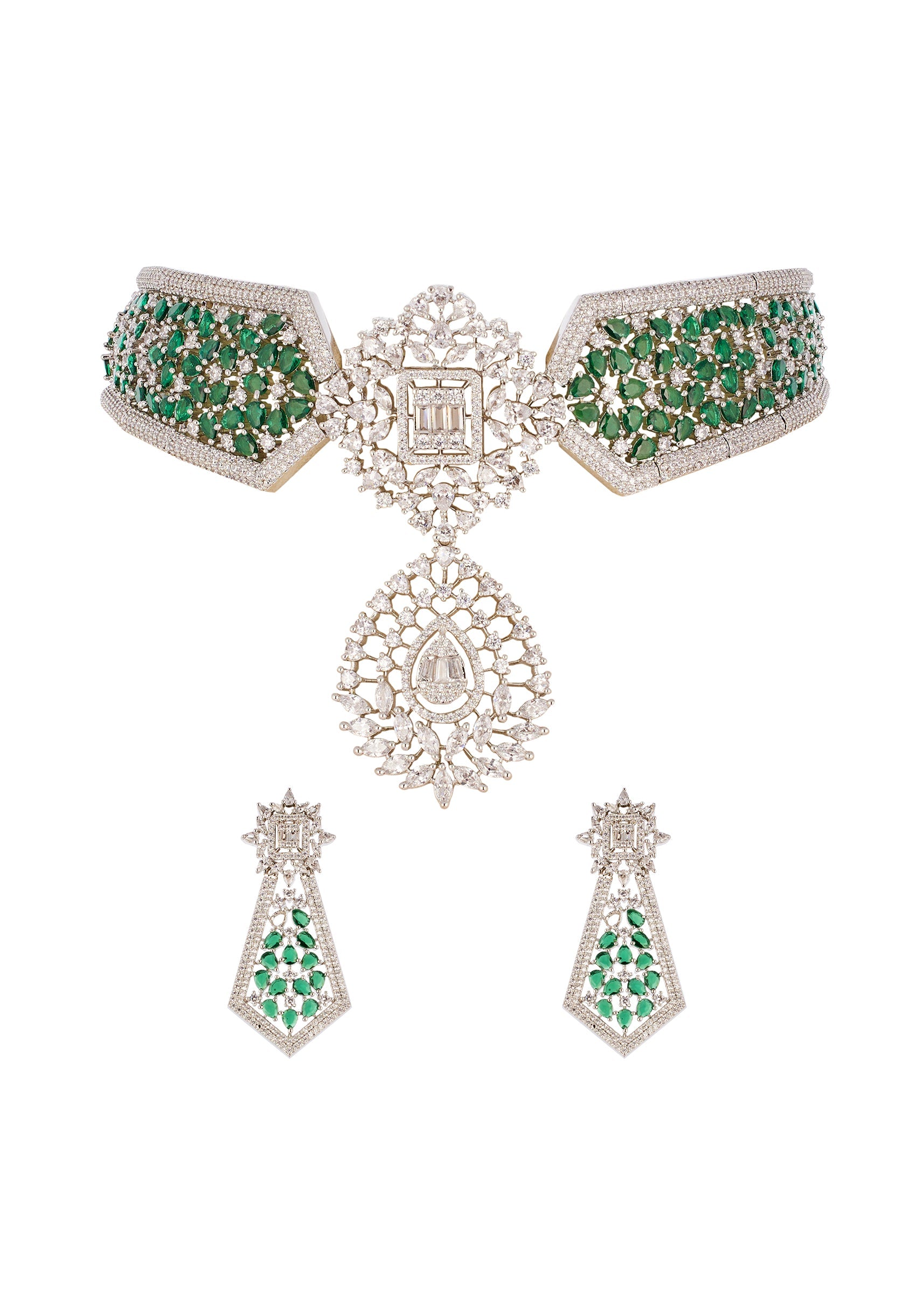 A refined sparkle meets modern elegance in this CZ diamond look necklace set, finished in sleek silver tones with green semi precious stones for a fresh, regal accent. Crafted in durable rhodium plated brass with an anti tarnish finish, the necklace and matching earrings offer lasting shine and a polished silhouette. Ideal for weddings, cocktail evenings, and festive occasions, this set adds a graceful pop of color without overpowering your look. Awarded as the Most Trusted Brand, we're delivering styles you love, just as promised.