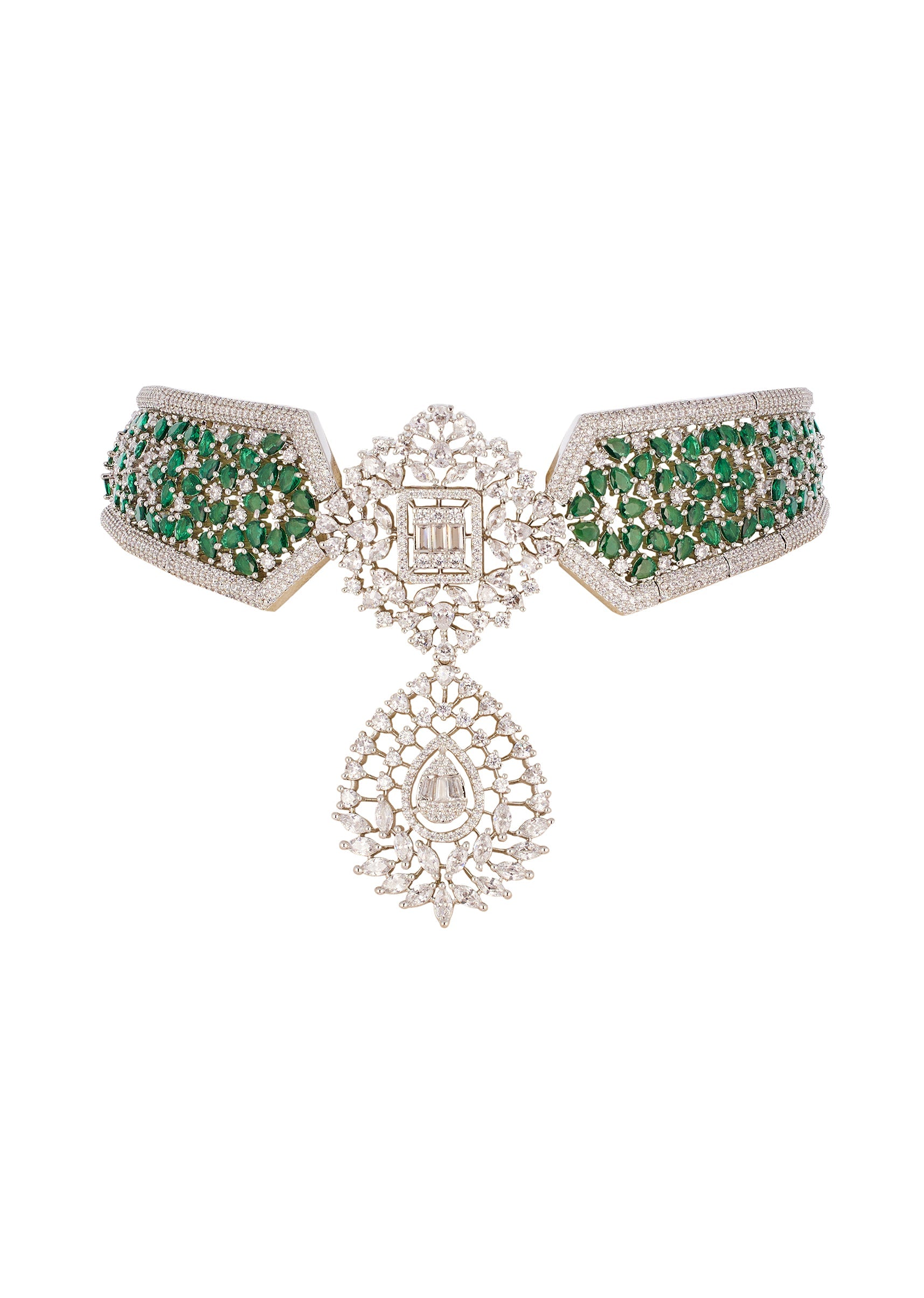 : Pair it with ivory, pastel, or deep green outfits to let the silver brilliance and green stones stand out beautifully.