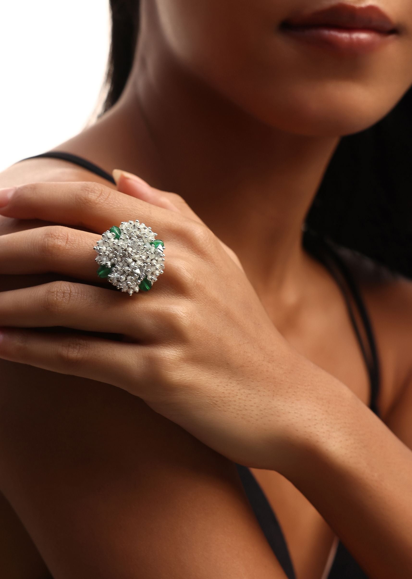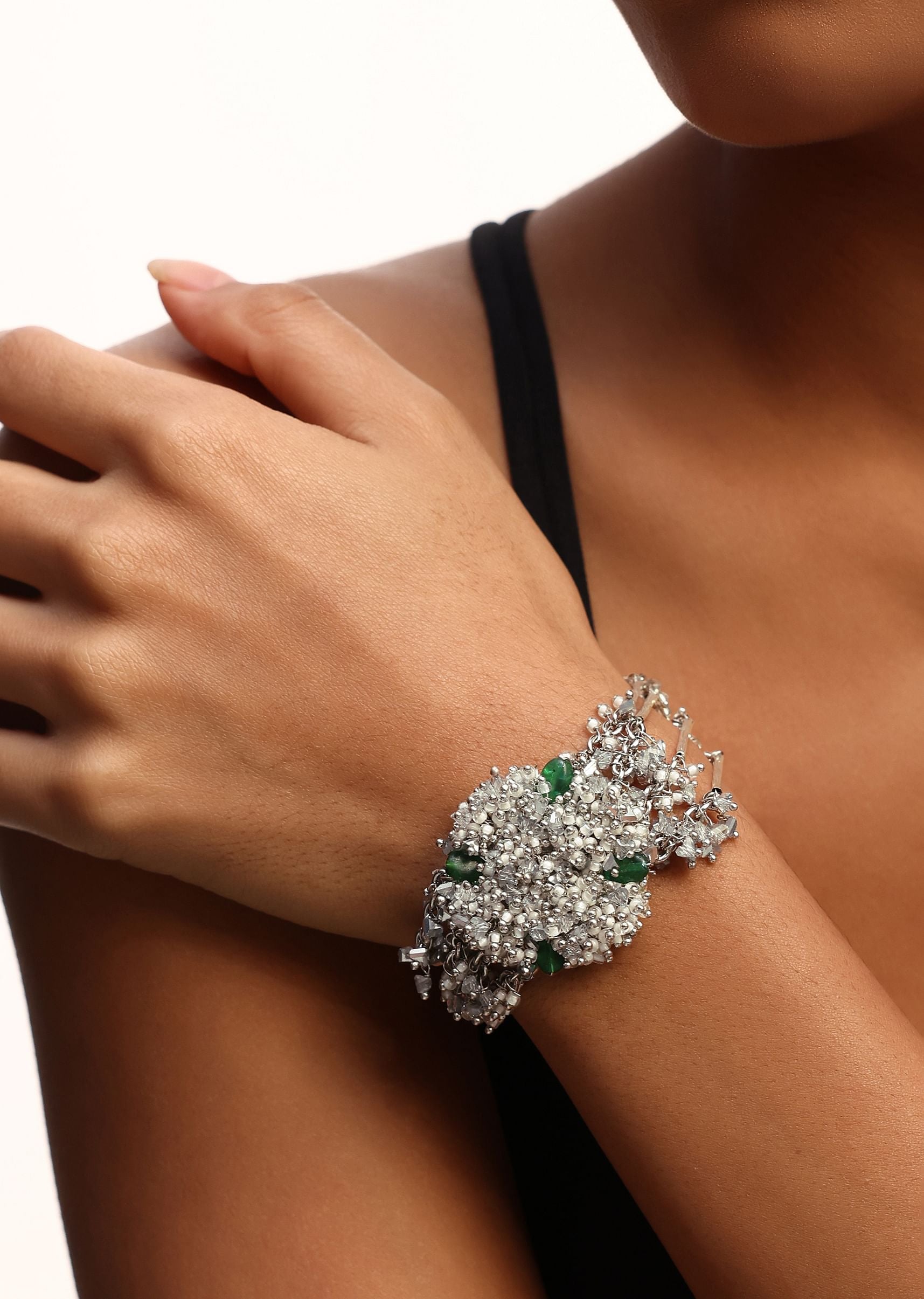 Elevate your look by pairing the green and silver handcrafted necklace set with a high-neck blouse in a neutral shade to let the vibrant colours pop.
