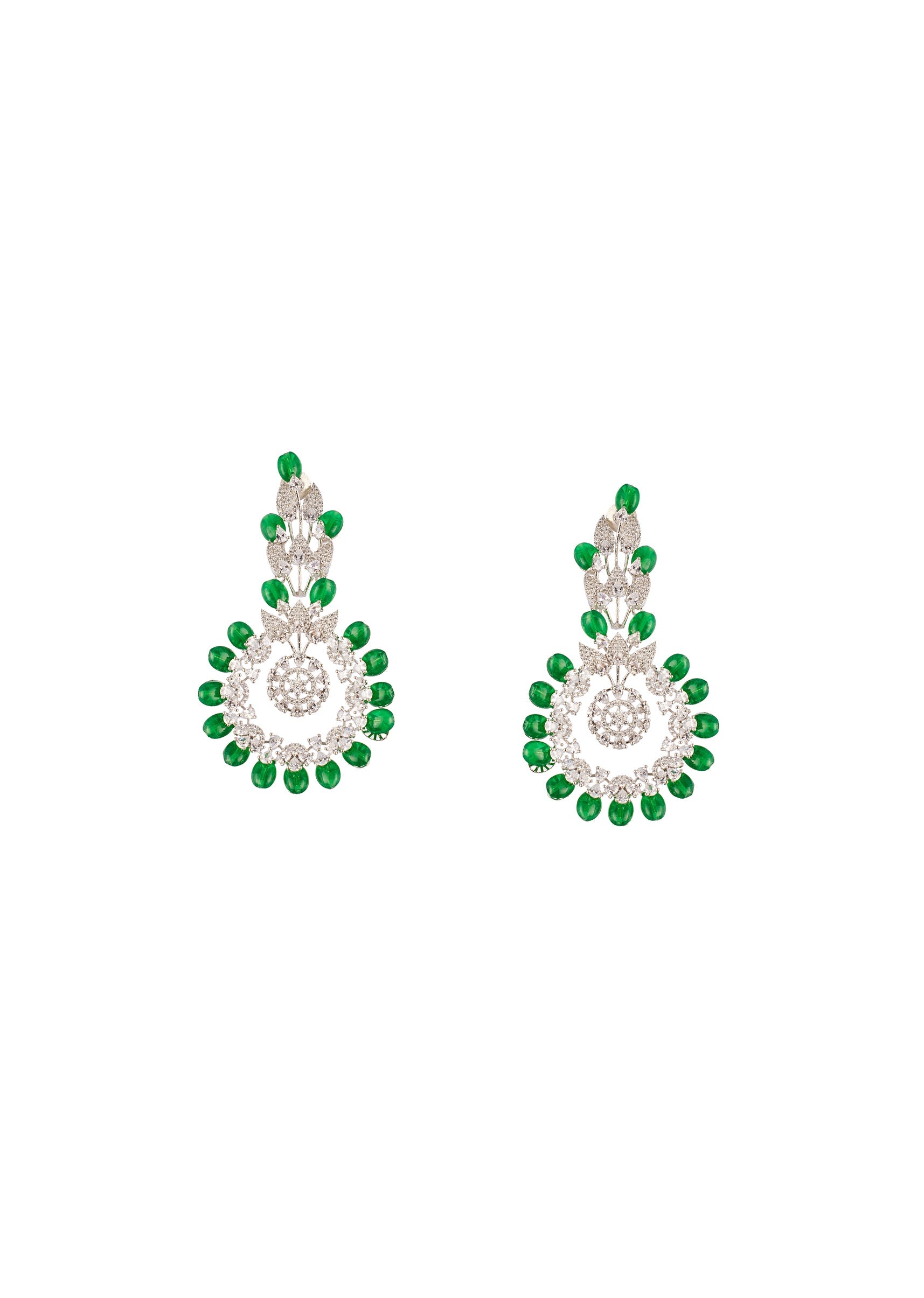 Green Anti Tarnish CZ Diamond Rhodium-Plated Brass Earrings with Beads