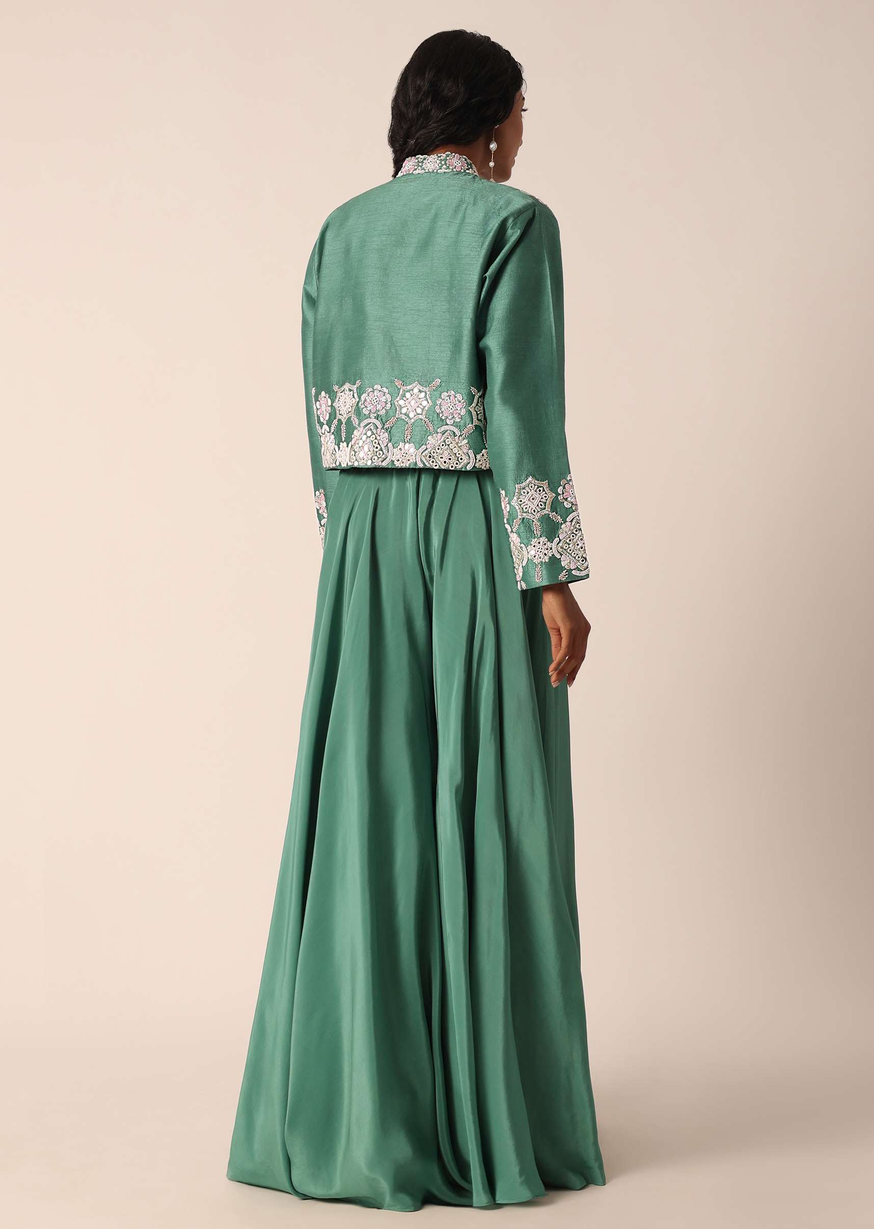 The perfect standout piece this green indofusion palazzo set showcases your unique style. Fashioned from art silk fabric the jacket displays embroidered floral motifs. Glistening with mirror work this threepiece... More Product Details