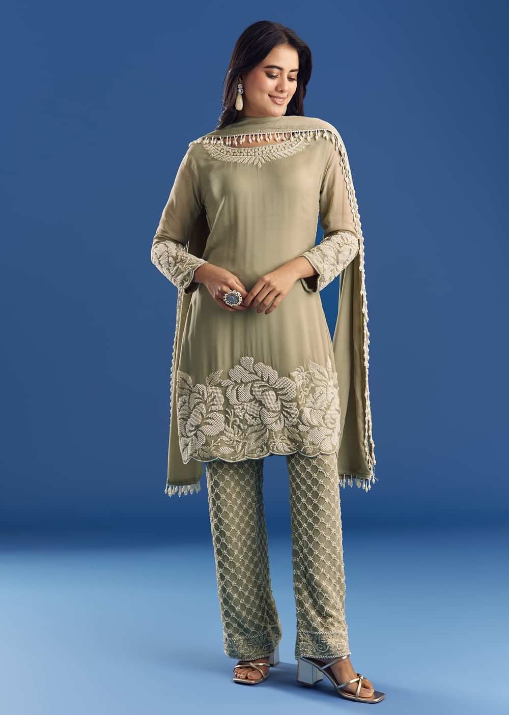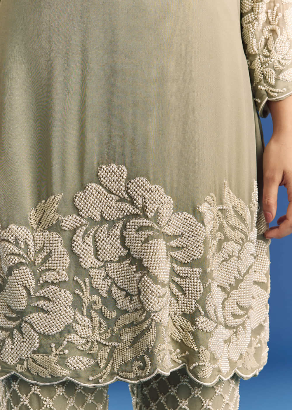 Green Beaded Kurta Pant Set With Dupatta In Georgette