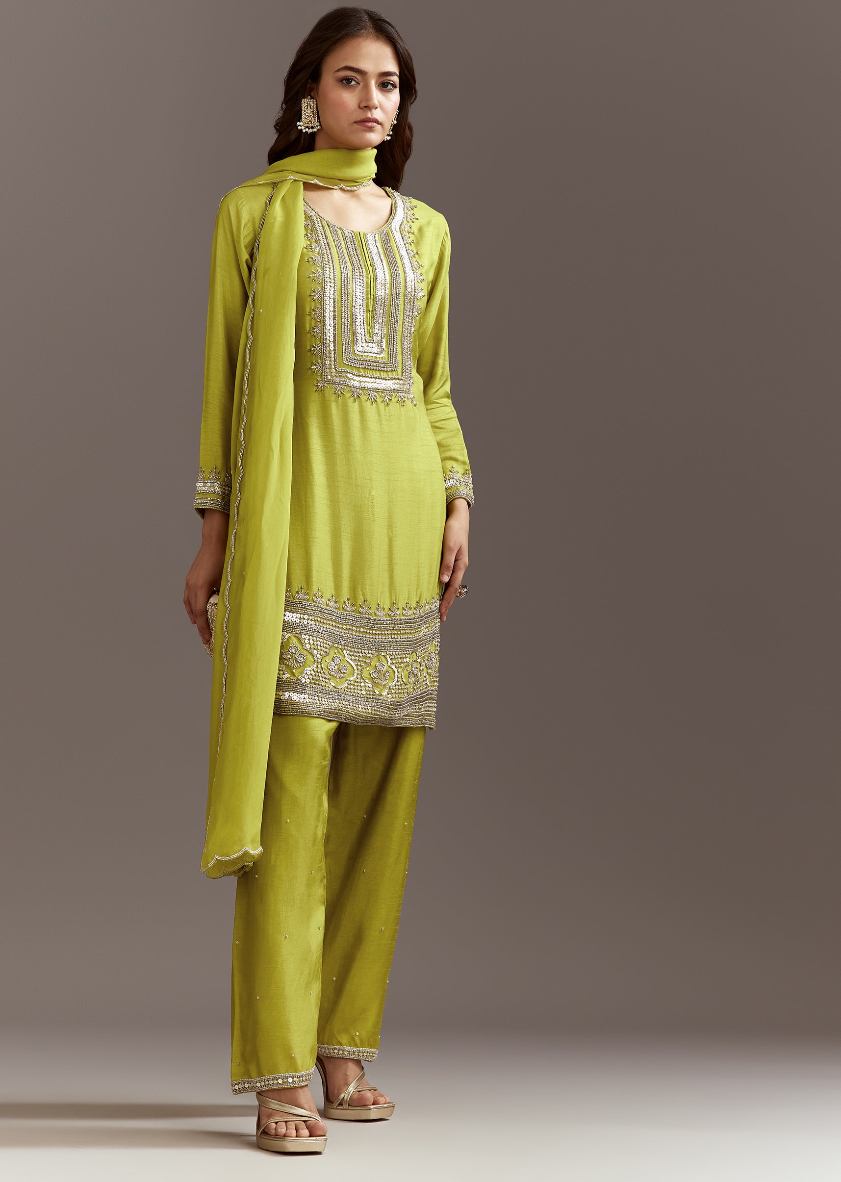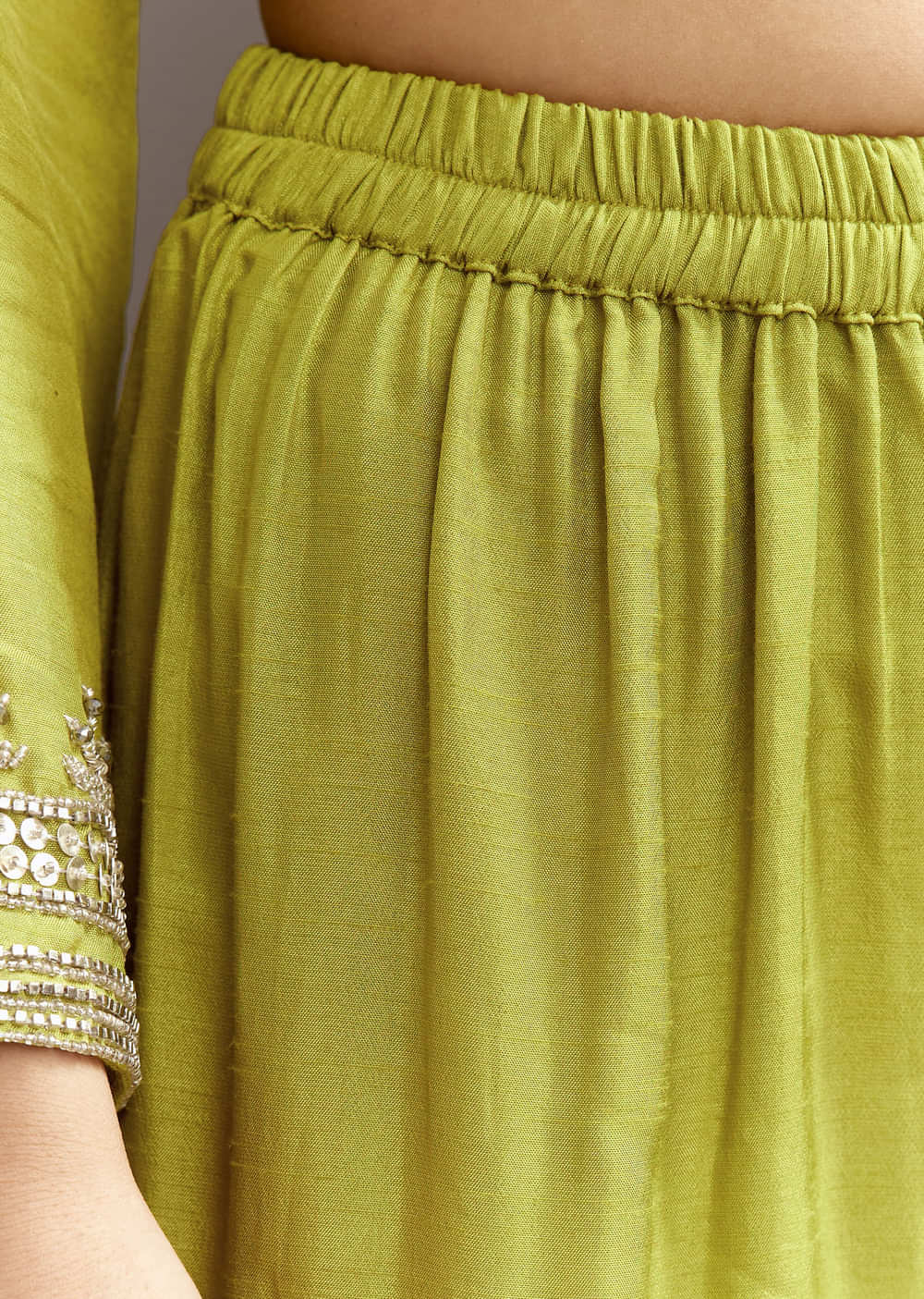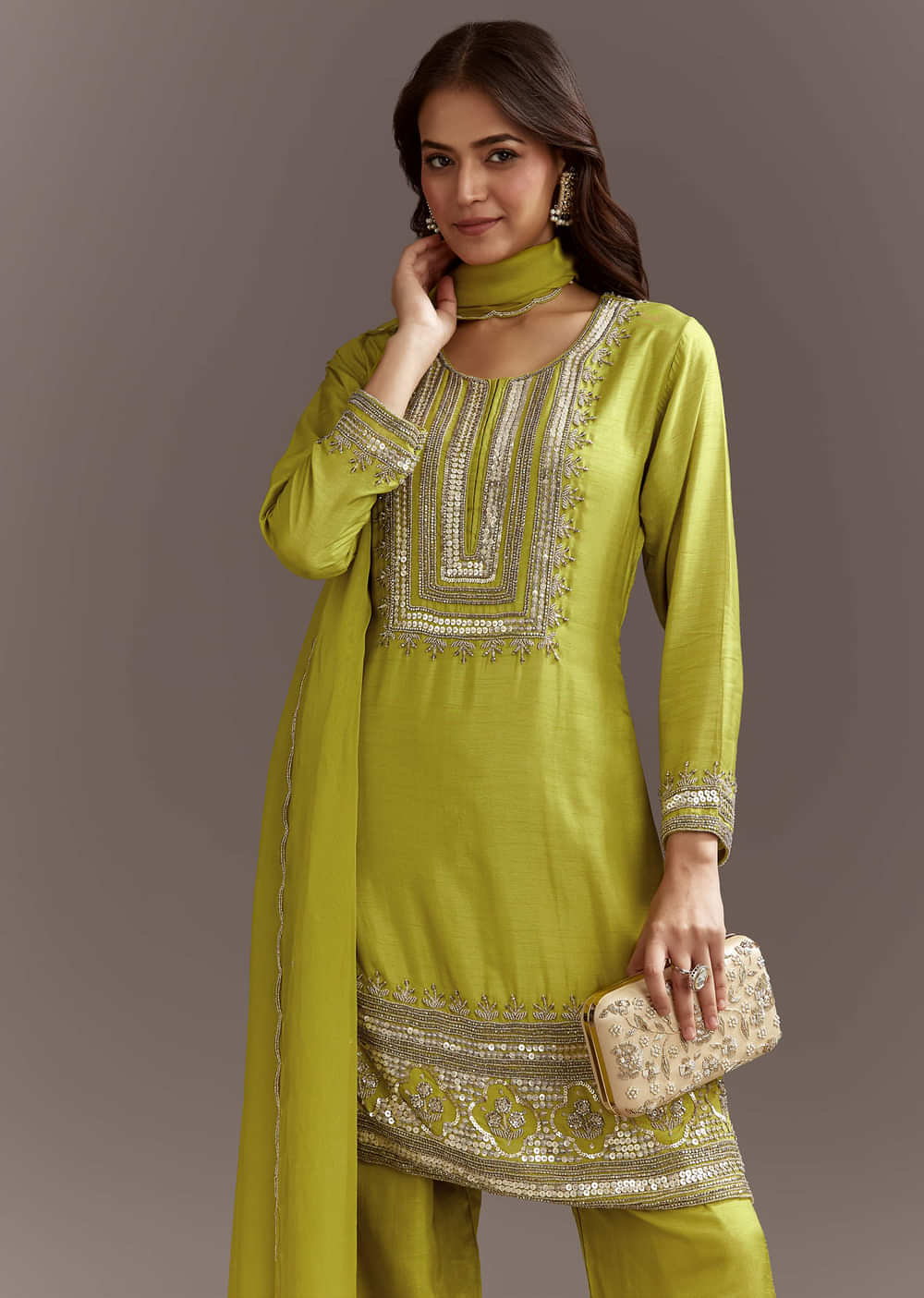 This green silk kurta features intricate beads and sequins embroidery, paired with a scallop border organza dupatta for a vibrant mehendi look.Awarded as the Most Trusted Brand, we're delivering styles... More Product Details