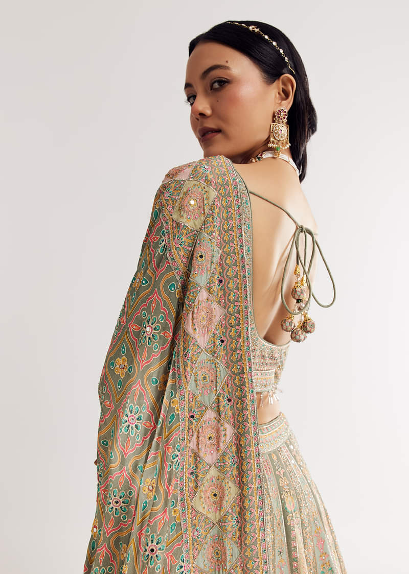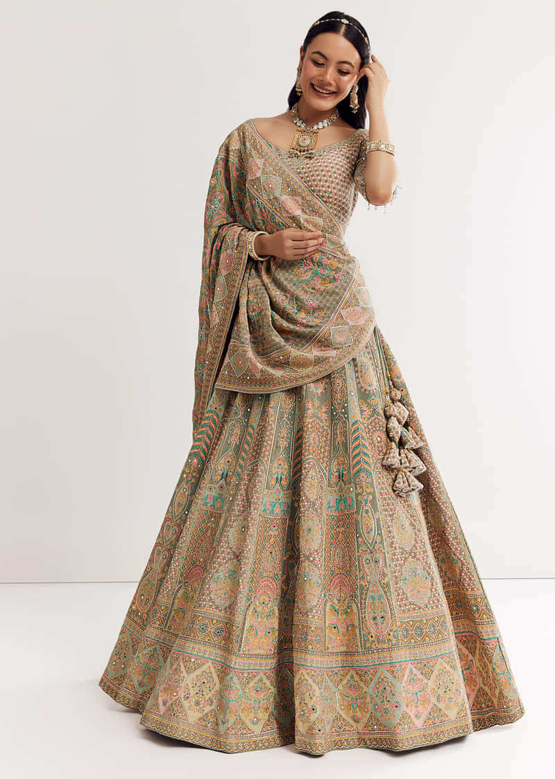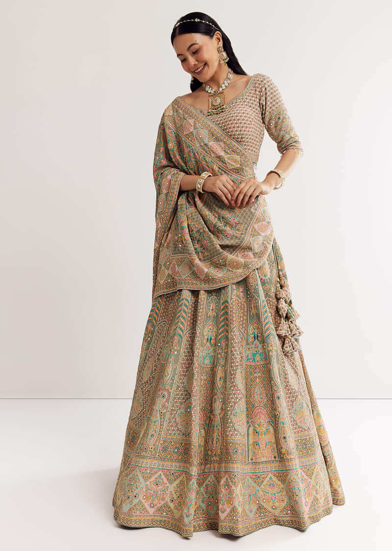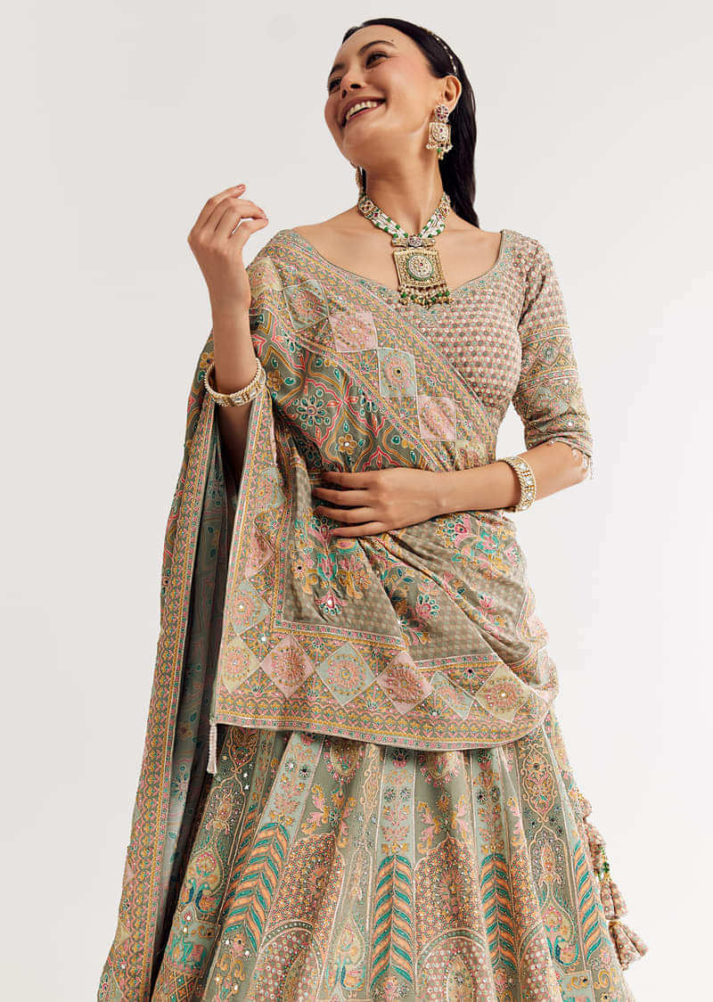 Green Beige Sweetheart Neck Georgette Printed Lehenga With Crepe Dupatta
