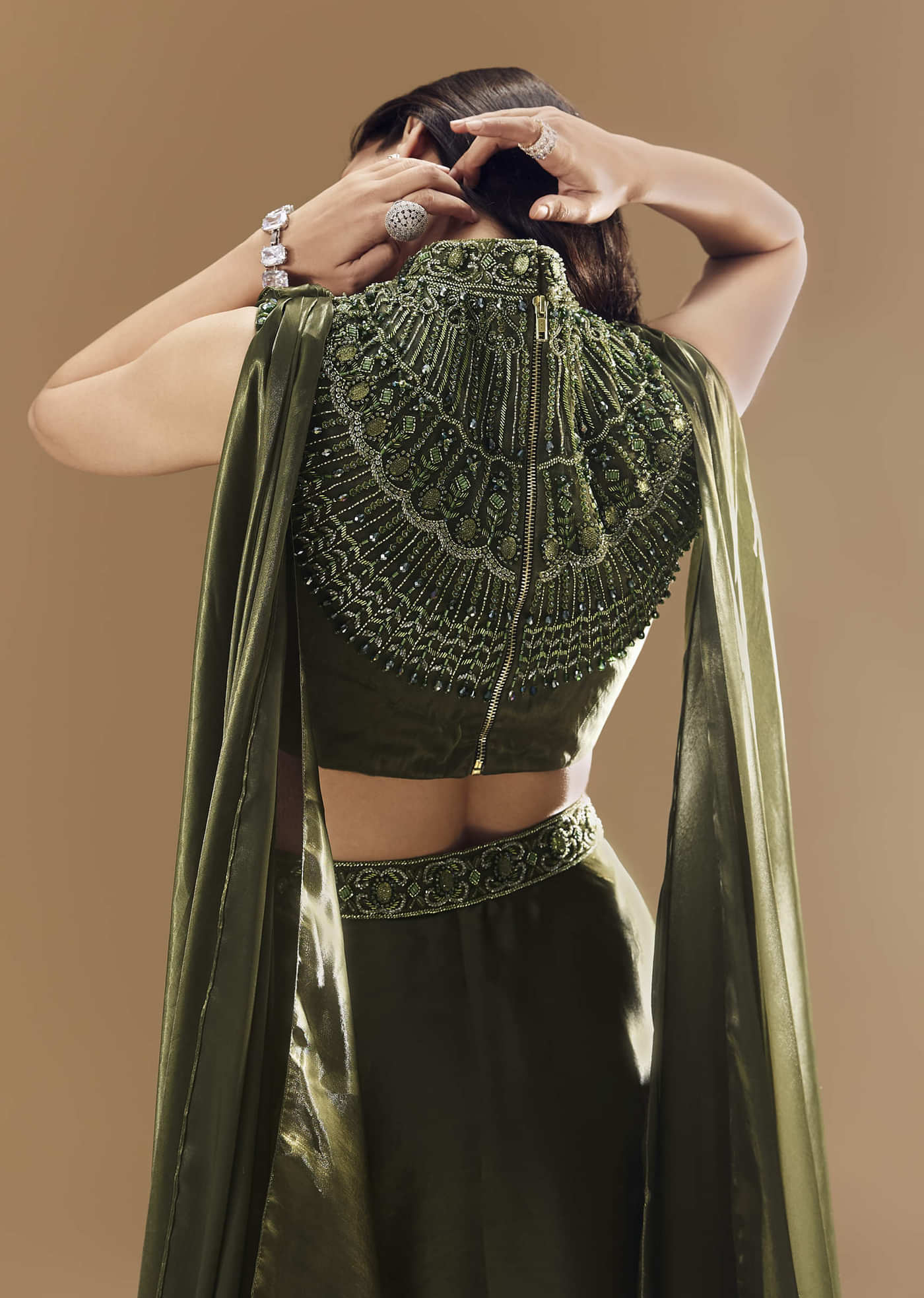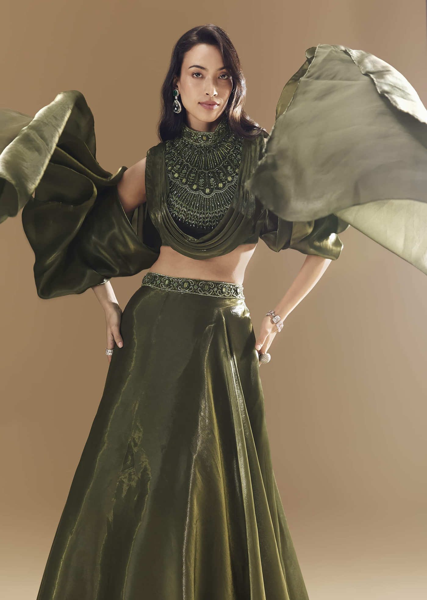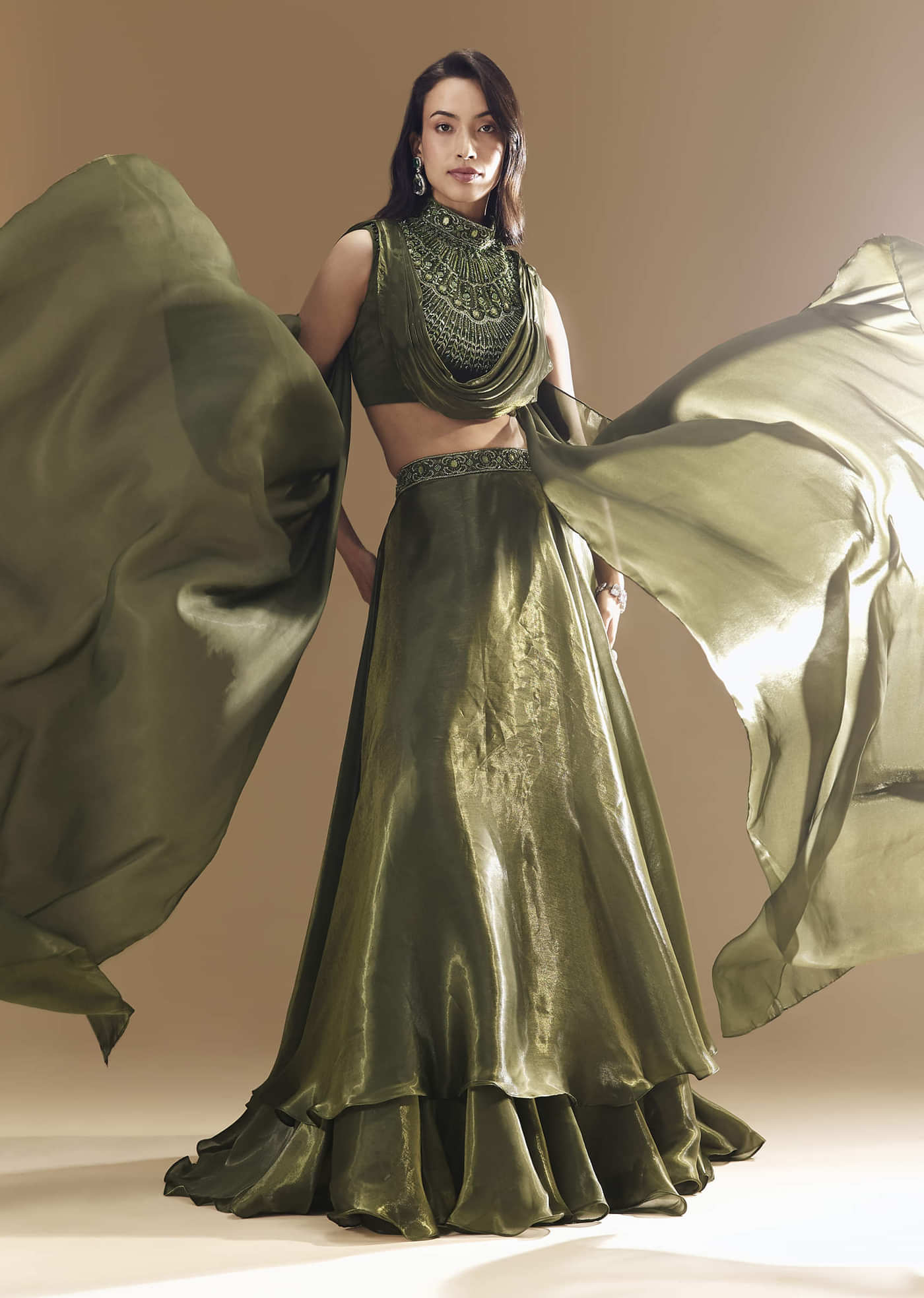 Crafted for glamorous festivities, this olive green organza lehenga set captures a perfect balance of fluid femininity and modern structure. The sculpted cowl-draped blouse paired with cape sleeves lends a... More Product Details