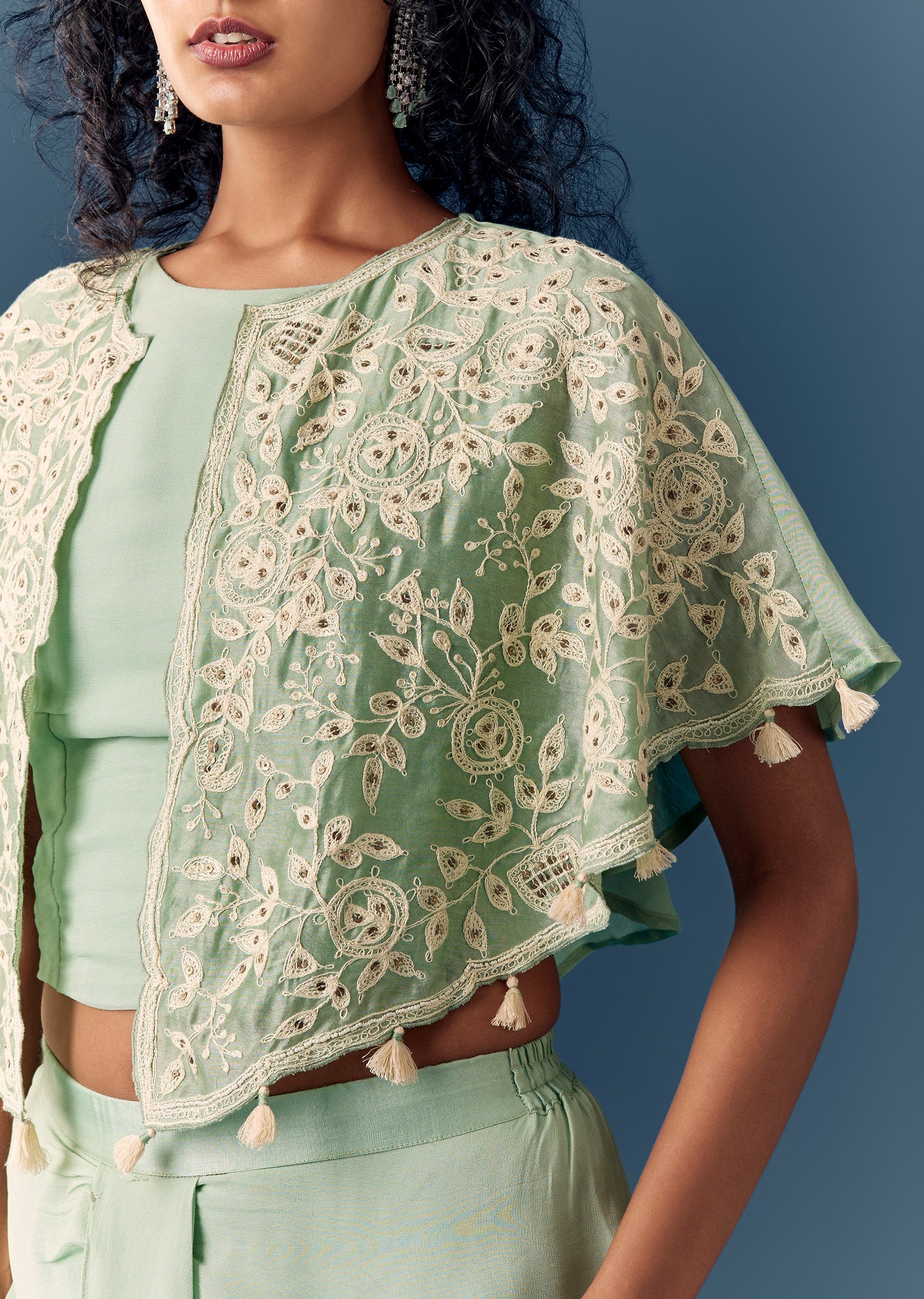 A contemporary festive set featuring a thread and sequin worked cape paired with a drape skirt and croptop. Sleeveless round-neck styling with side zip—ideal for modern festive occasions. Awarded as the Most Trusted Brand, we're delivering styles you love, just as promised.