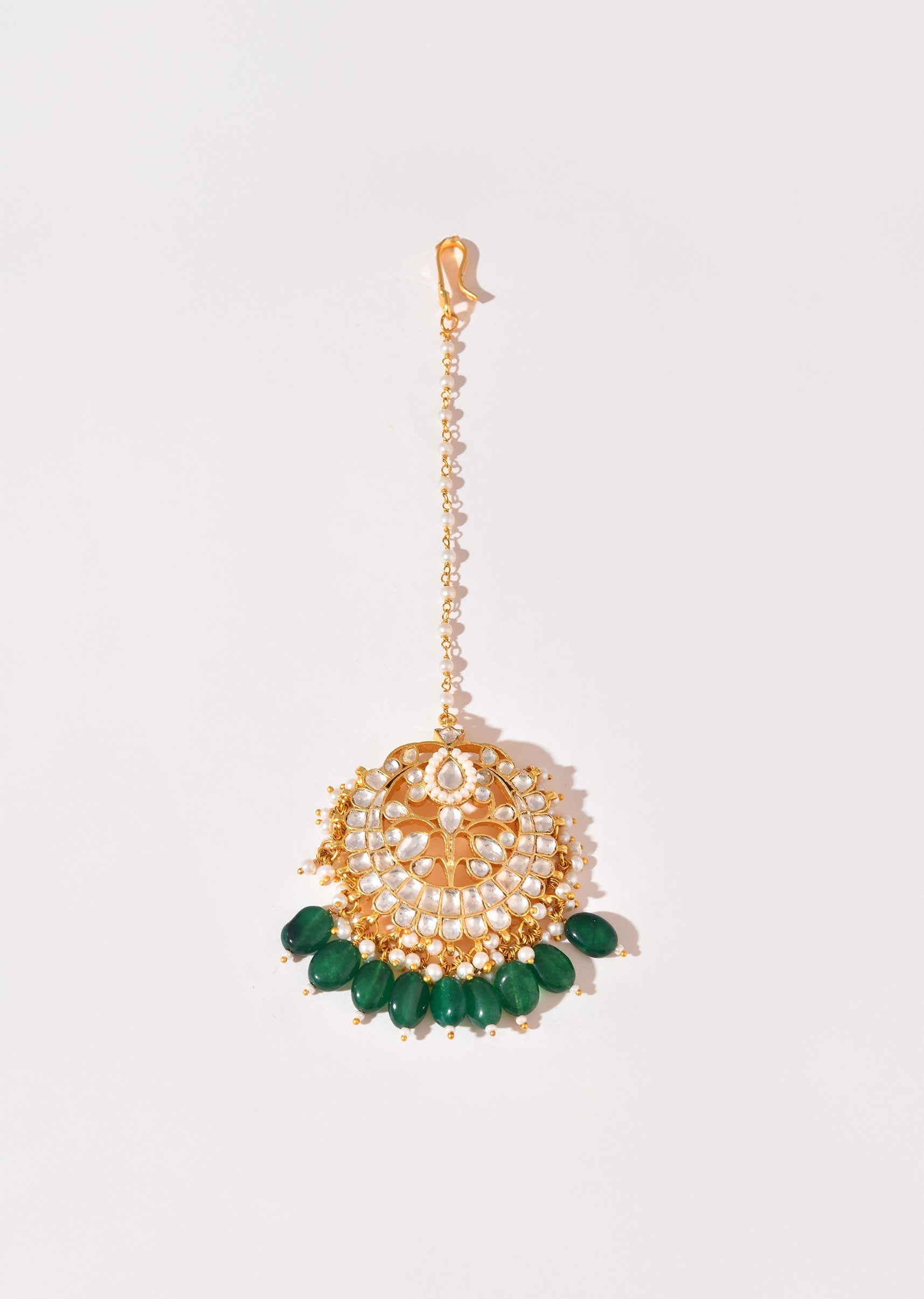 This green chandbali kundan maangtikka shines with a bold crescent design and rich gemstone tones. The intricate Kundan work adds a regal sparkle, making it perfect for festive and bridal... More Product Details