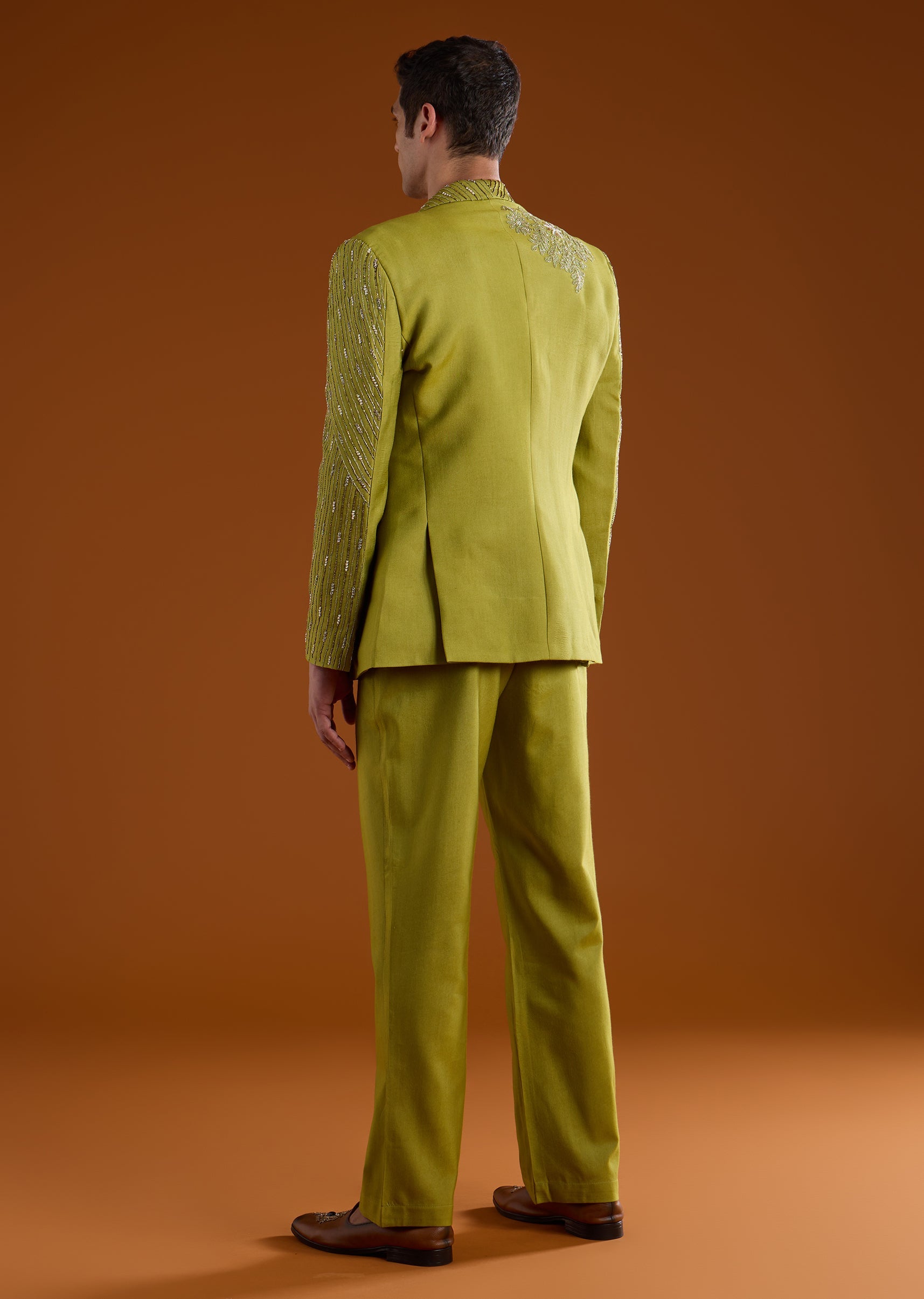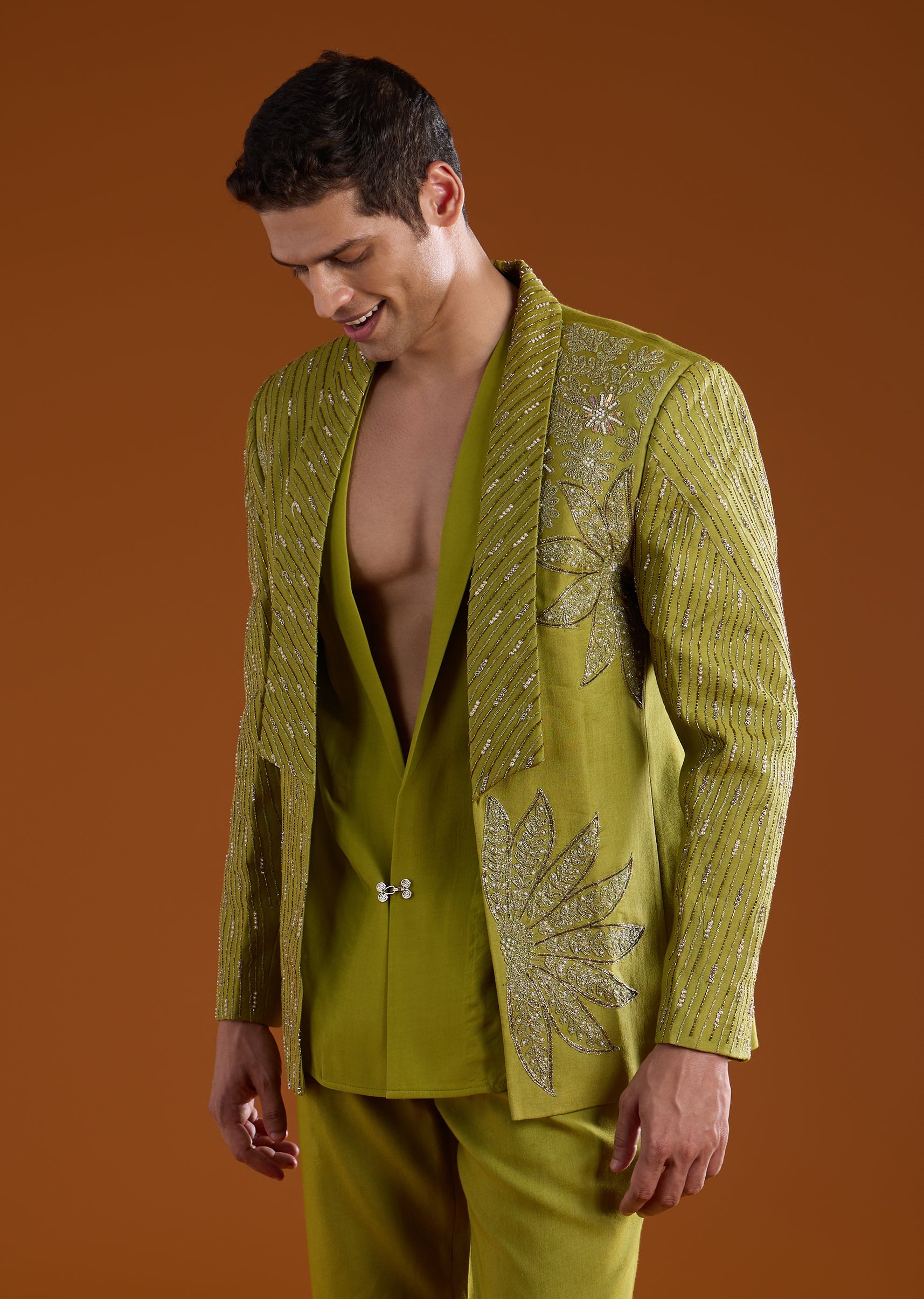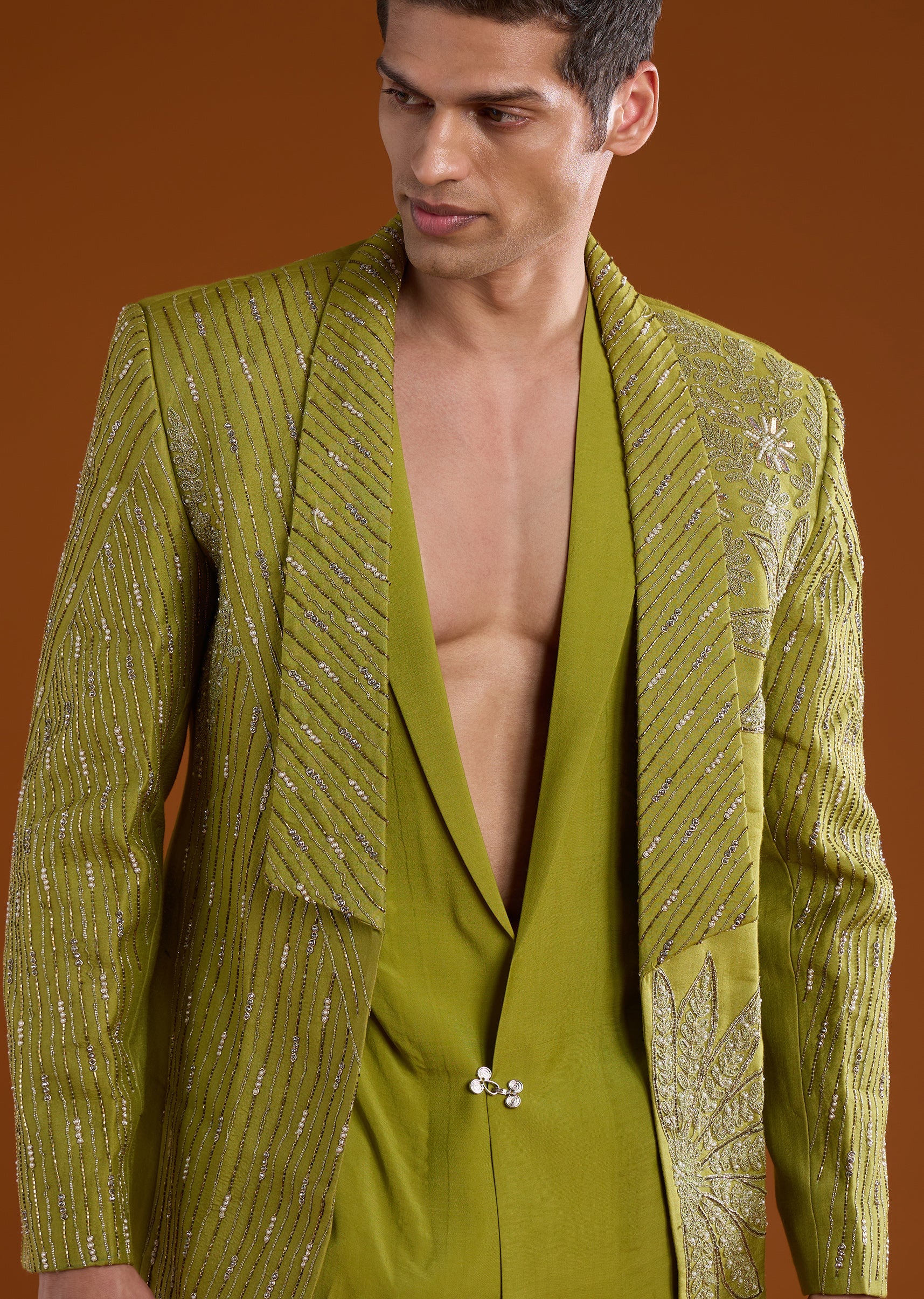 Green Chanderi Embroidered Tuxedo Set with Dori Work