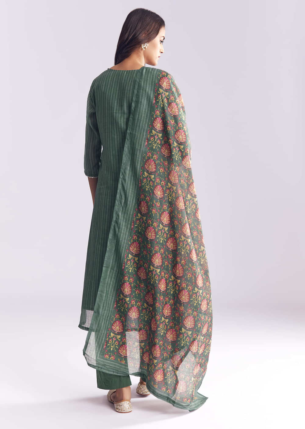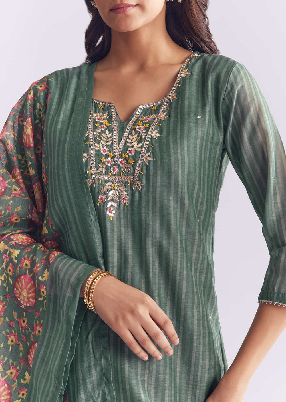 Green Chanderi Kurta Set With Stripe Print And Gota Work