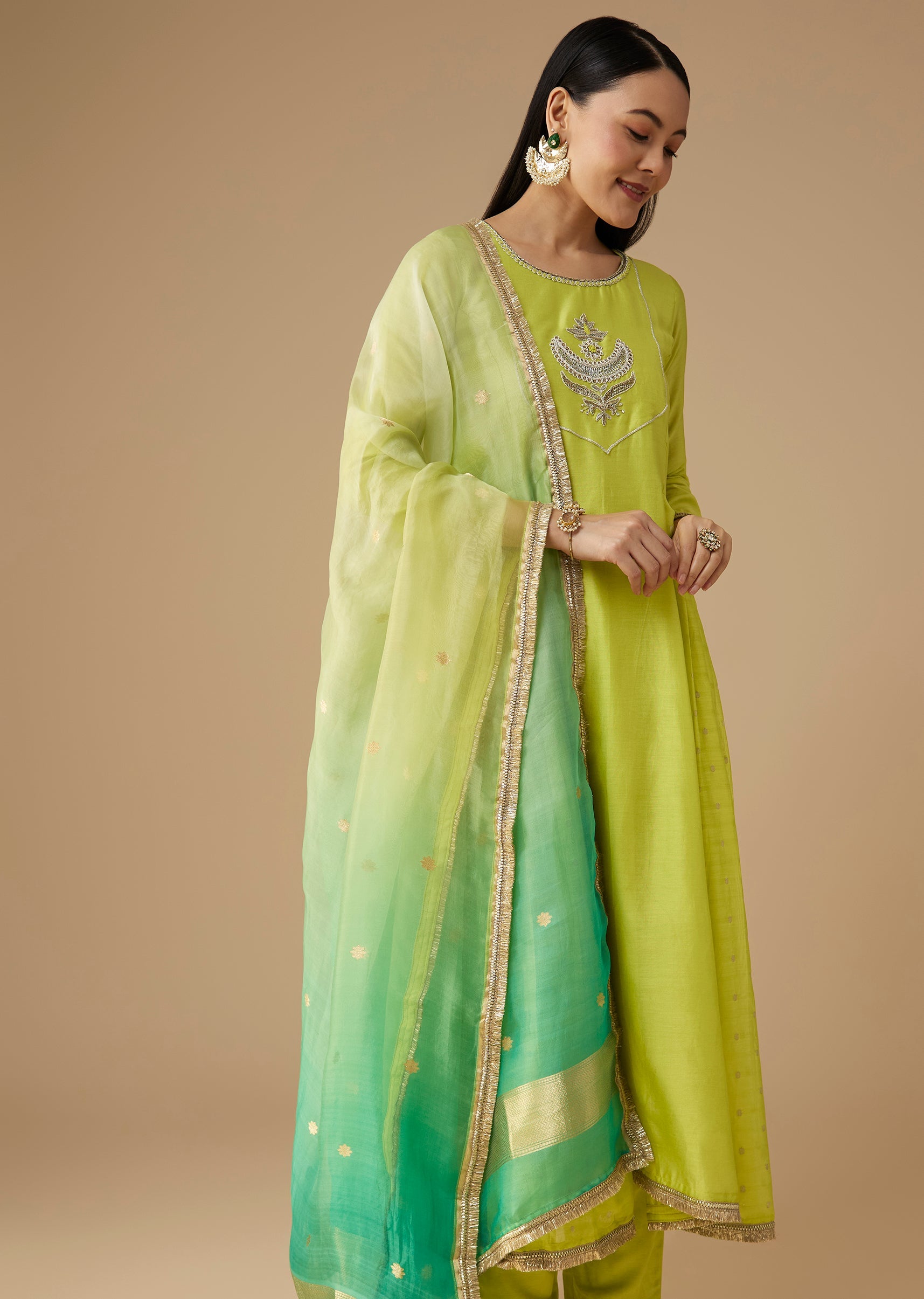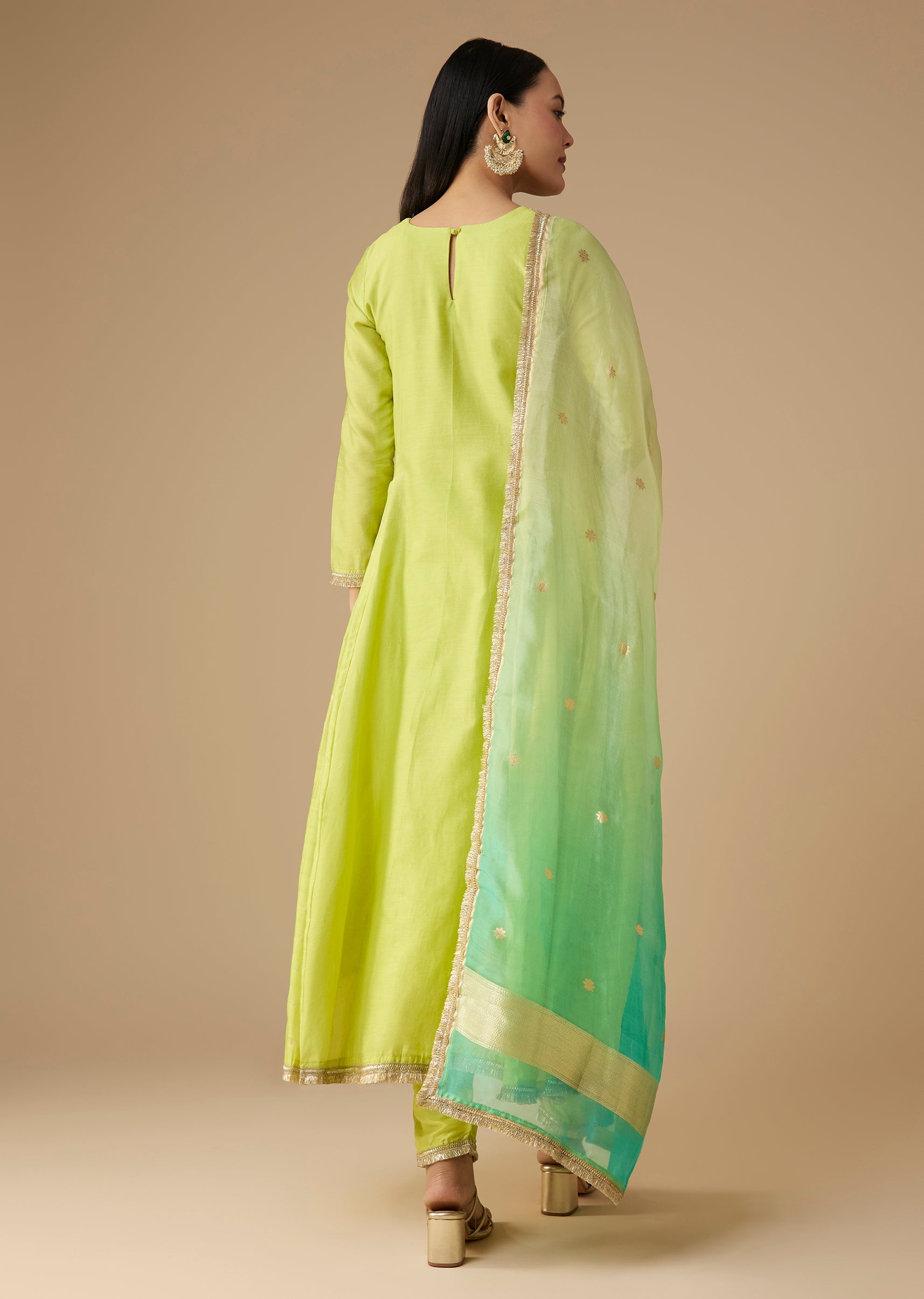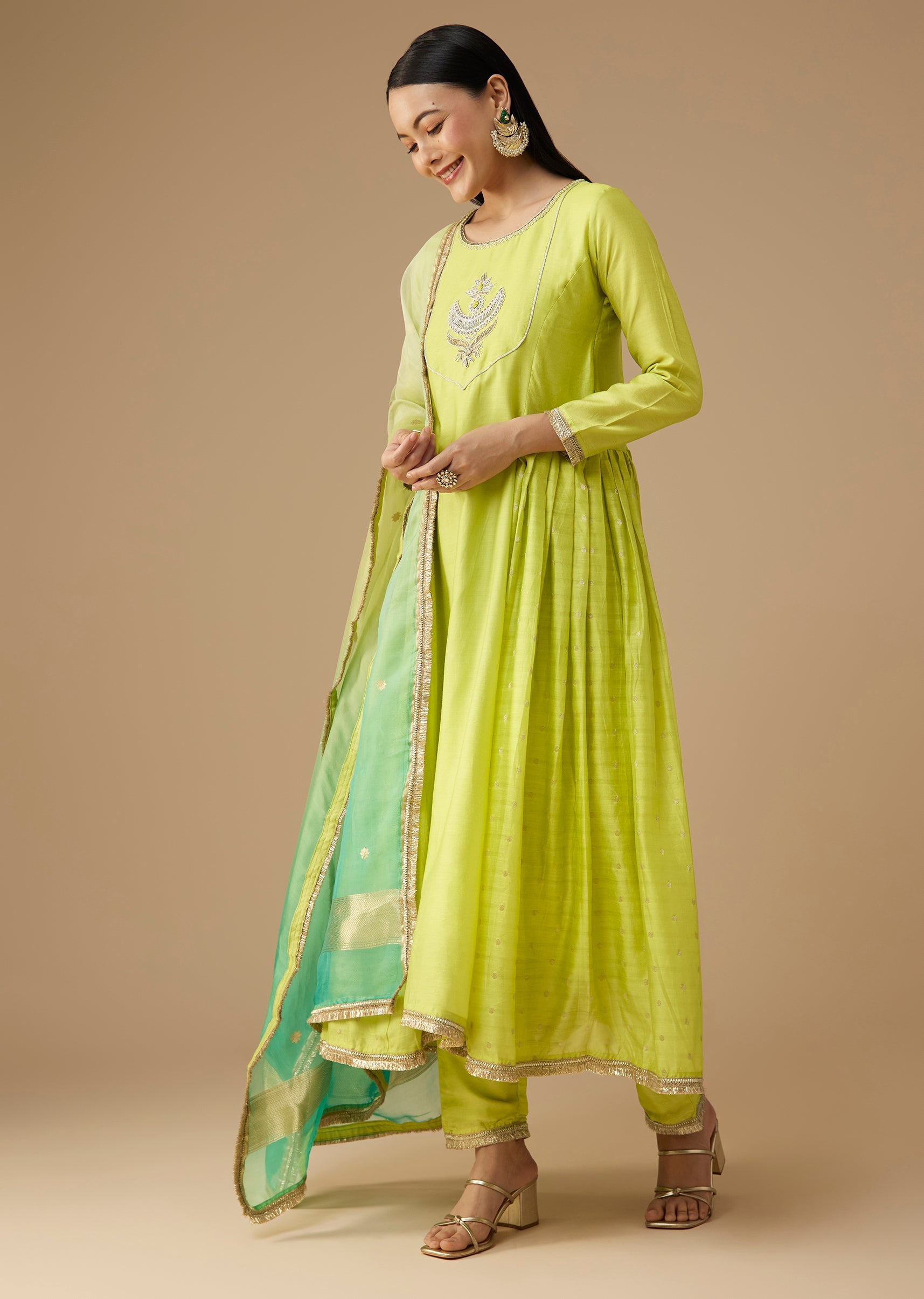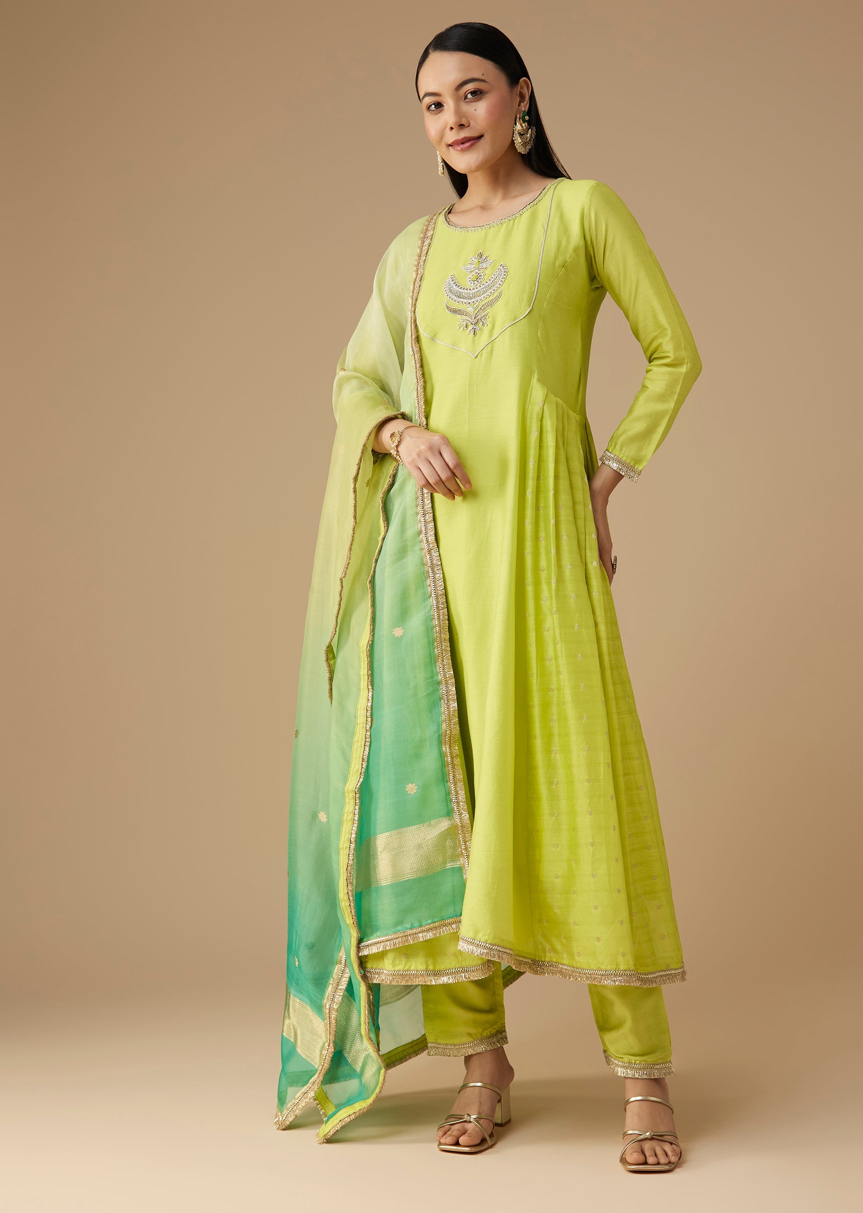 Step into refined elegance with this green anarkali set, featuring intricate silver zardosi work that adds a sophisticated festive shine. The chanderi anarkali offers a lightweight, graceful drape, while the... More Product Details