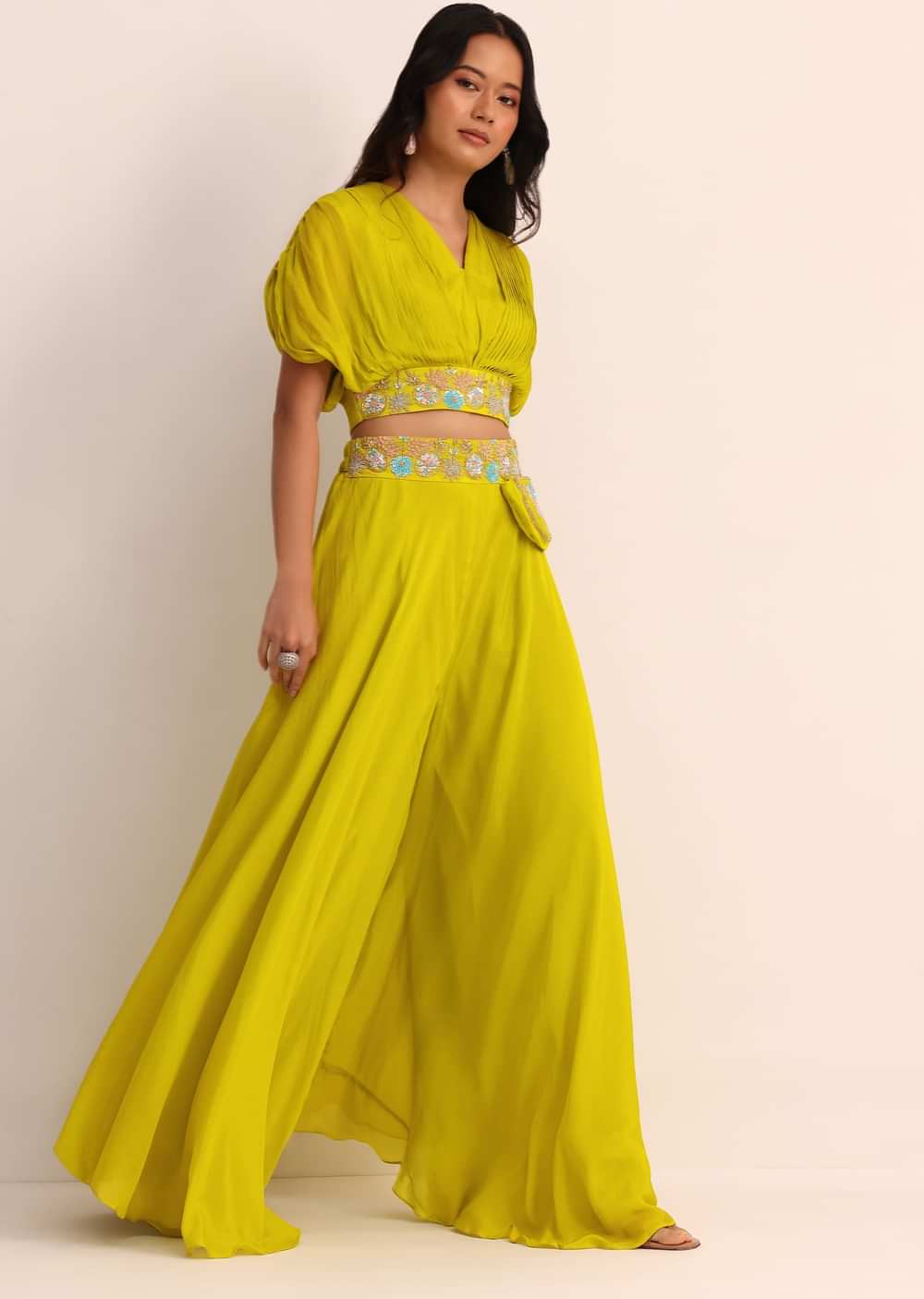 Elevate your festive wardrobe with this green crop top and palazzo set. Crafted from luxurious chiffon, this ensemble is adorned with intricate resham work, cut dana, sequins, and zardozi detailing.... More Product Details