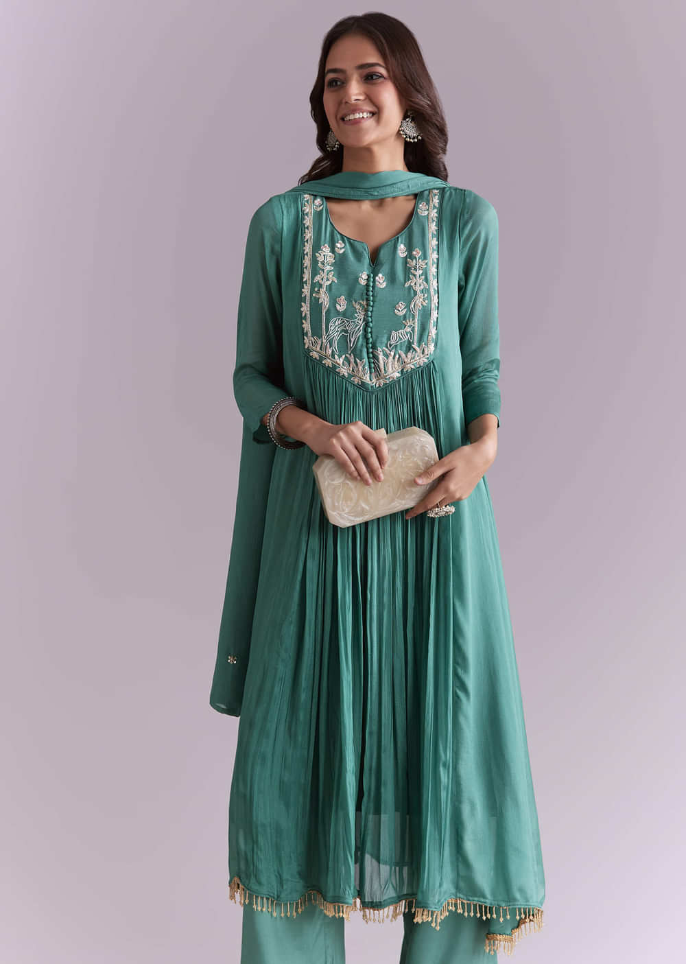 If you like fluid drape with a hint of sparkle, this green chinon anarkali suit keeps the look airy and polished. Sequin and resham embroidery touches the anarkali to add... More Product Details