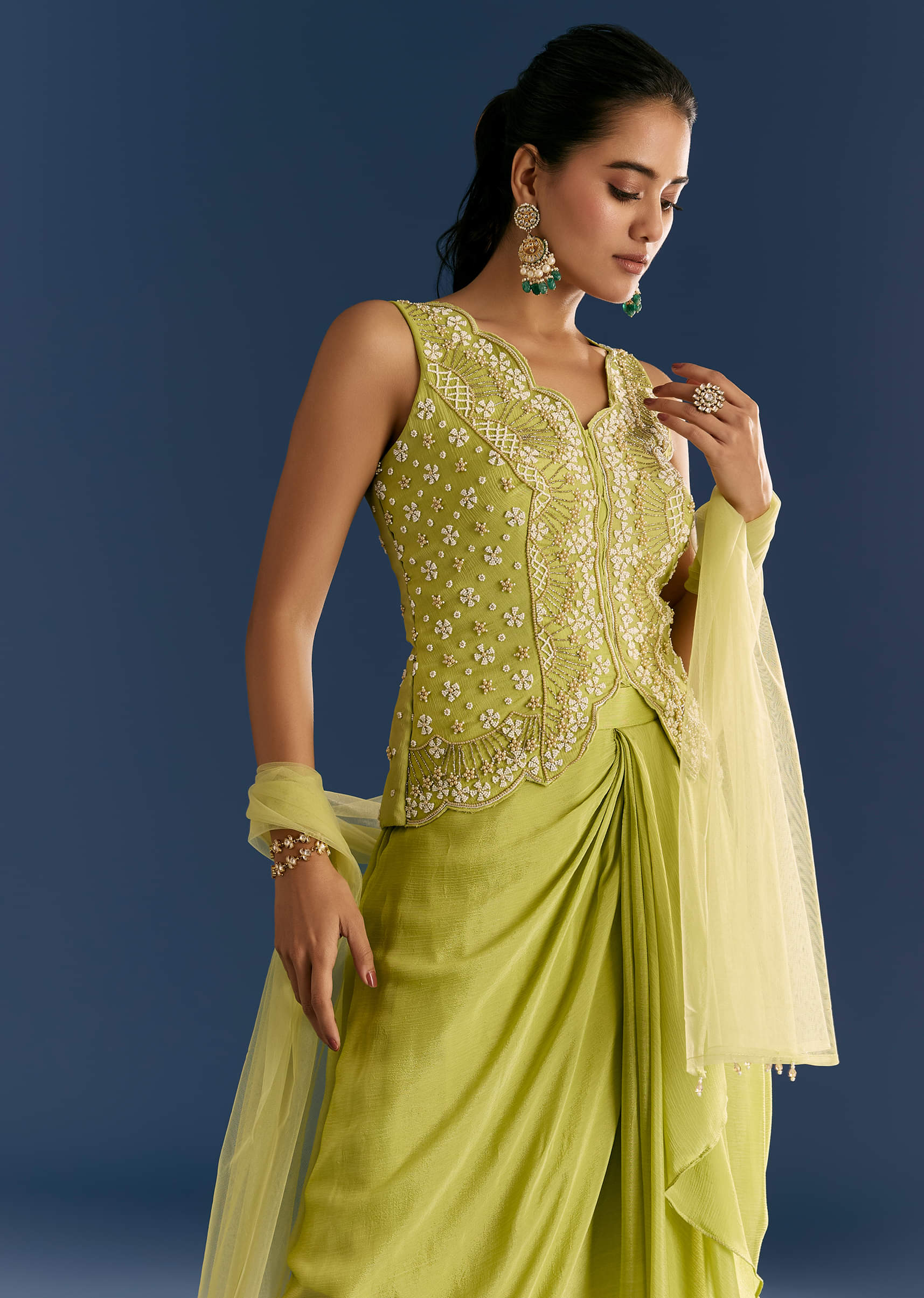 This green chinon short kurta is adorned with moti and cut dana work, paired with a stylish fancy skirt, making it an Indo-Western dream for haldi ceremonies. Awarded as the Most Trusted Brand, we're delivering styles you love, just as promised.
