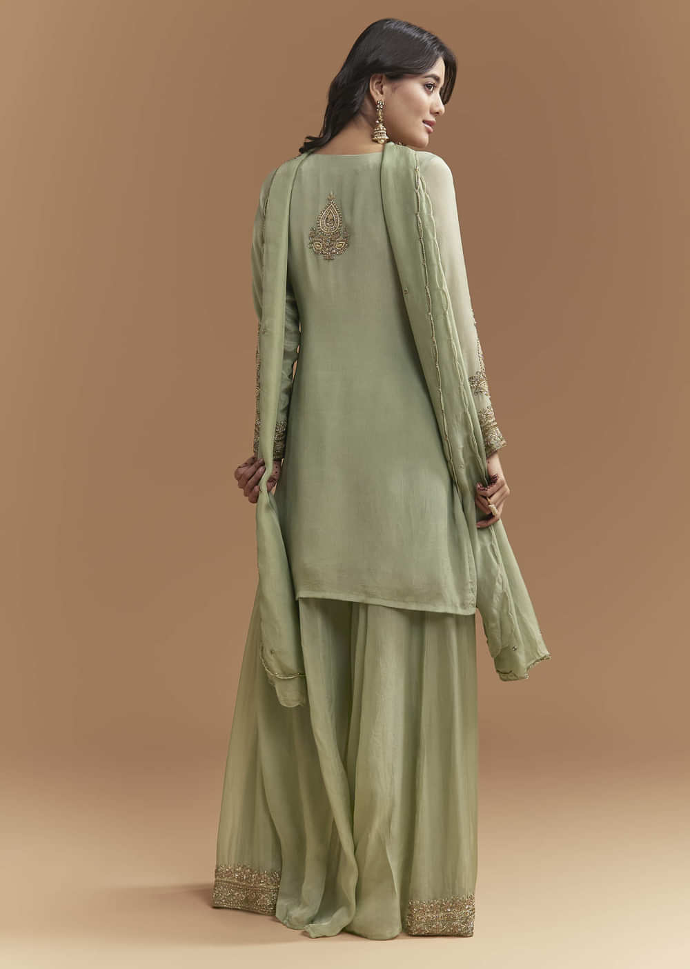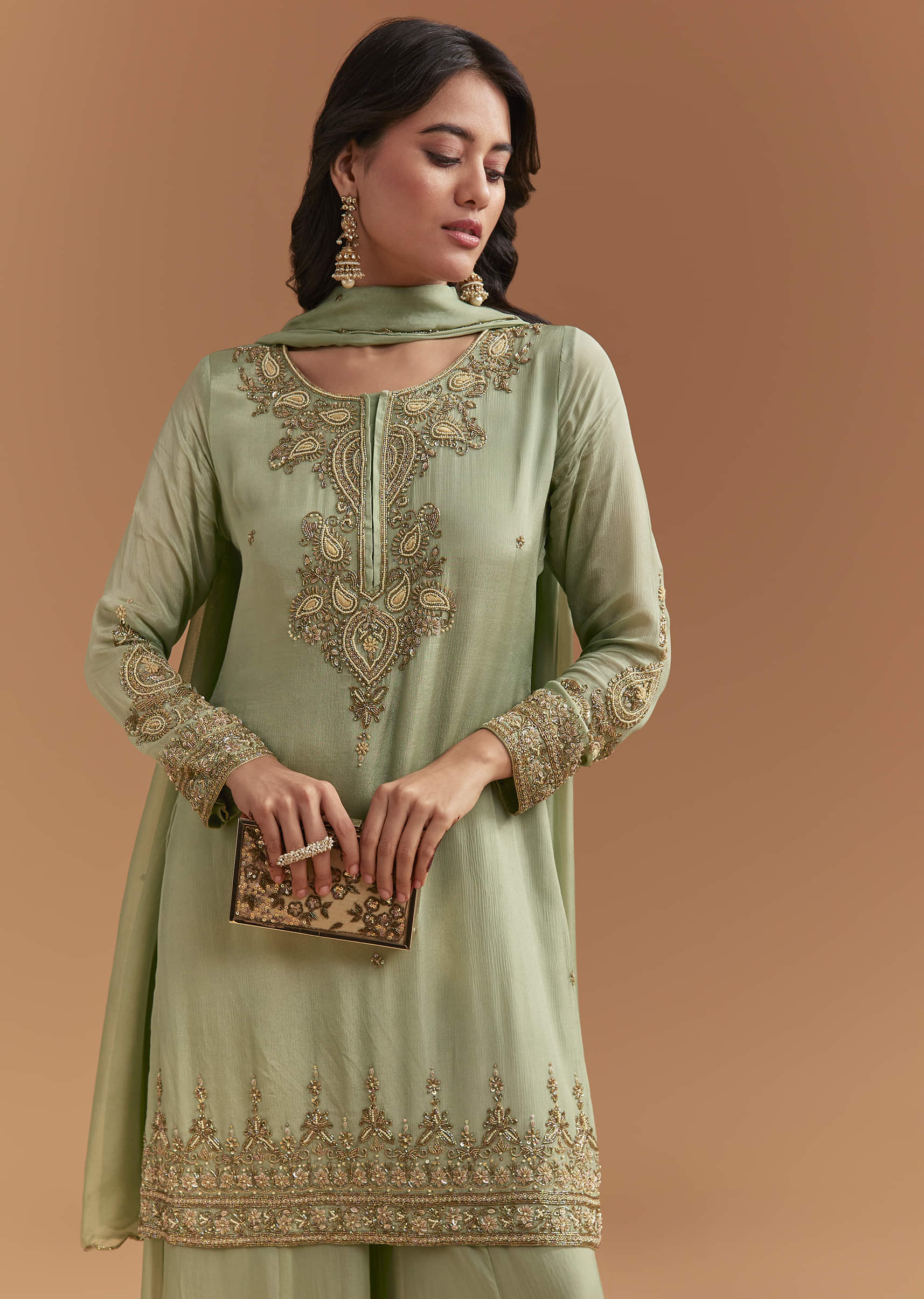 Green Chinon Palazzo Suit With Moti And Cutdana Embroidery