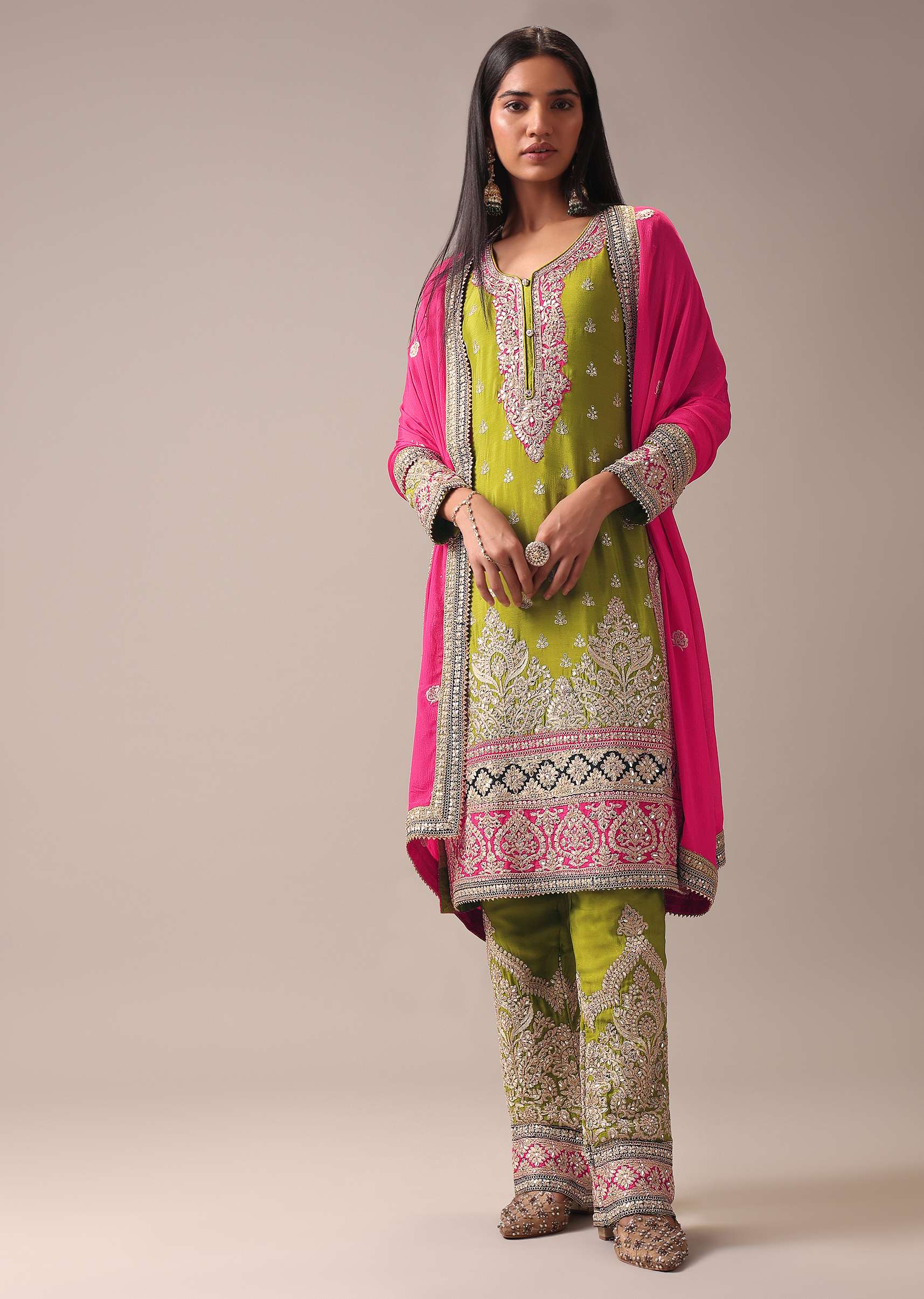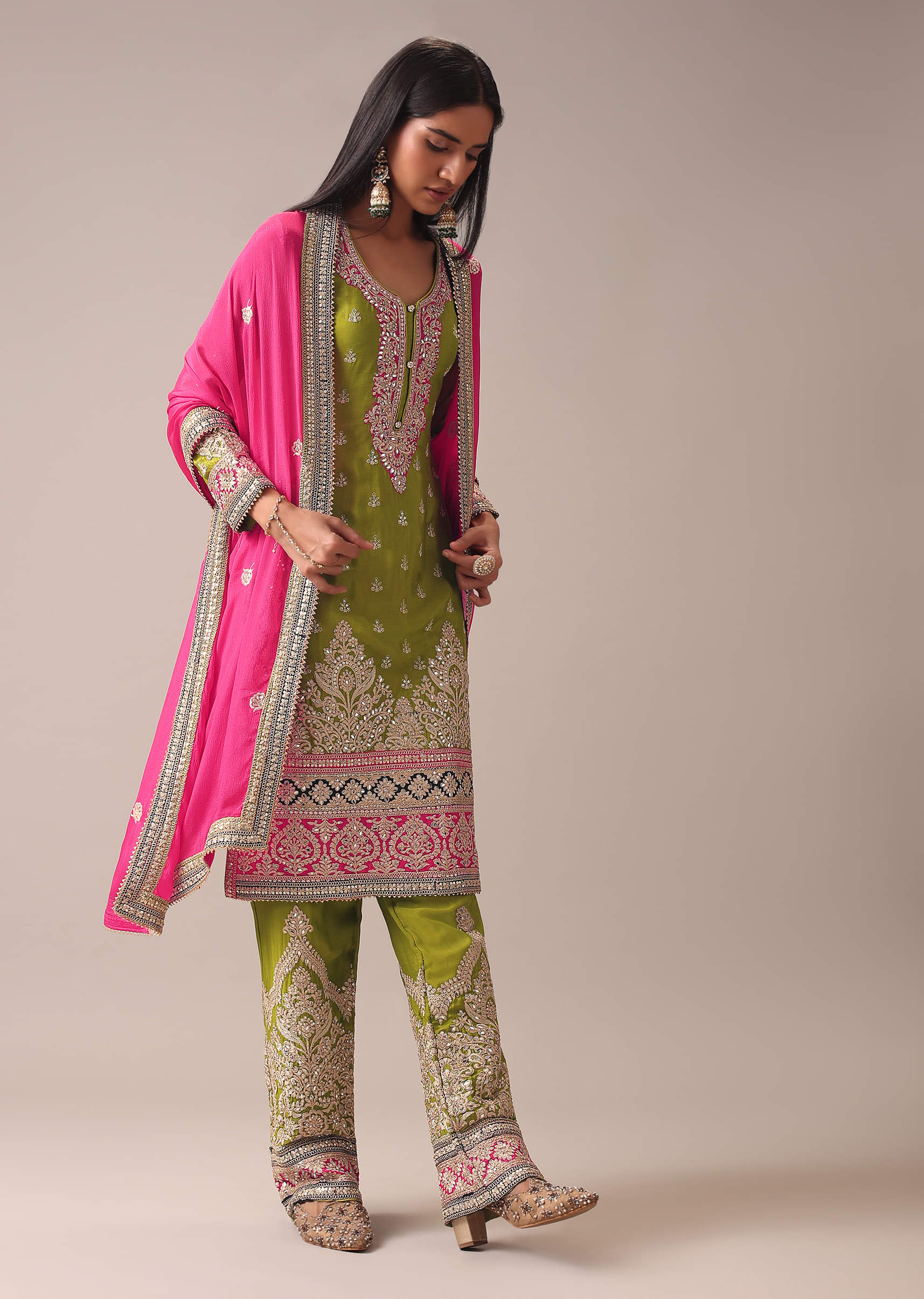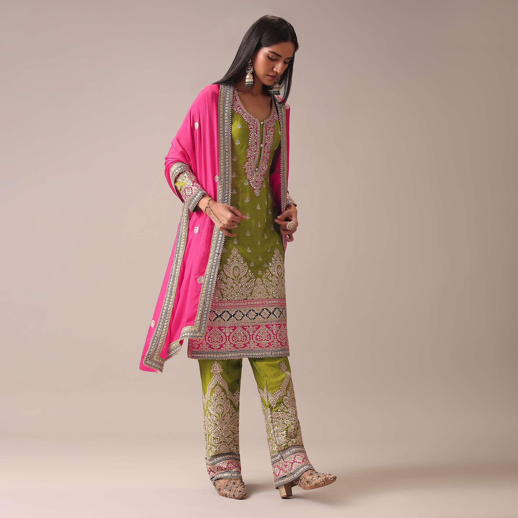 Introducing our Mehendi Green Color Blocking Pant Suit. Made from light chinon fabric it's adorned with Zari Sequins Mirror and Stone work for a touch of sparkle. With 3/4th sleeves... More Product Details