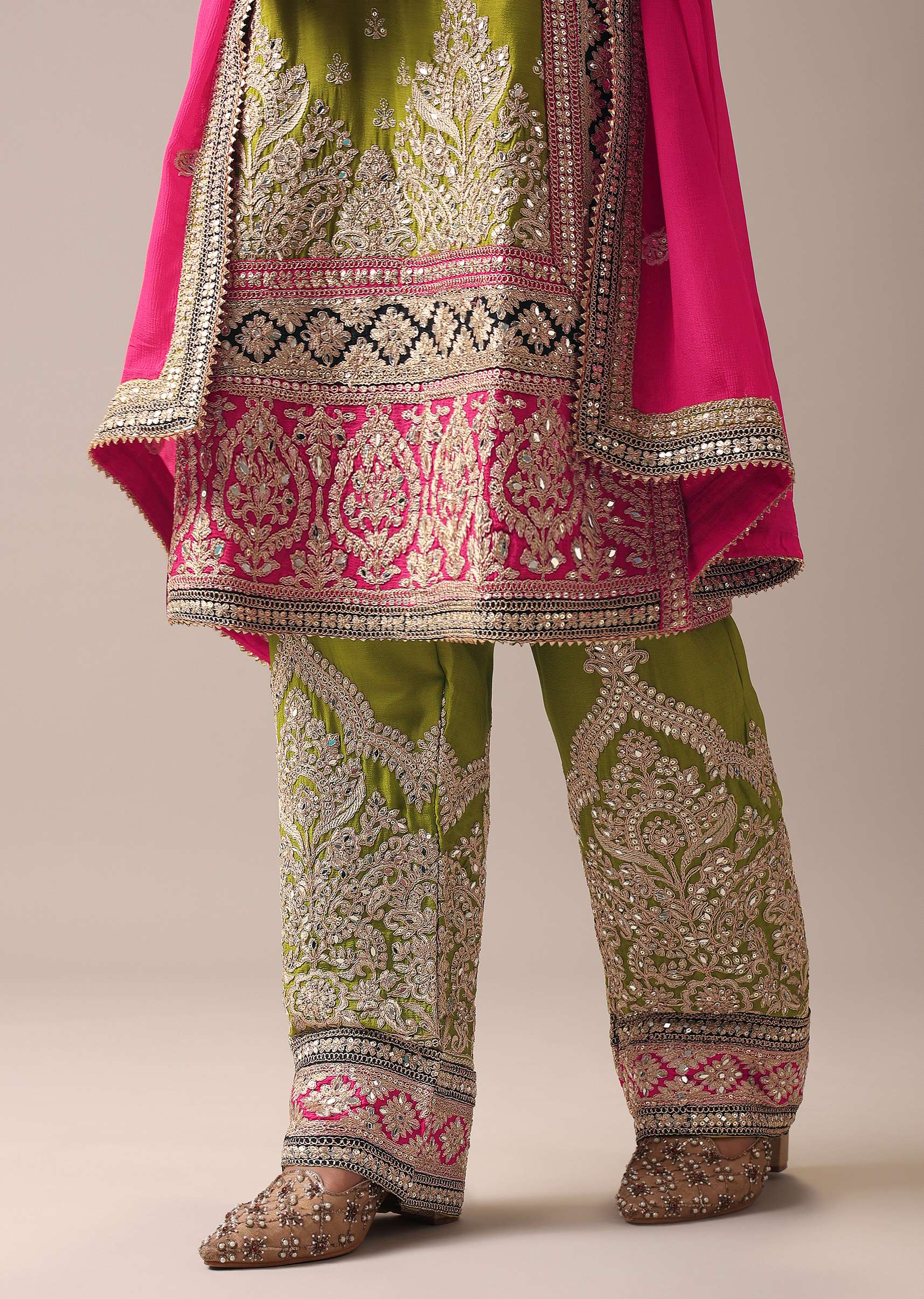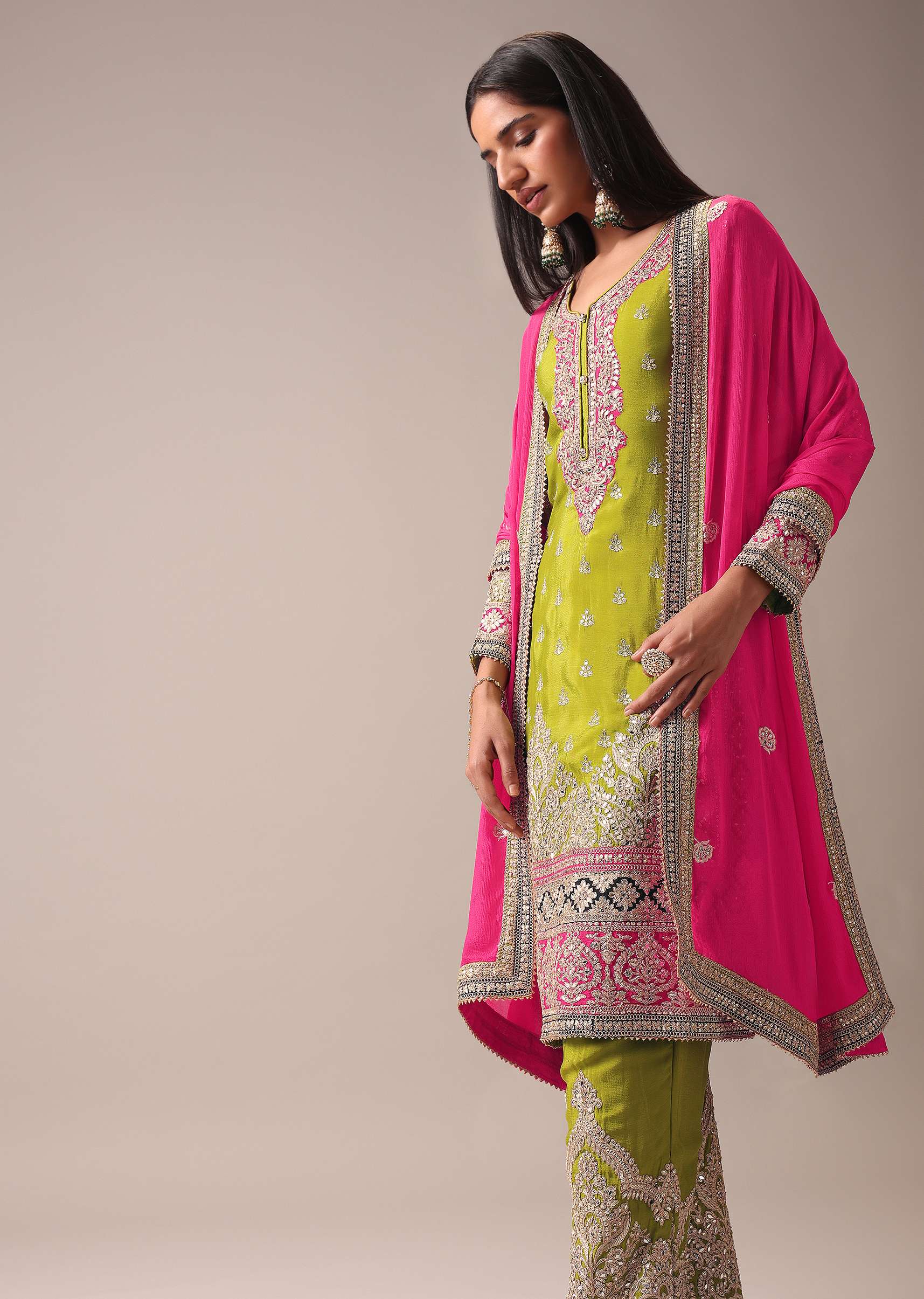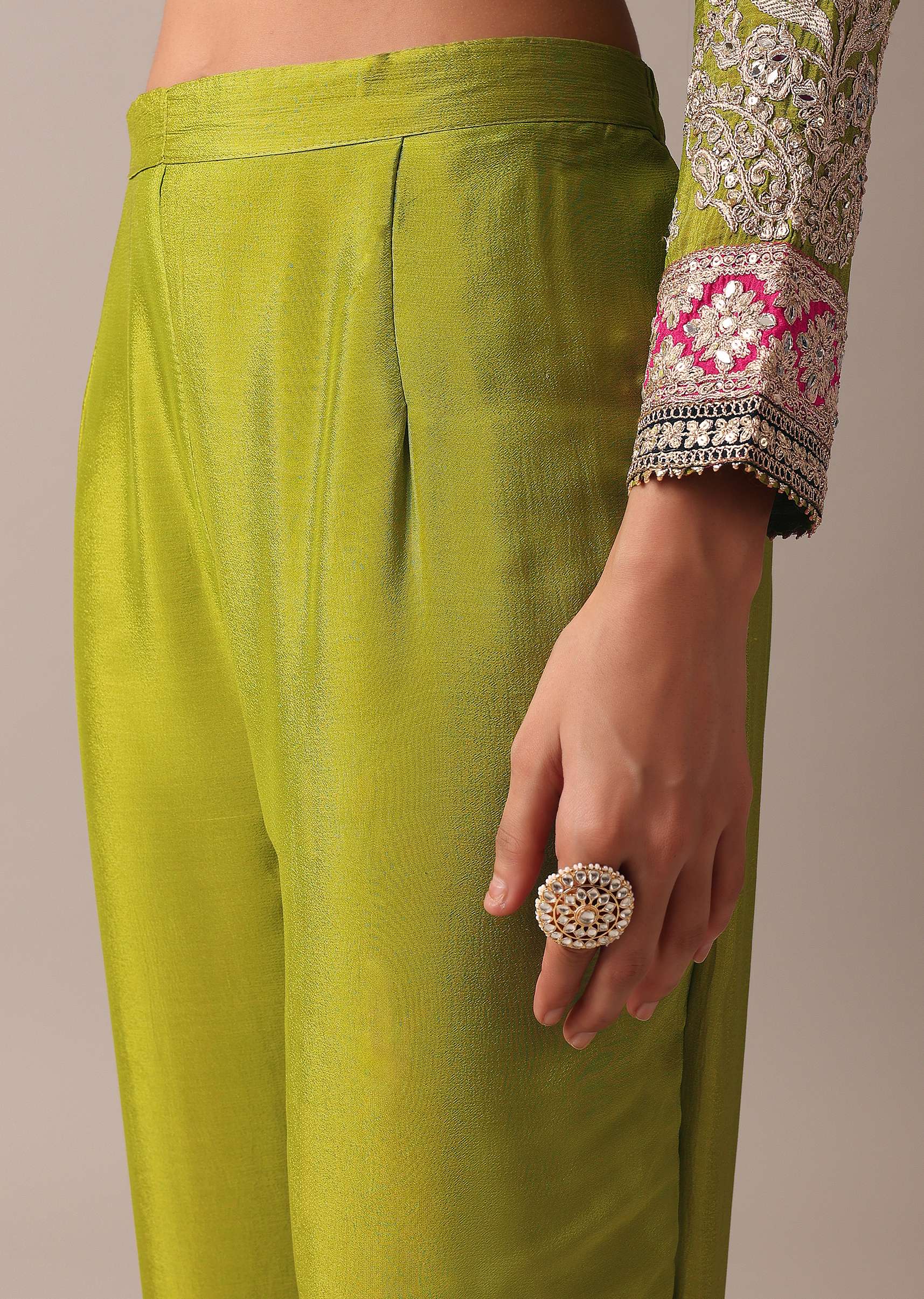 Introducing our Mehendi Green Color Blocking Pant Suit. Made from light chinon fabric it's adorned with Zari Sequins Mirror and Stone work for a touch of sparkle. With 3/4th sleeves... More Product Details