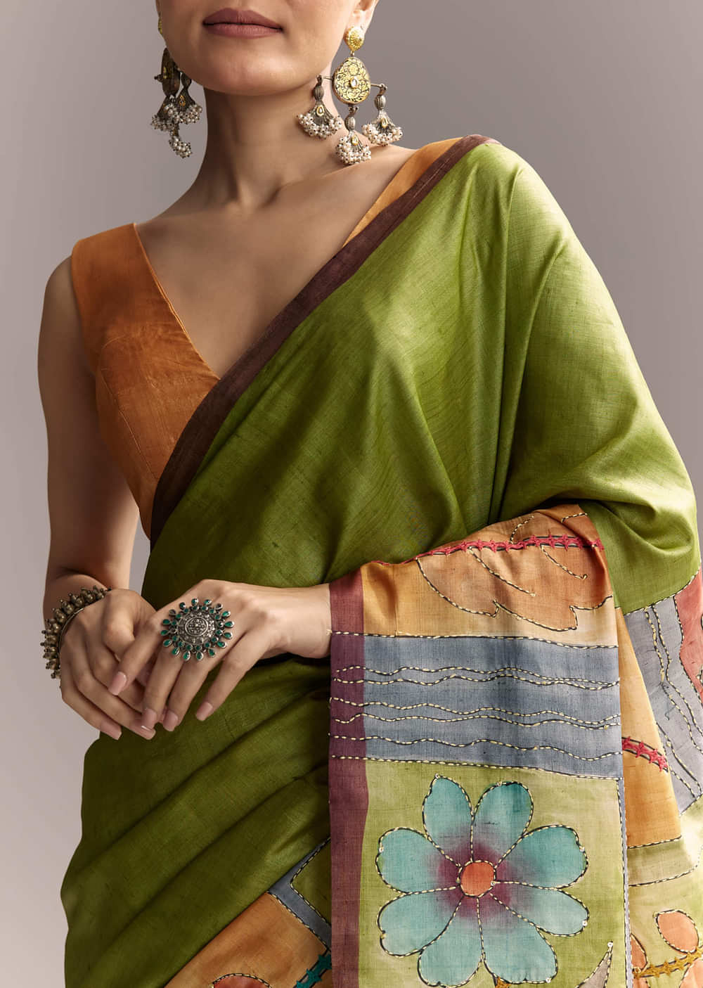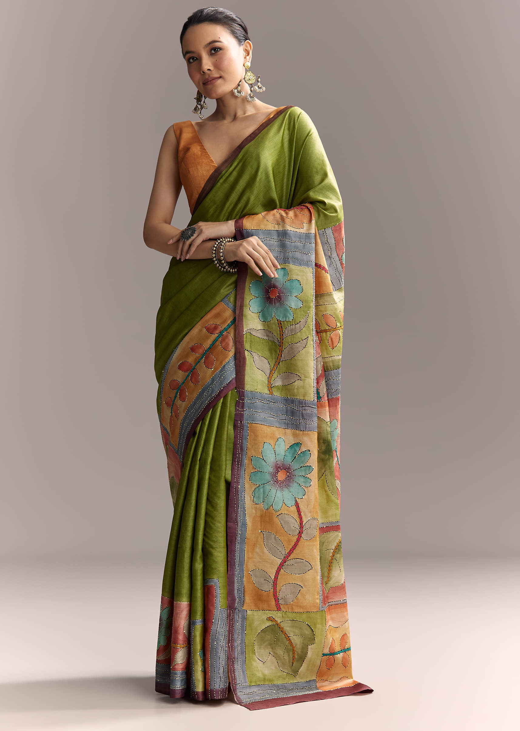 Floral artistry shines through on this green cotton saree detailed with authentic hand painted motifs and finished with Kantha work. A contrast border adds balance to the design while keeping... More Product Details