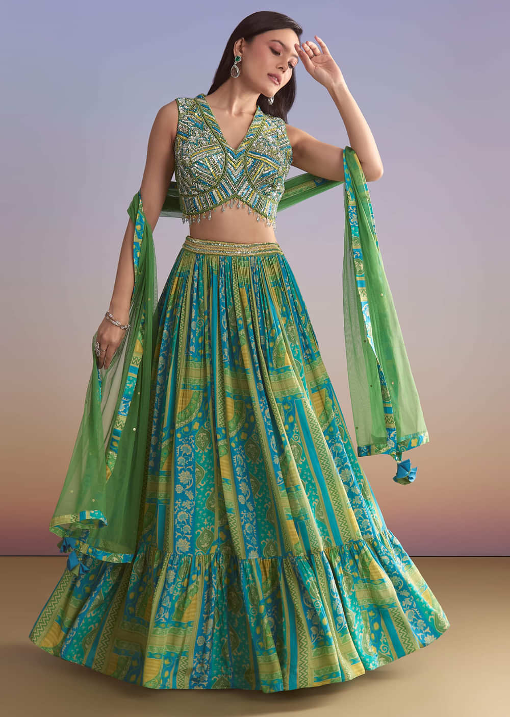 Green Crepe Bridesmaid Lehenga With Paisley Print