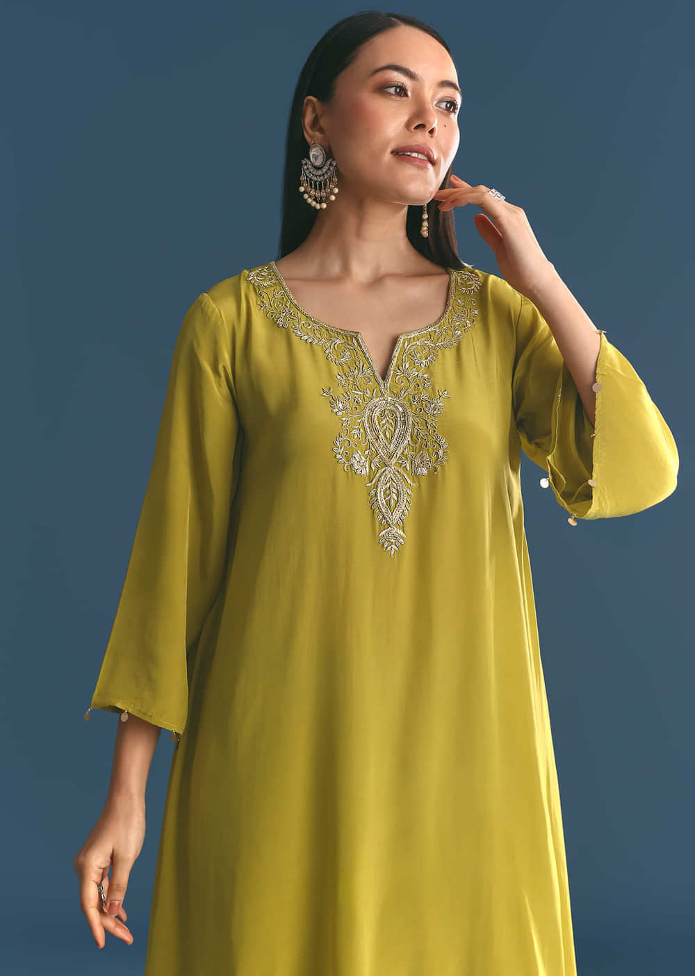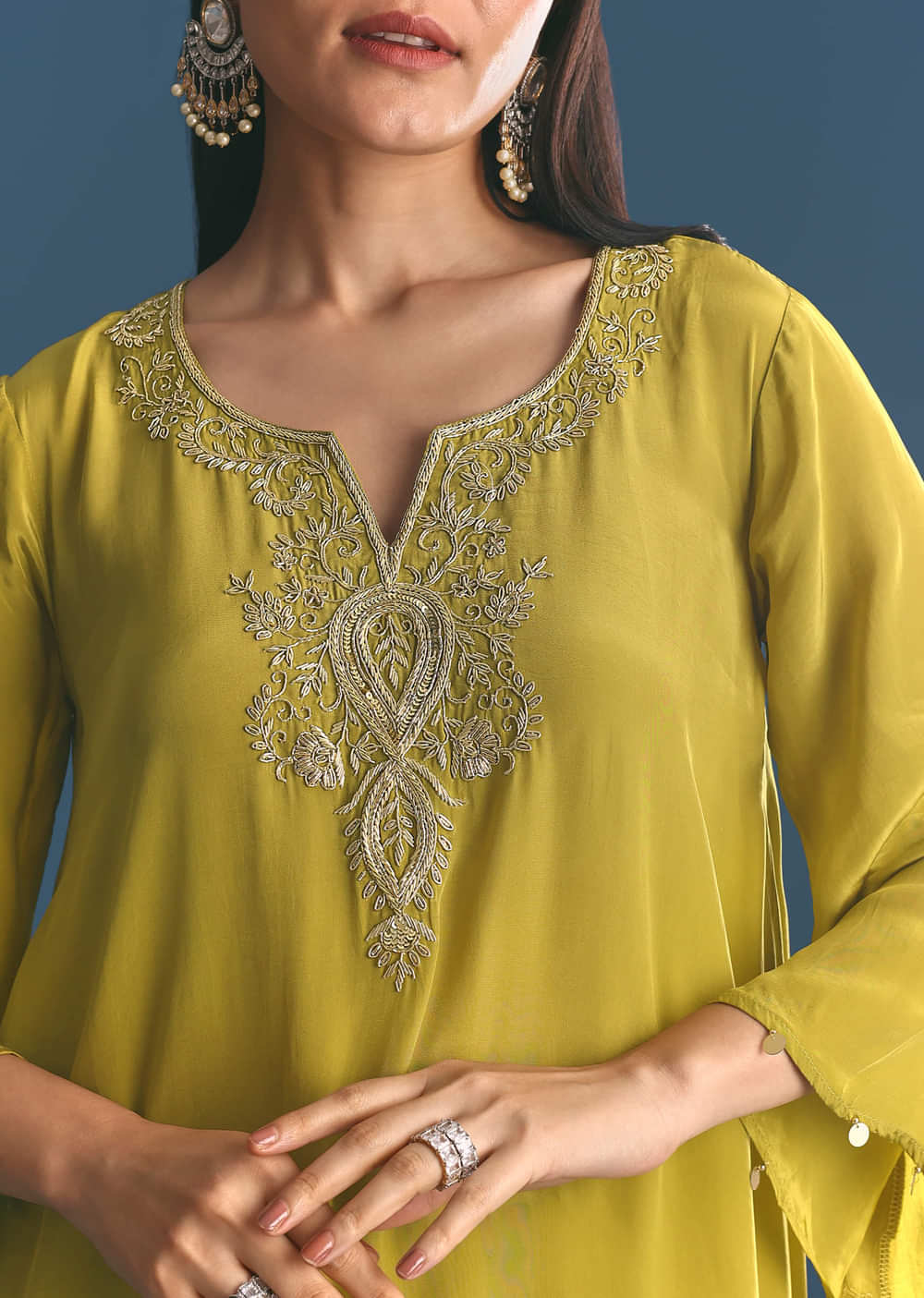 This crepe kurta in deep green features asymmetrical cuts and detailed zardosi embroidery. Sophisticated and artistic, it is tailored for pooja and ceremonial events. Awarded as the Most Trusted Brand,... More Product Details