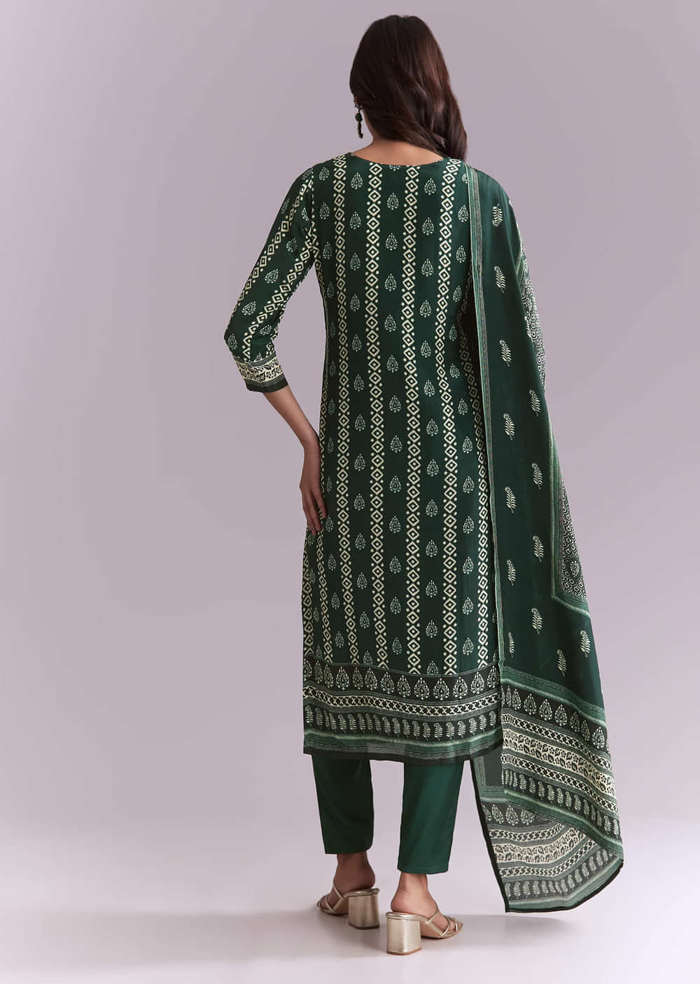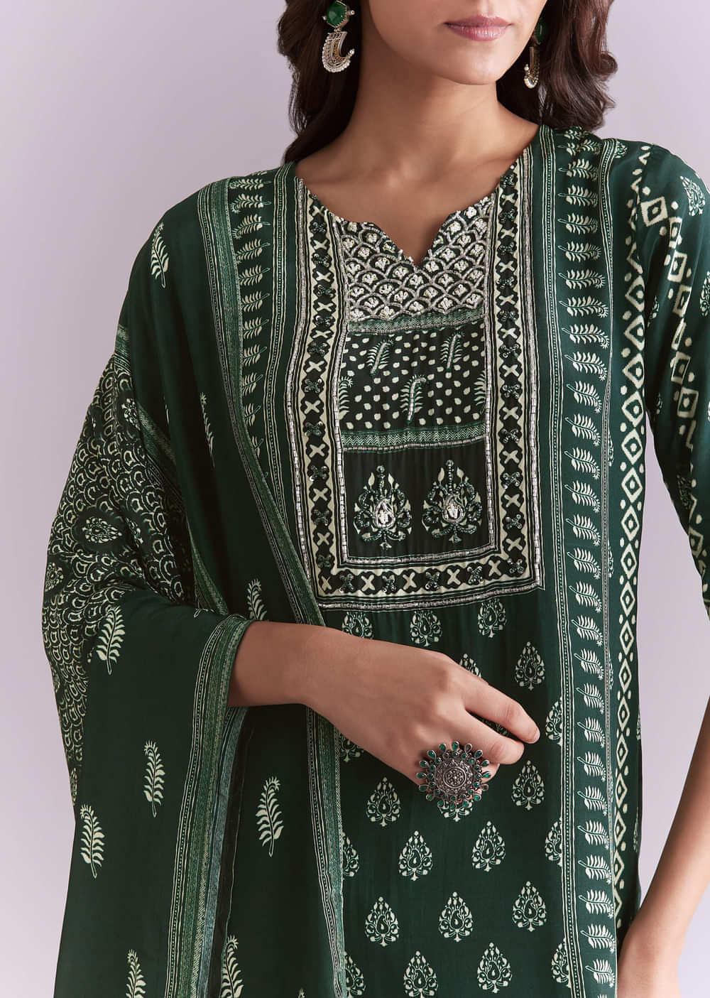 Green Crepe Kurta Set With Indie Print And Moti Detail