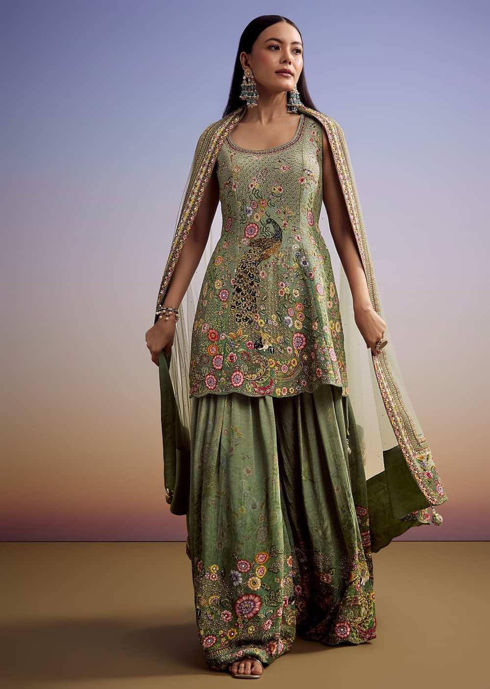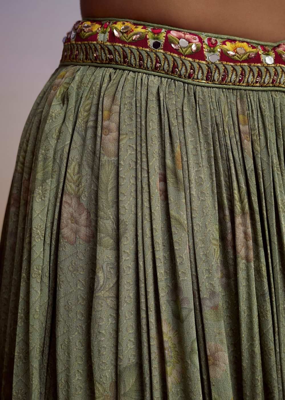 Green Crepe Palazzo Suit With Floral Print And Stone Work