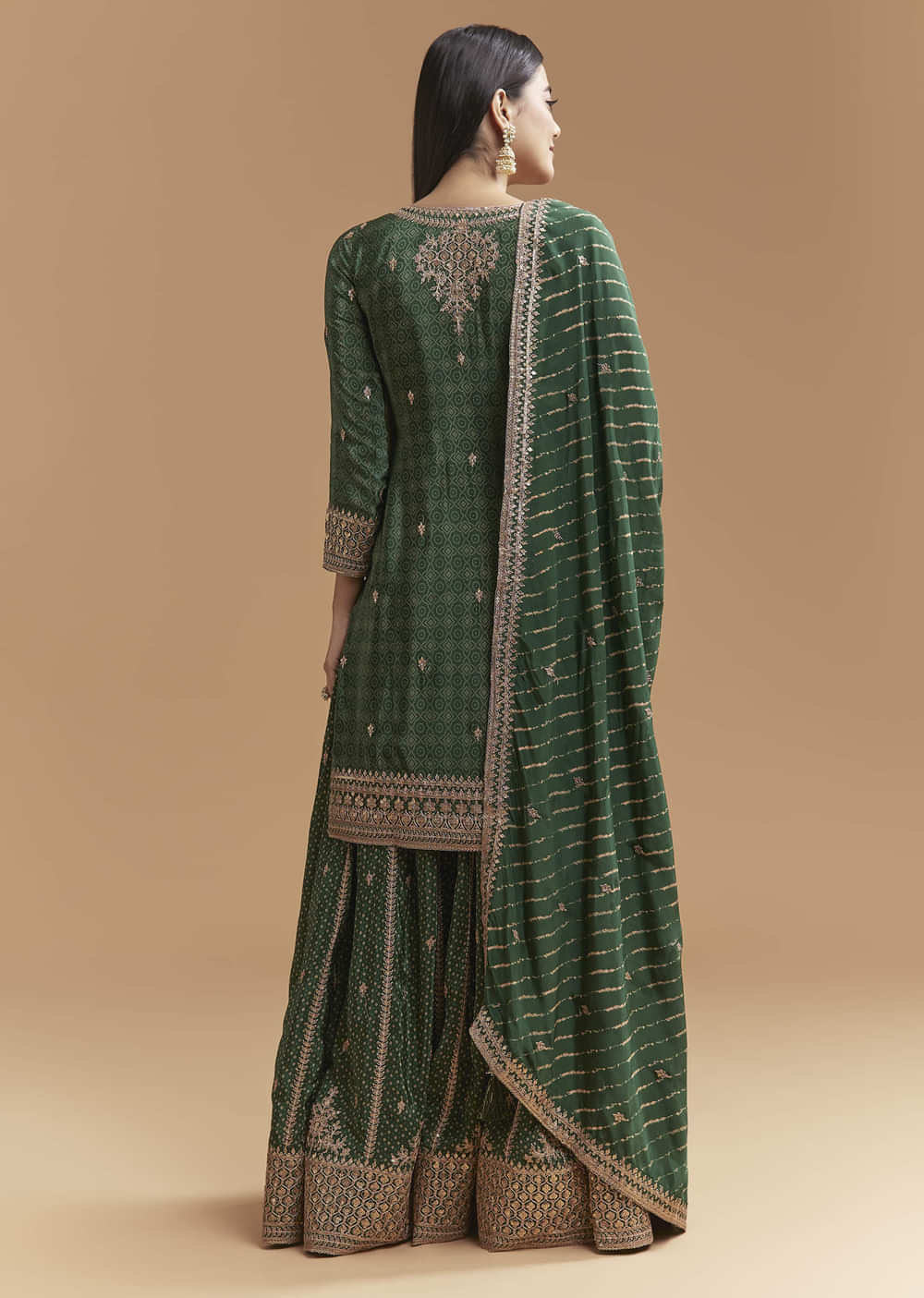 Built for long celebrations, this green crepe palazzo suit combines breathable drape with a playful bandhani accent. Zari and sequins on the kurta add refined shine that stays comfortable for... More Product Details