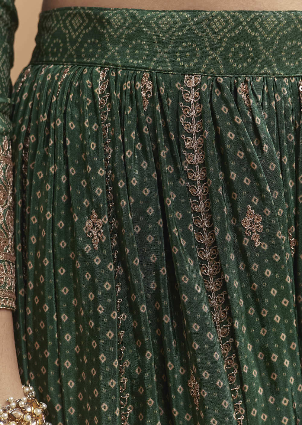 Green Crepe Palazzo Suit With Hand Embroidery And Bandhani Print