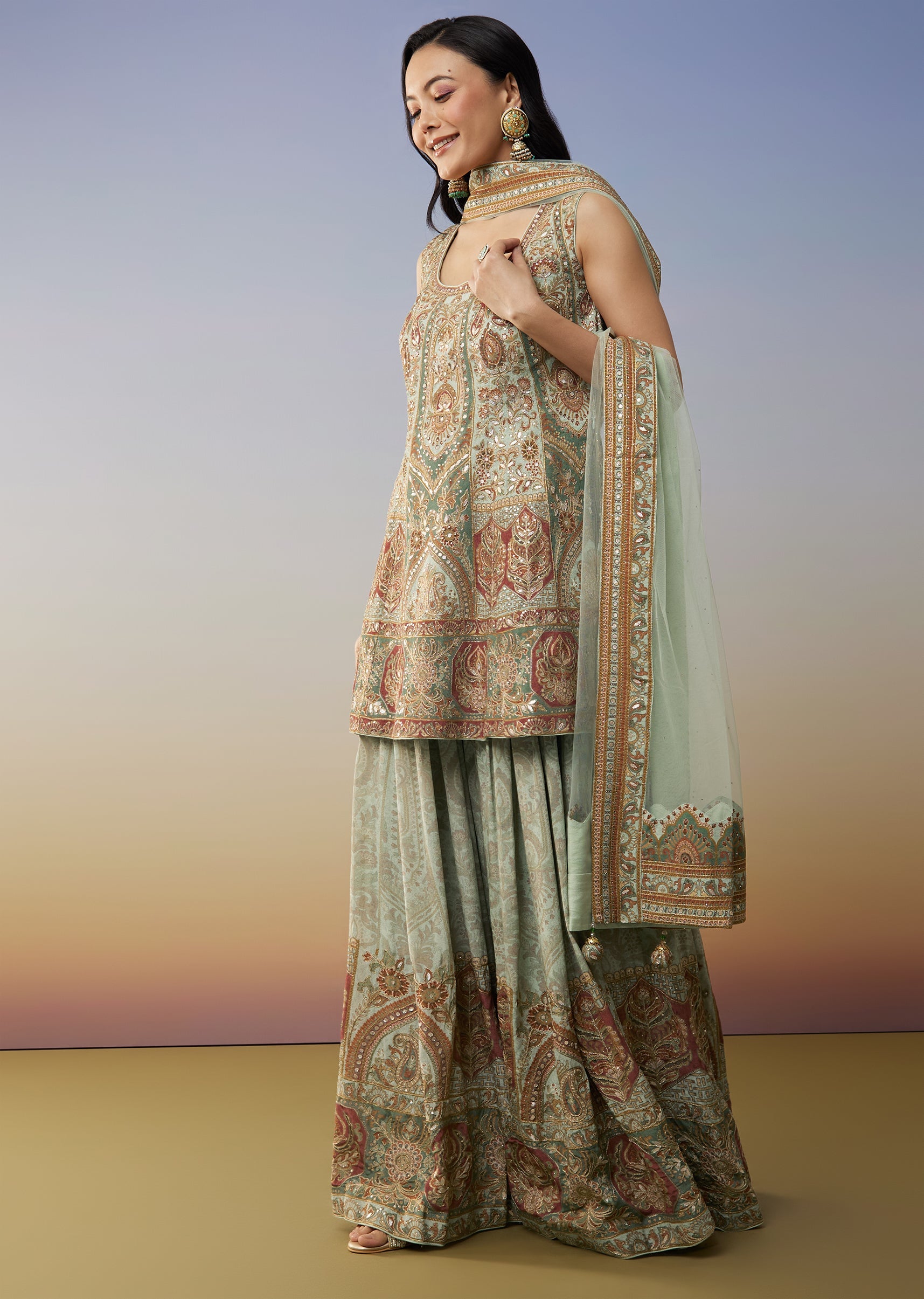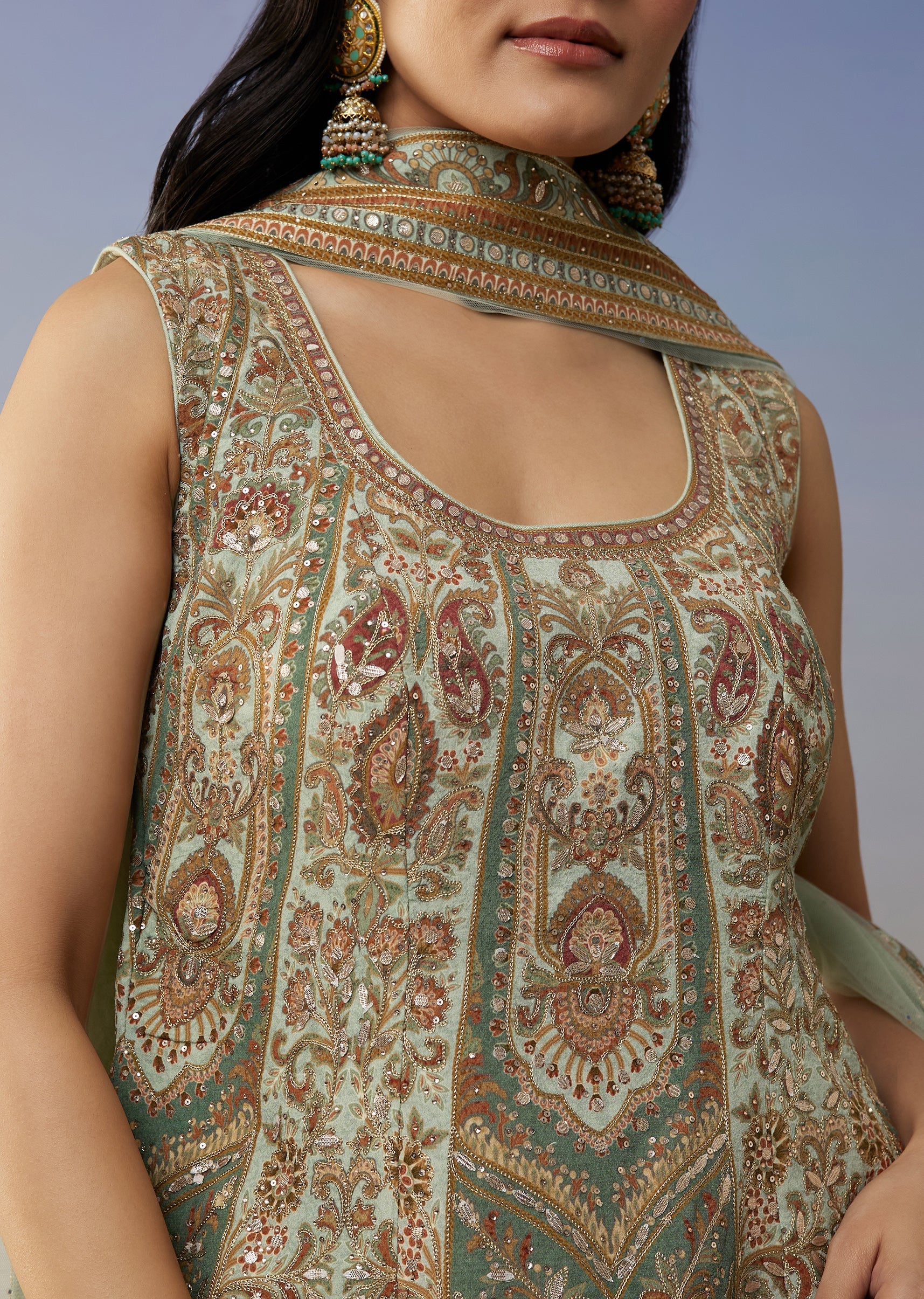 This green palazzo suit set brings a soft pastel charm perfect for mehendi sangeet and wedding celebrations. Designed in a straight silhouette with a coordinating dupatta it features a forty... More Product Details