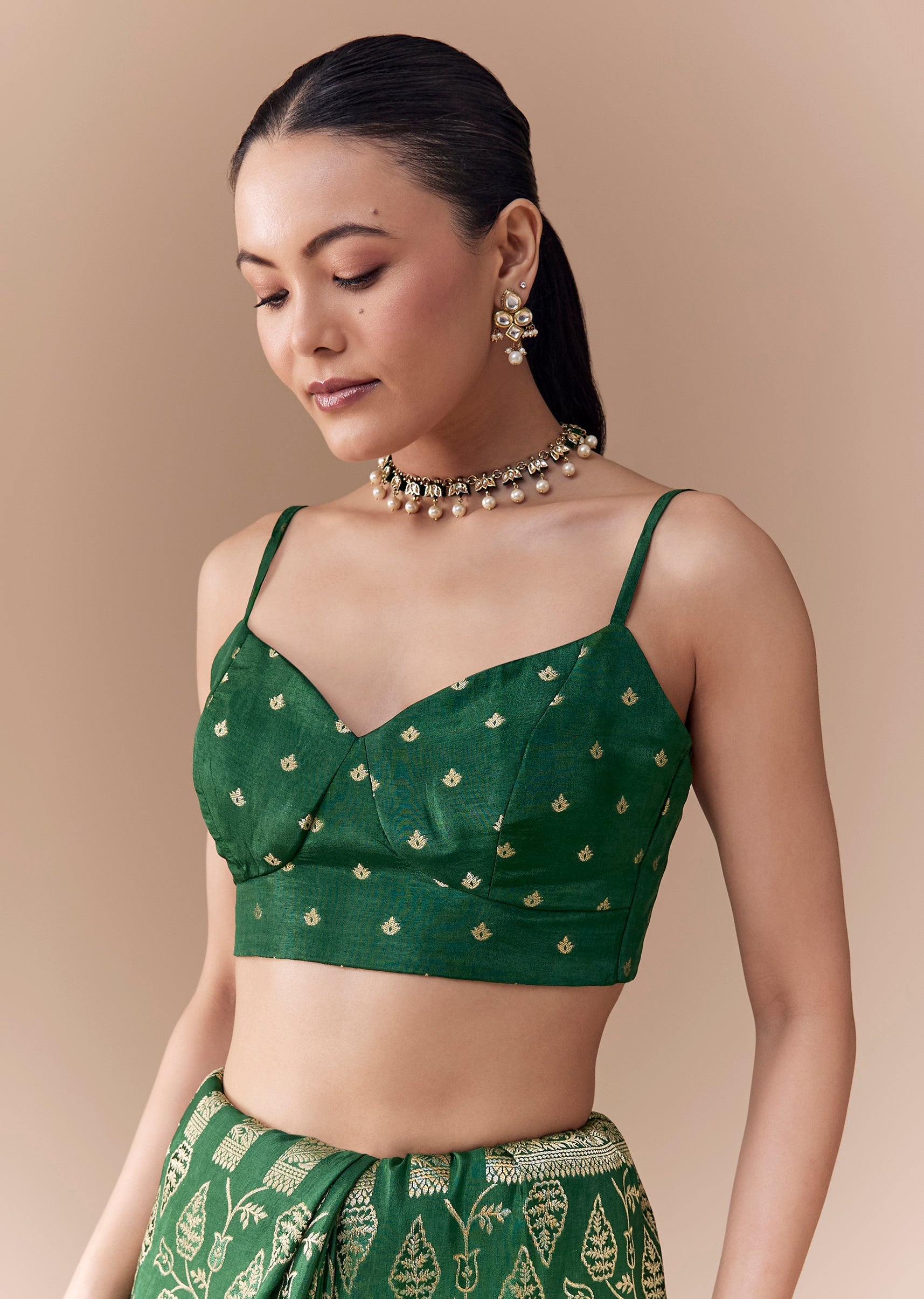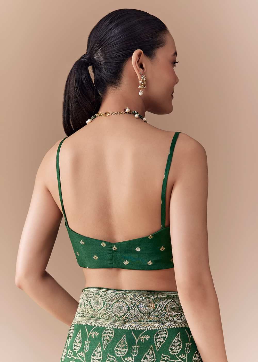 Step into classic elegance with this green dola silk saree, featuring an intricately woven jaal pattern all over and complemented by a beautifully crafted floral border and pallu. The rich... More Product Details