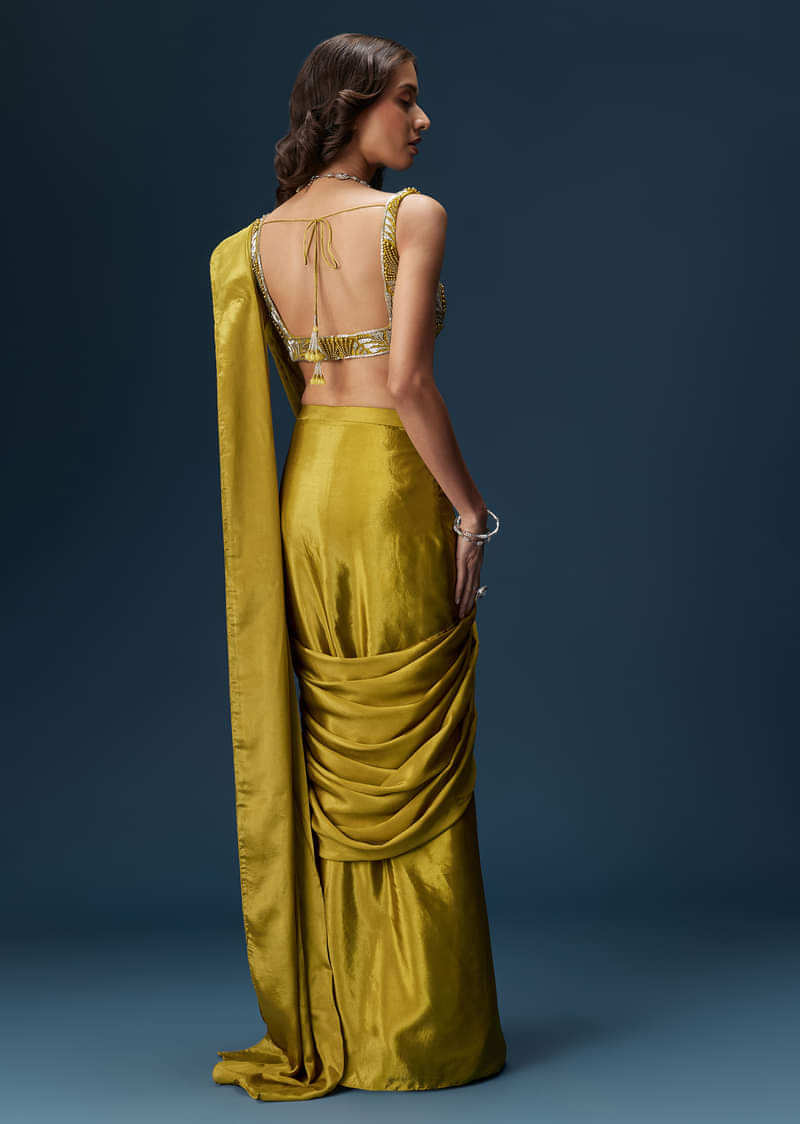 A contemporary crepe saree in vibrant green, pre-draped for ease and paired with a net V-neck blouse highlighted with moti and zardosi embroidery. Finished with a belt for added structure.... More Product Details