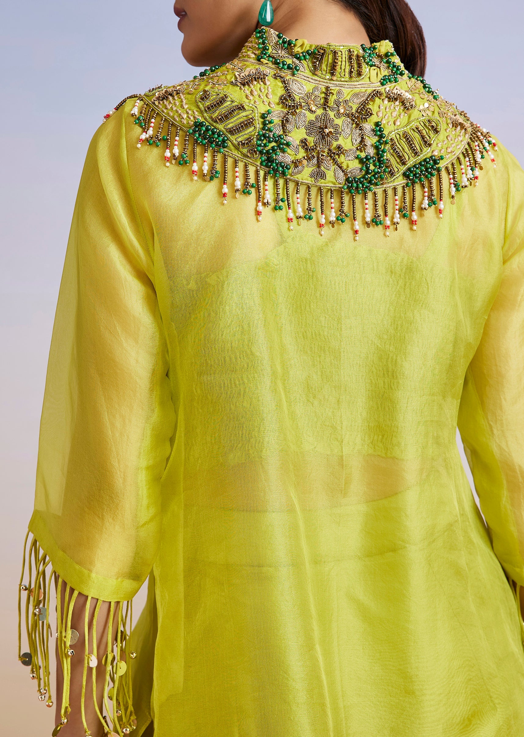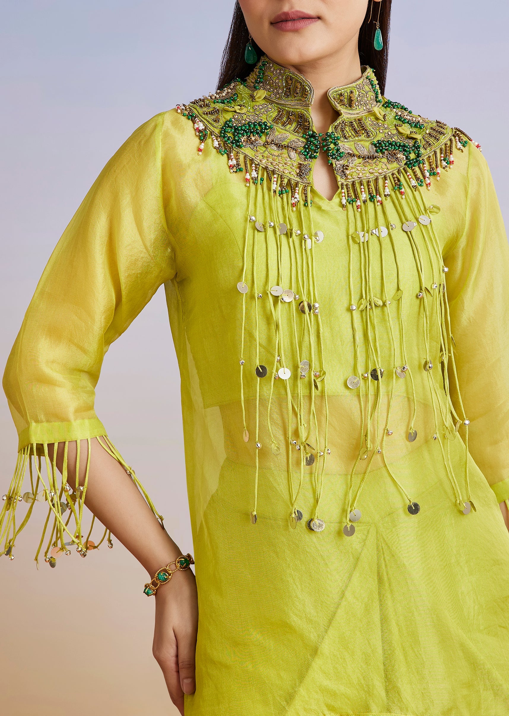 Green Embellished Organza Crop Top Skirt Set With Overlay