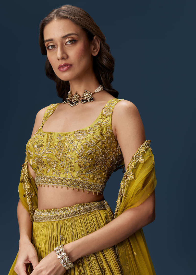 A structured sleeveless blouse in a striking green hue pairs with a classic lehenga and tasseled dupatta. Finished with all-over embroidery, this look works beautifully for bridesmaids at day functions.... More Product Details