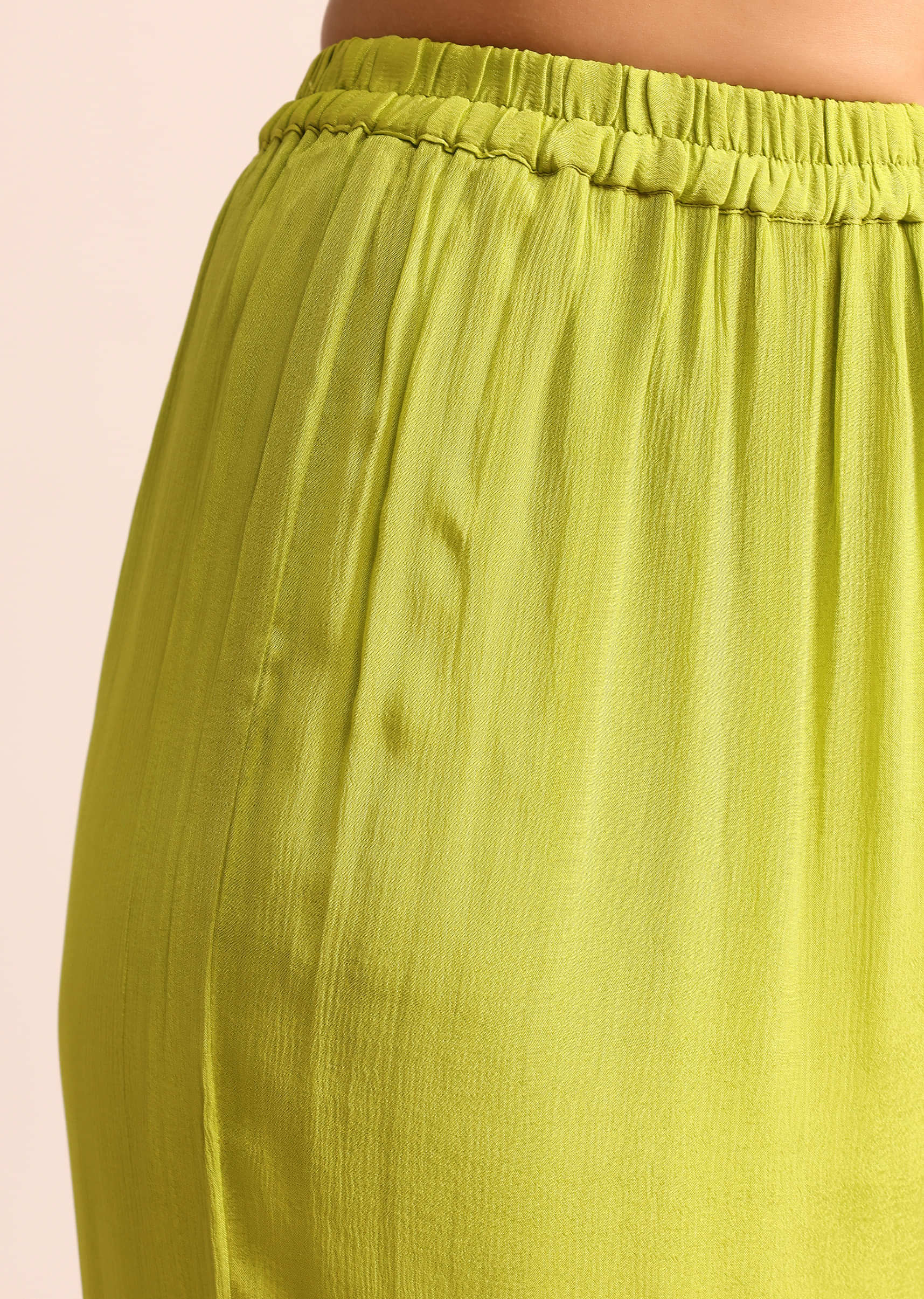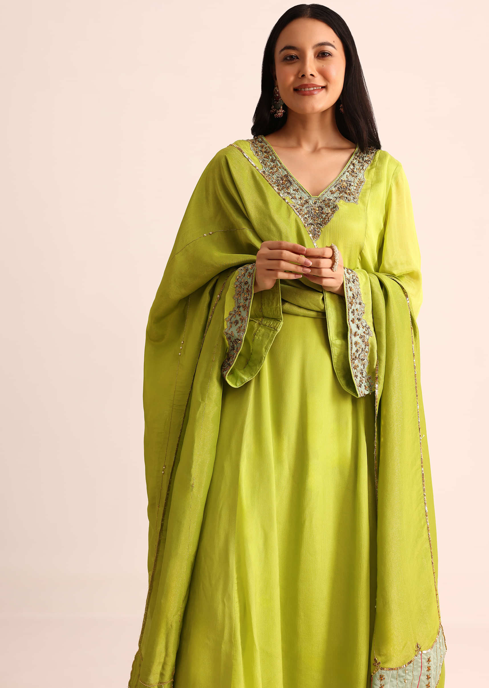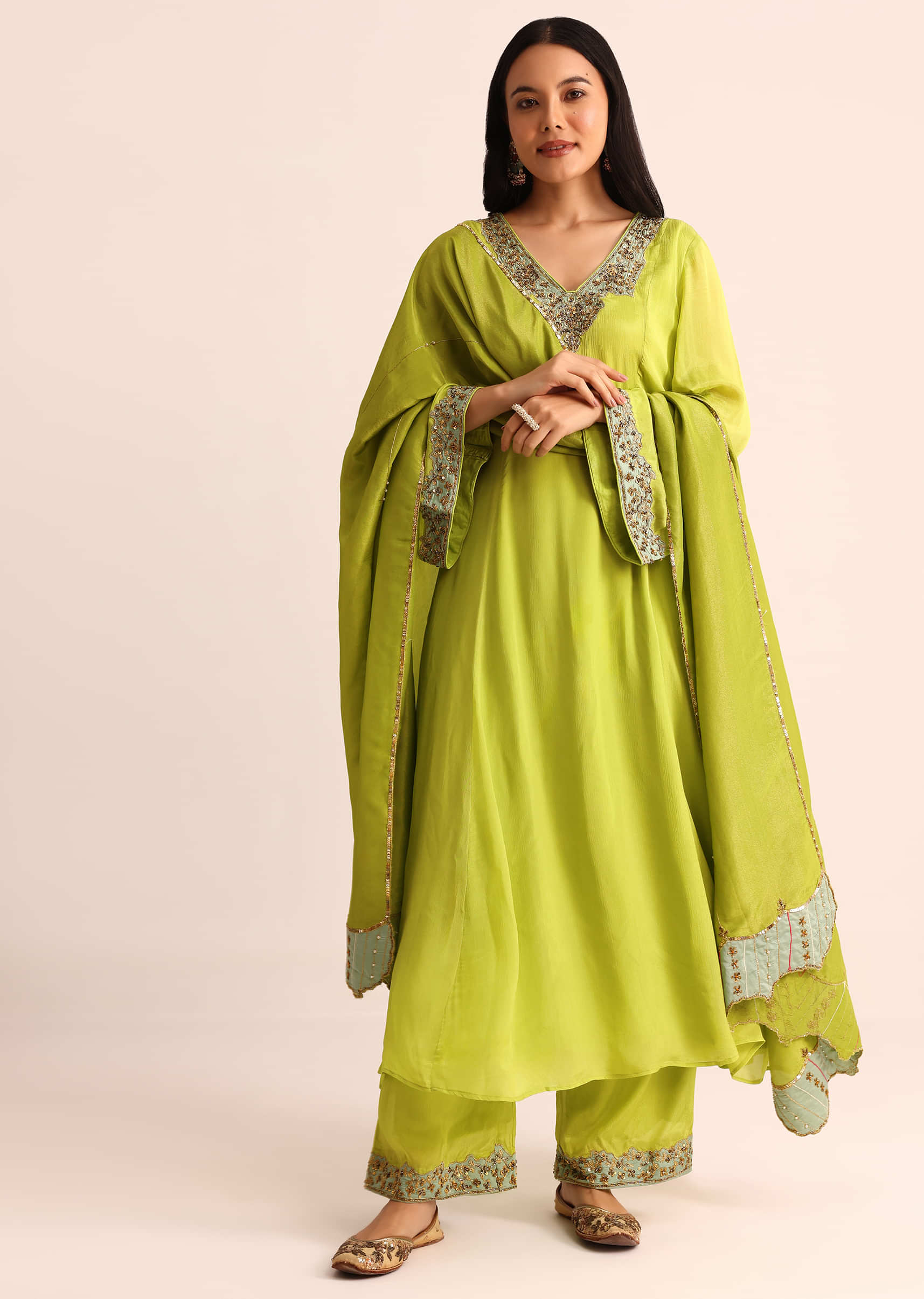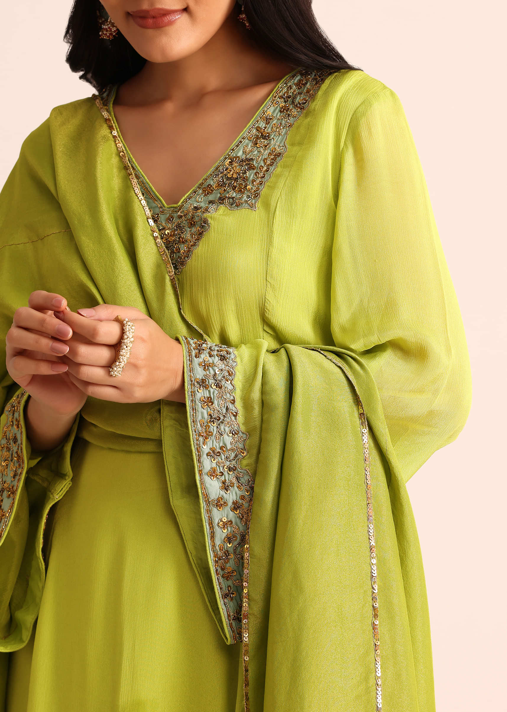 Elevate your festive charm in this green chiffon kurta palazzo set. Adorned with shimmering zari cutdana and sequins the umbrella style kurta boasts a dazzling neckline while the flared sleeves... More Product Details