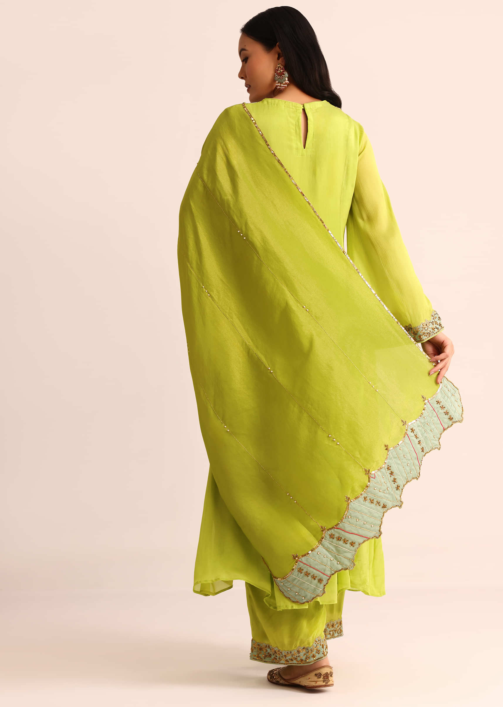 Green Embroidered Chiffon Kurta Palazzo With Dupatta