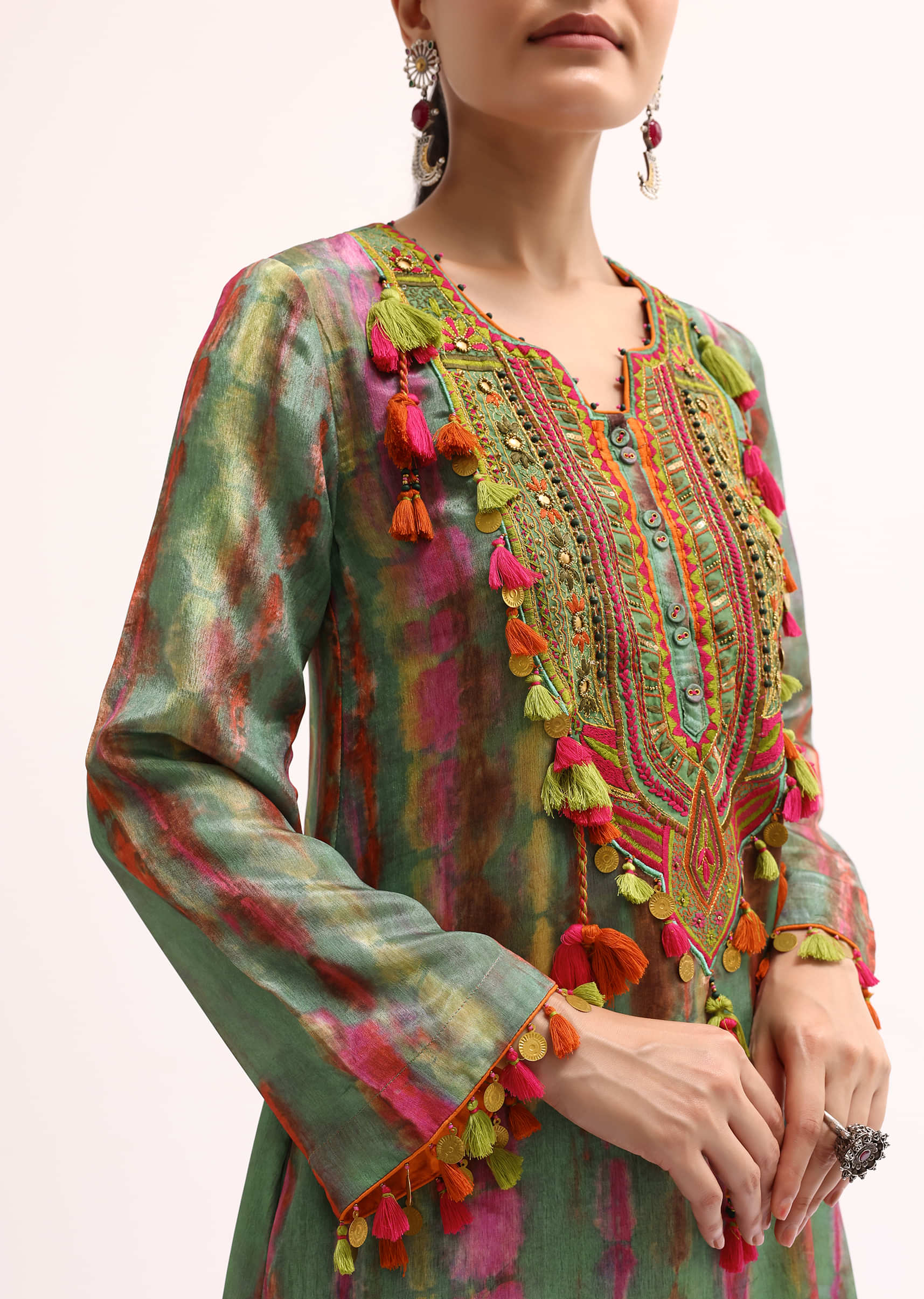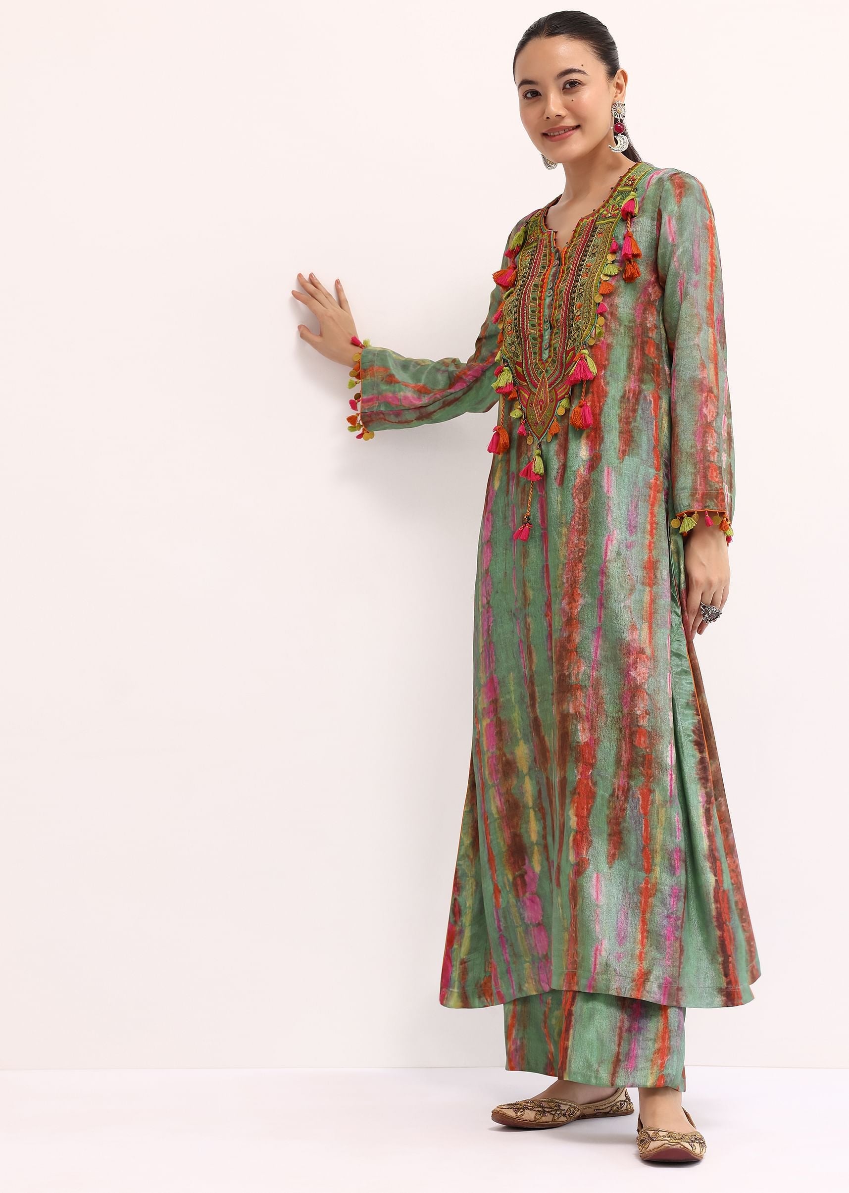 Experience the enduring allure of our green kurta pant meticulously crafted for festive occasions and celebratory moments. This ensemble is tailored from crepe fabric and adorned with exquisite prints resham work beads sequins and tassels. The kurta is paired with pants for a complete and stunning look. Awarded as the Most Trusted Brand, we're delivering styles you love, just as promised.