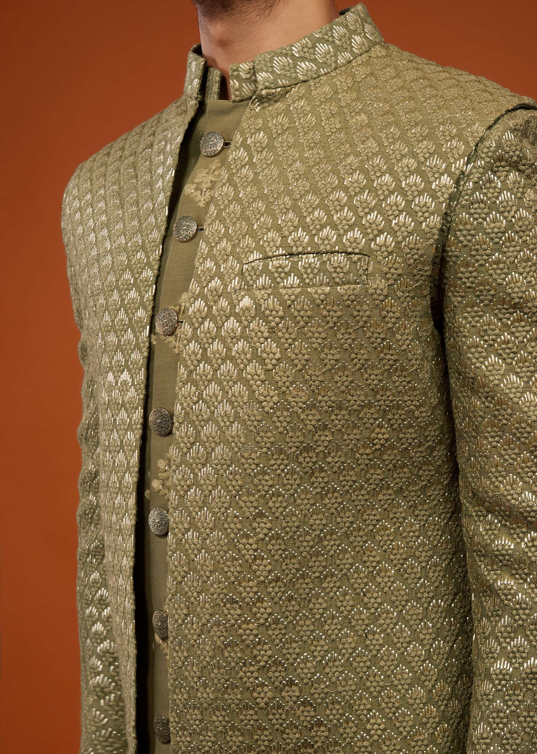 Moss Green Embroidered Indo-Western Sherwani Set In Tussar Silk