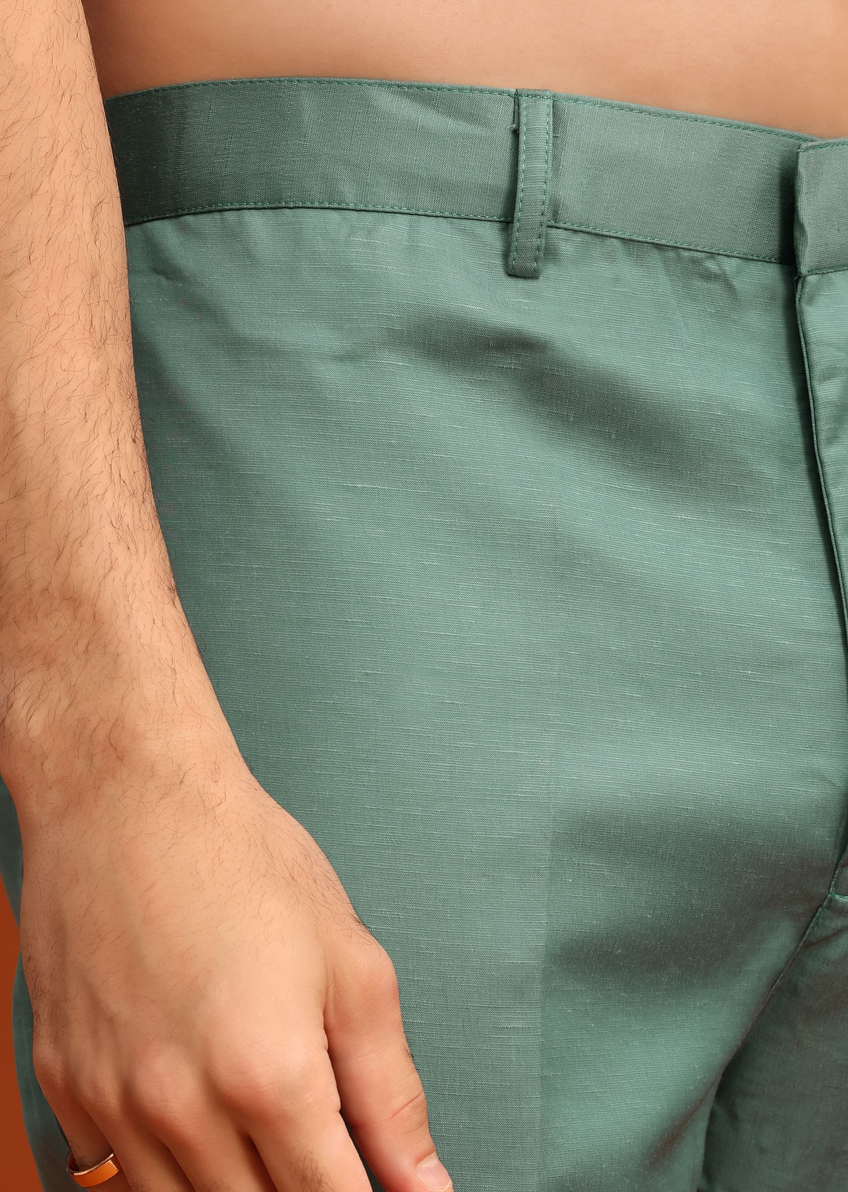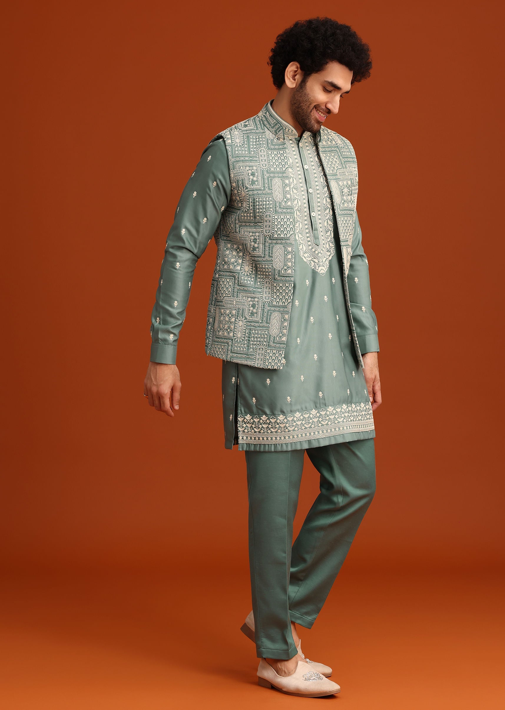 Green Embroidered Jacket Kurta Set In Linen Satin